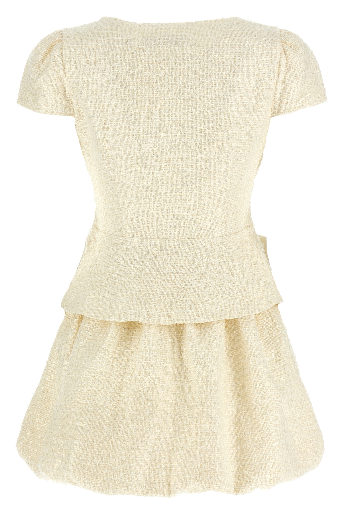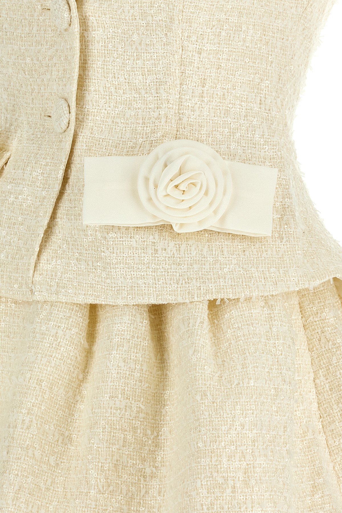 'Cream Boucle Bow Detail Mini' dress in boucle fabric with sequins, consisting of blazer with button closure, pockets with satin flower applique, short sleeves and fluffy skirt with curls, back zip closure.
