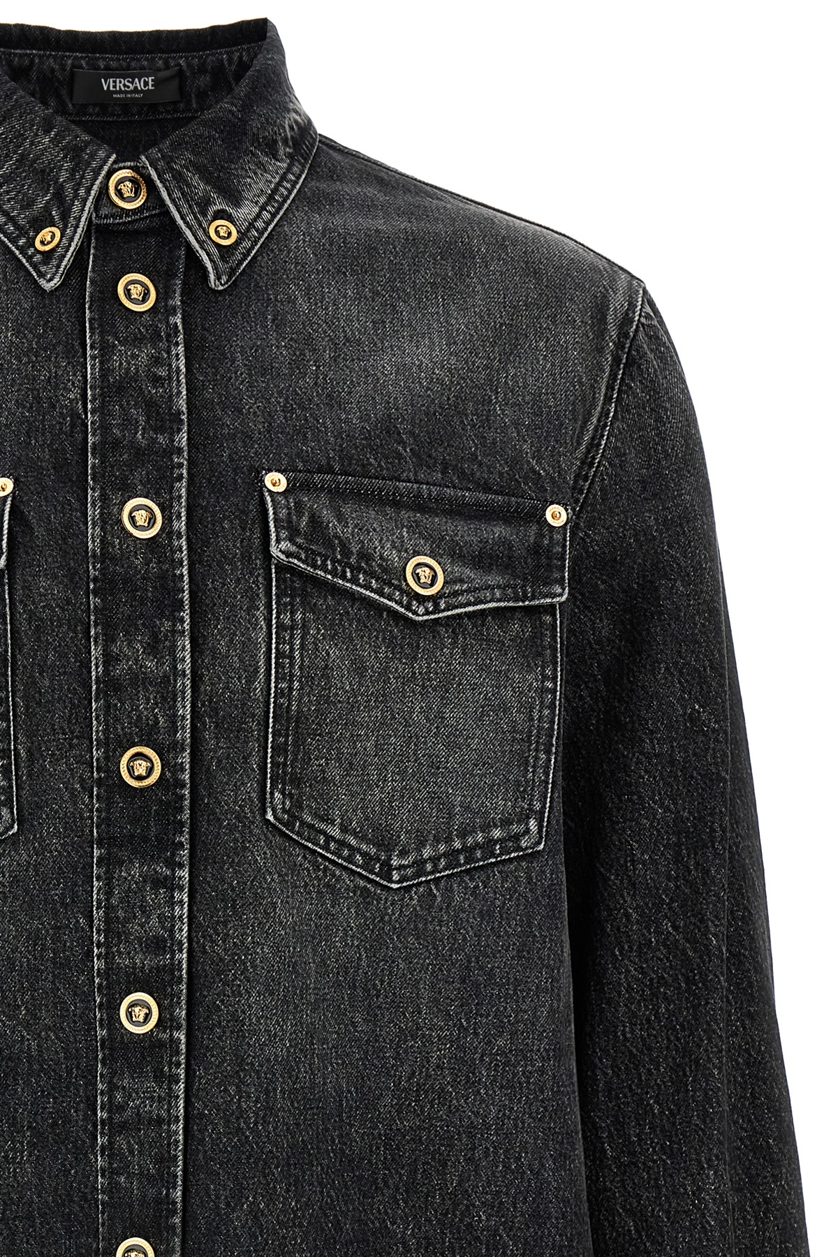 Stonewash cotton denim shirt, button down model, 'Medusa' snap button closure, pockets, long cuffed sleeves.