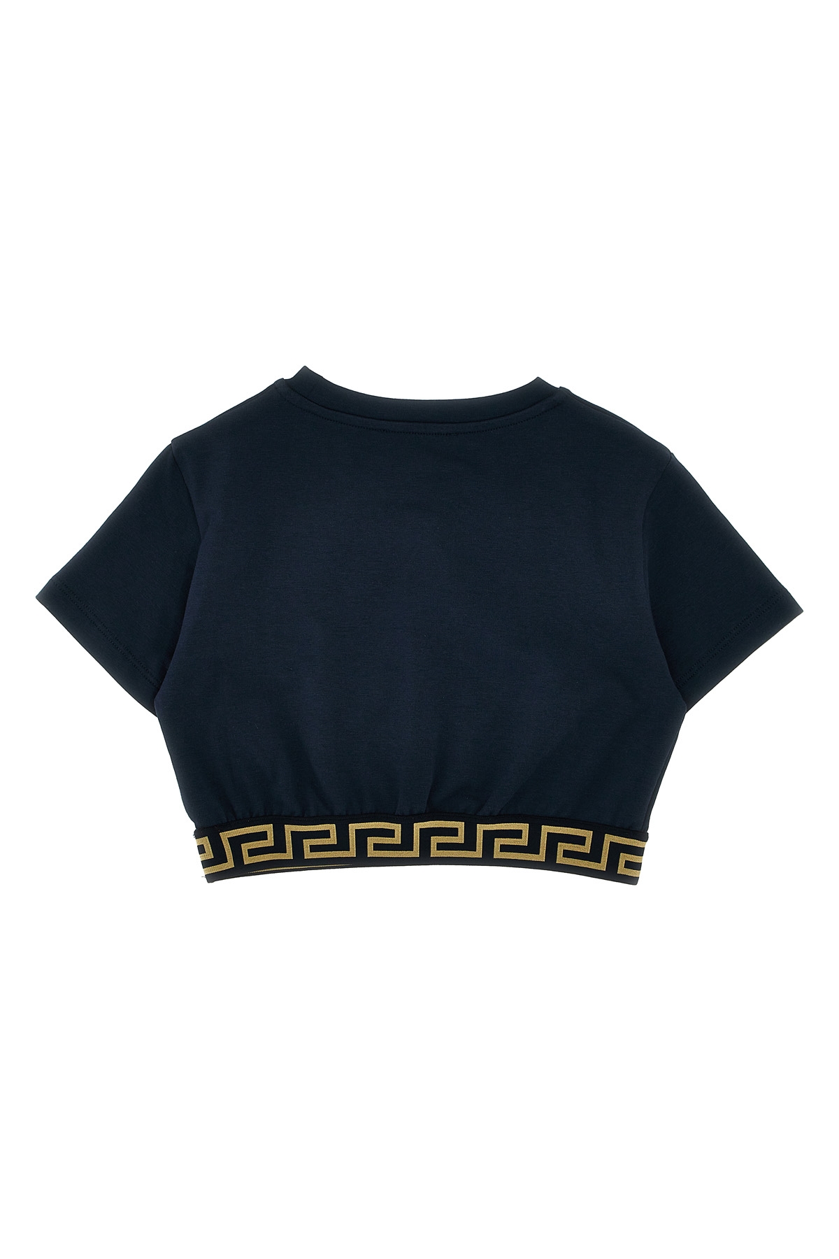 KIDS Cotton T-shirt, embroidered 'Medusa' on the front, crop model with elastic with Greek jacquard at the waist, and short sleeves.