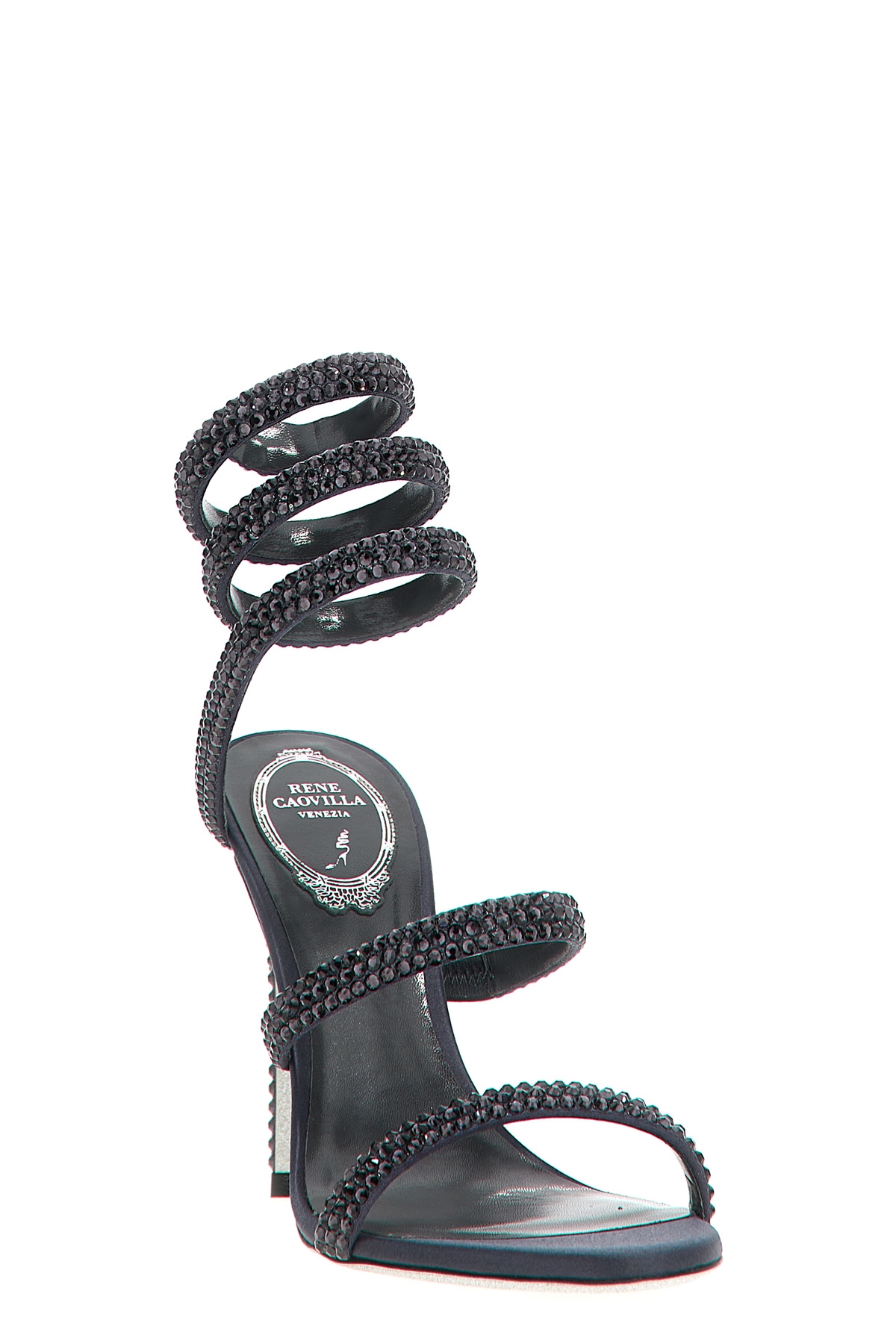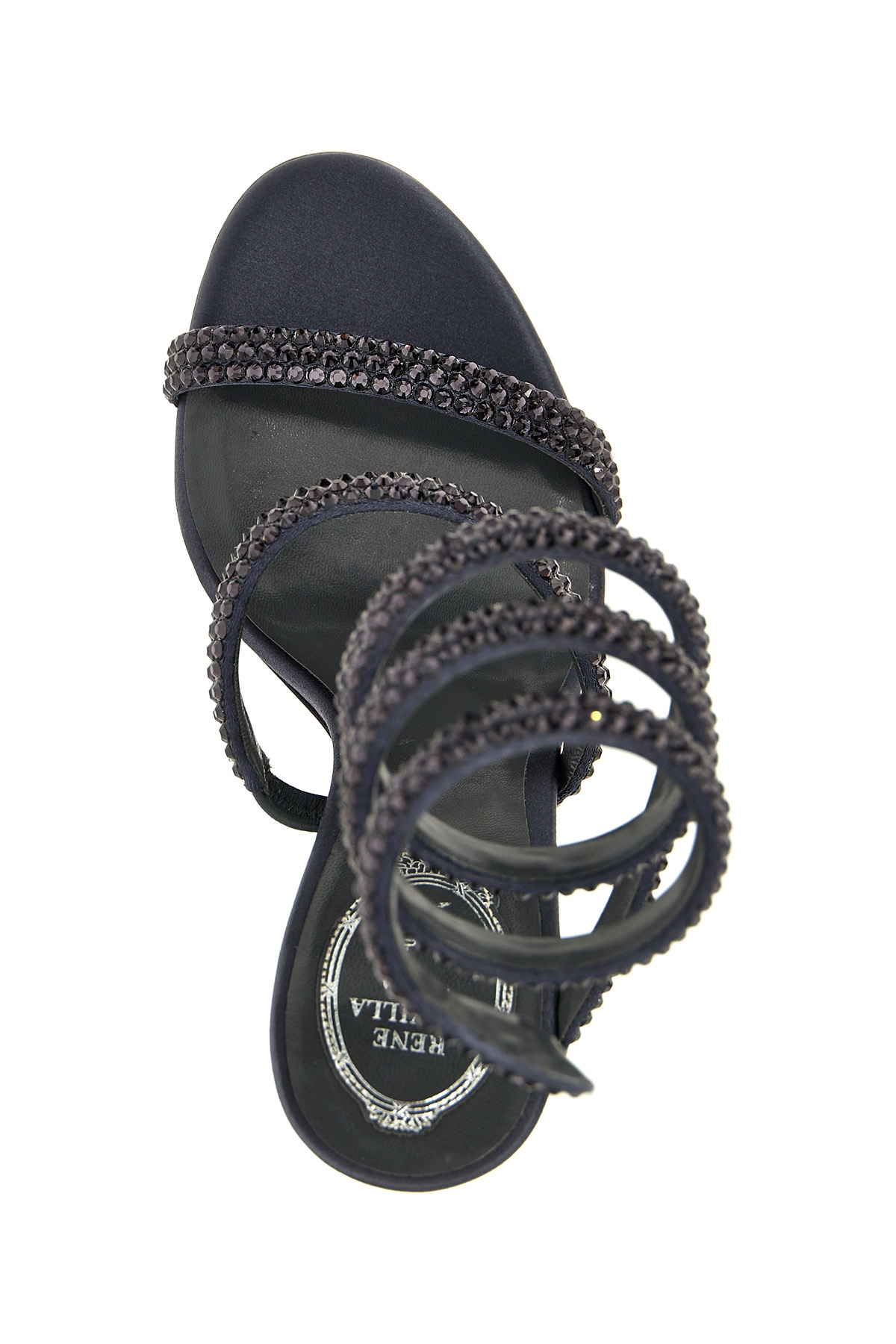 'Cleo' satin sandals with rhinestone applique, band wrapping around the ankle, heel.