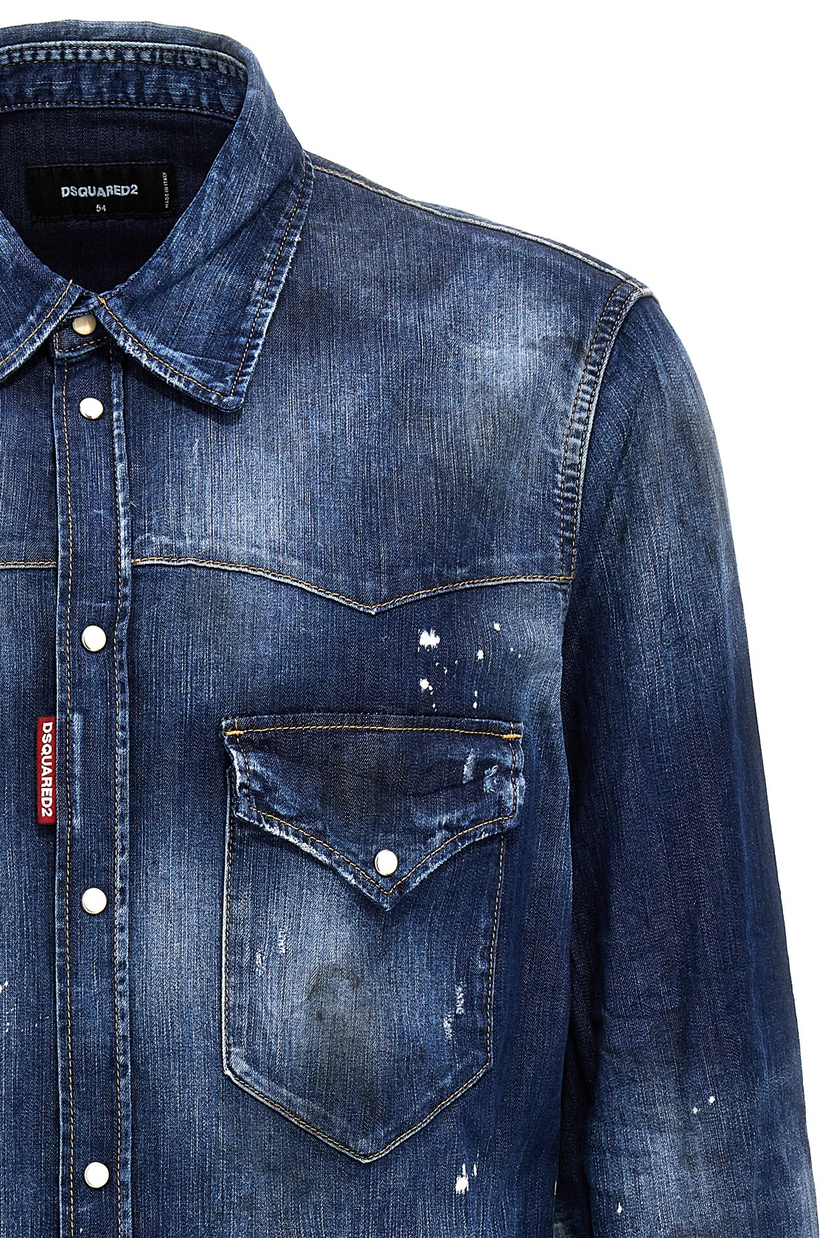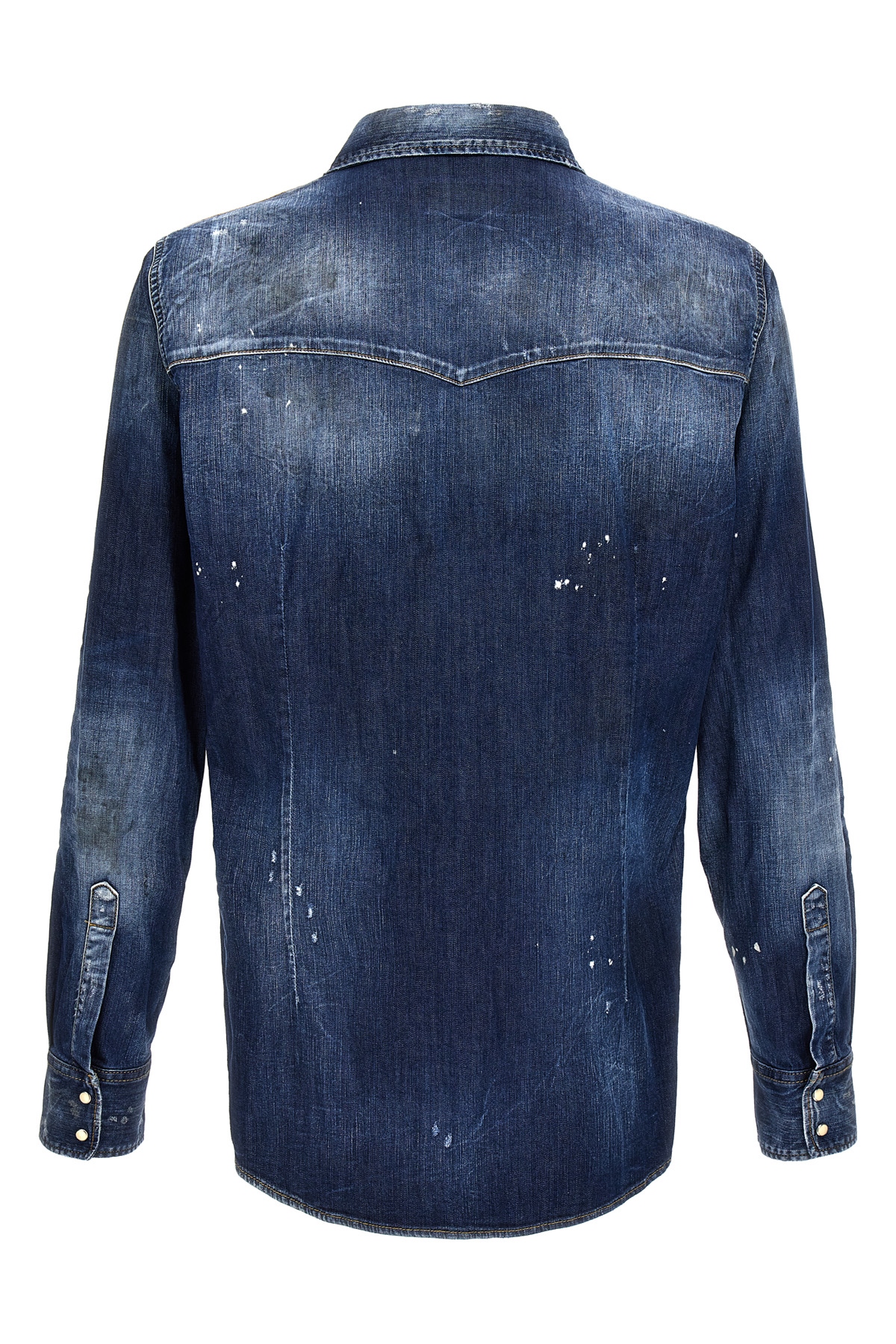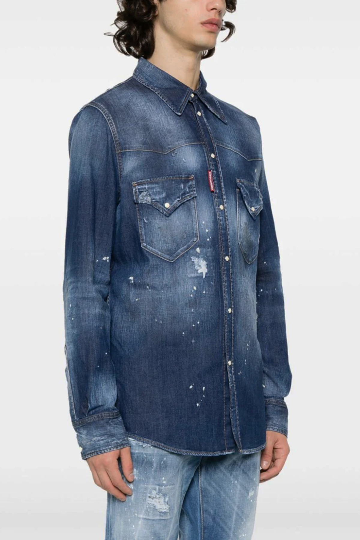 'Fashion western' stretch cotton denim shirt with lightening and ruins, contrast stitching, snap button closure, chest pockets.