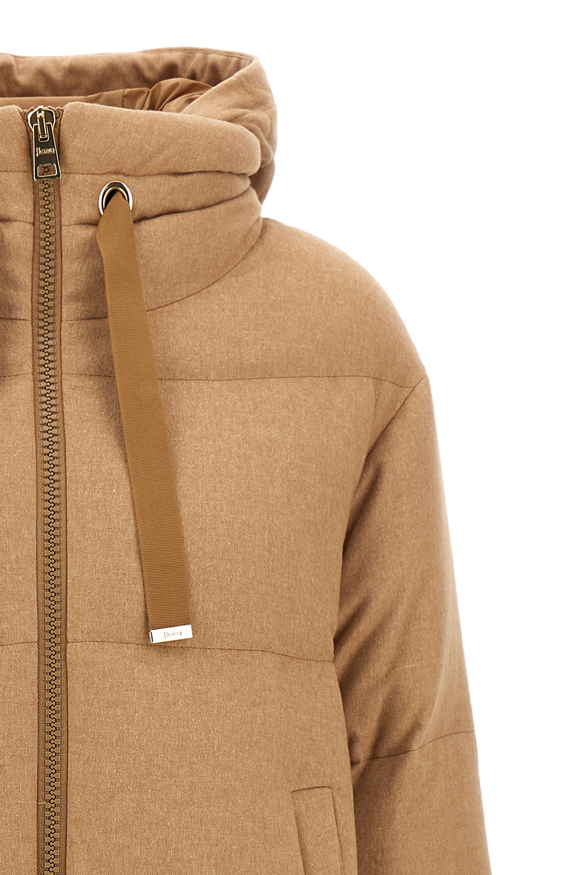 'A-shape' cashmere and silk down jacket, front zip closure, side zips, long cuffed sleeves, hood.