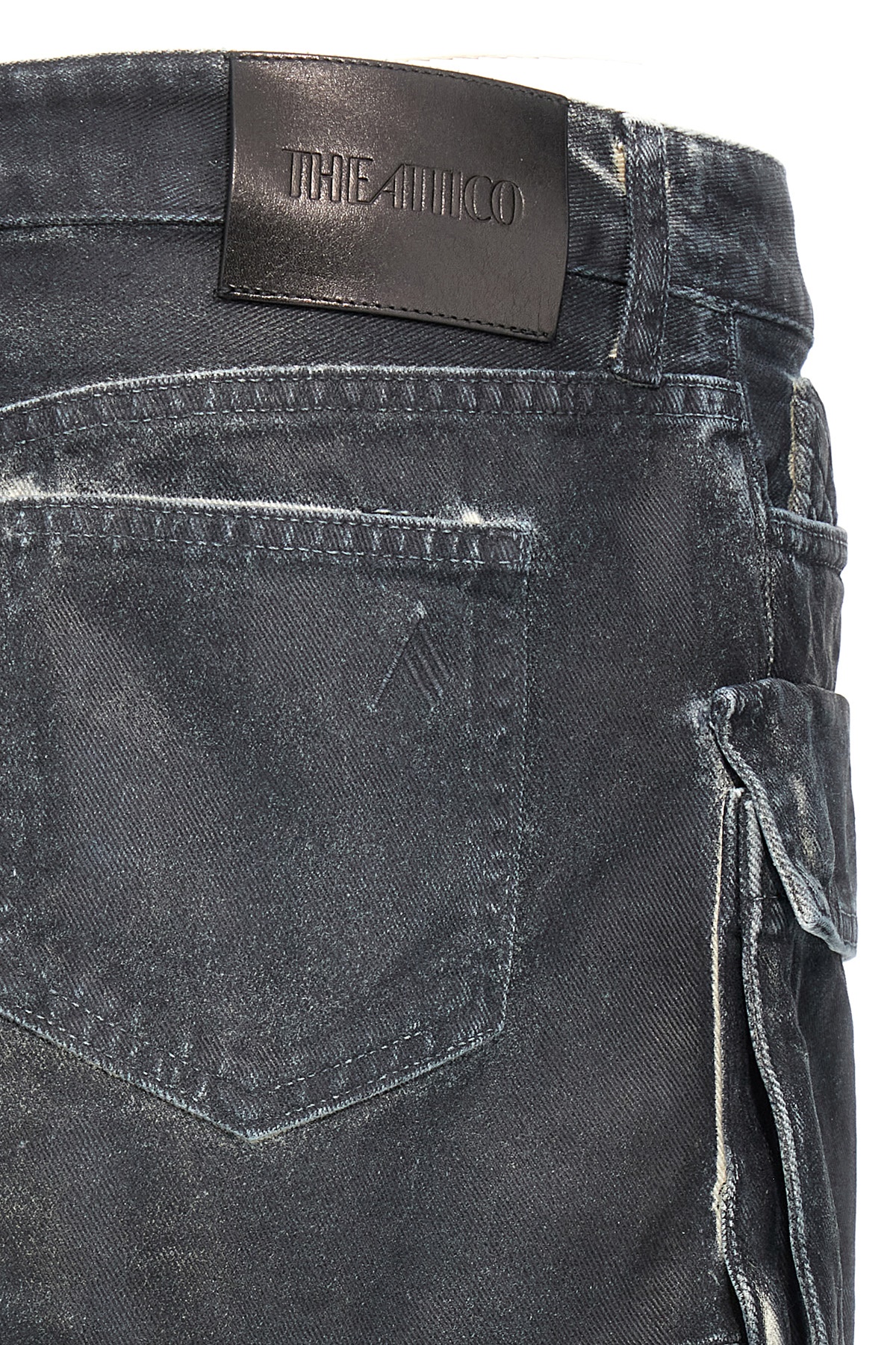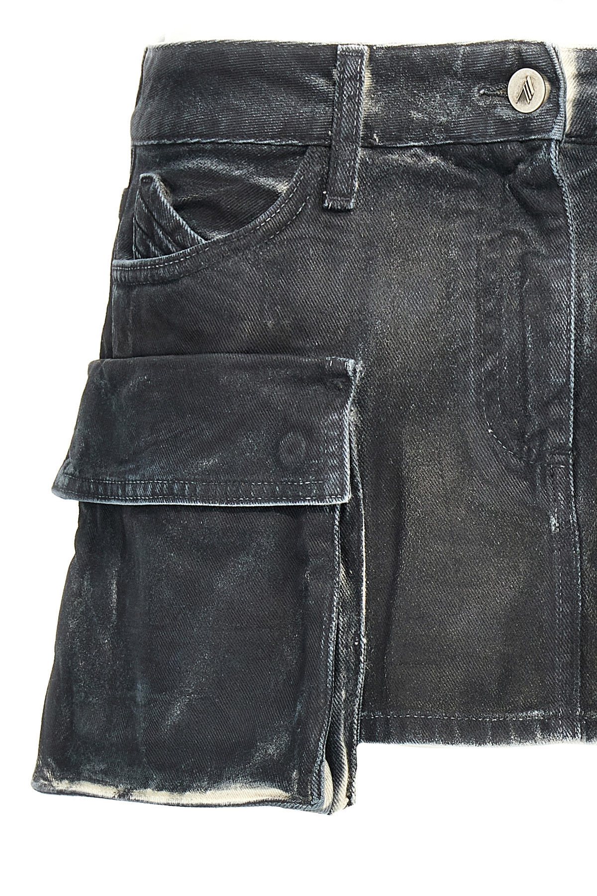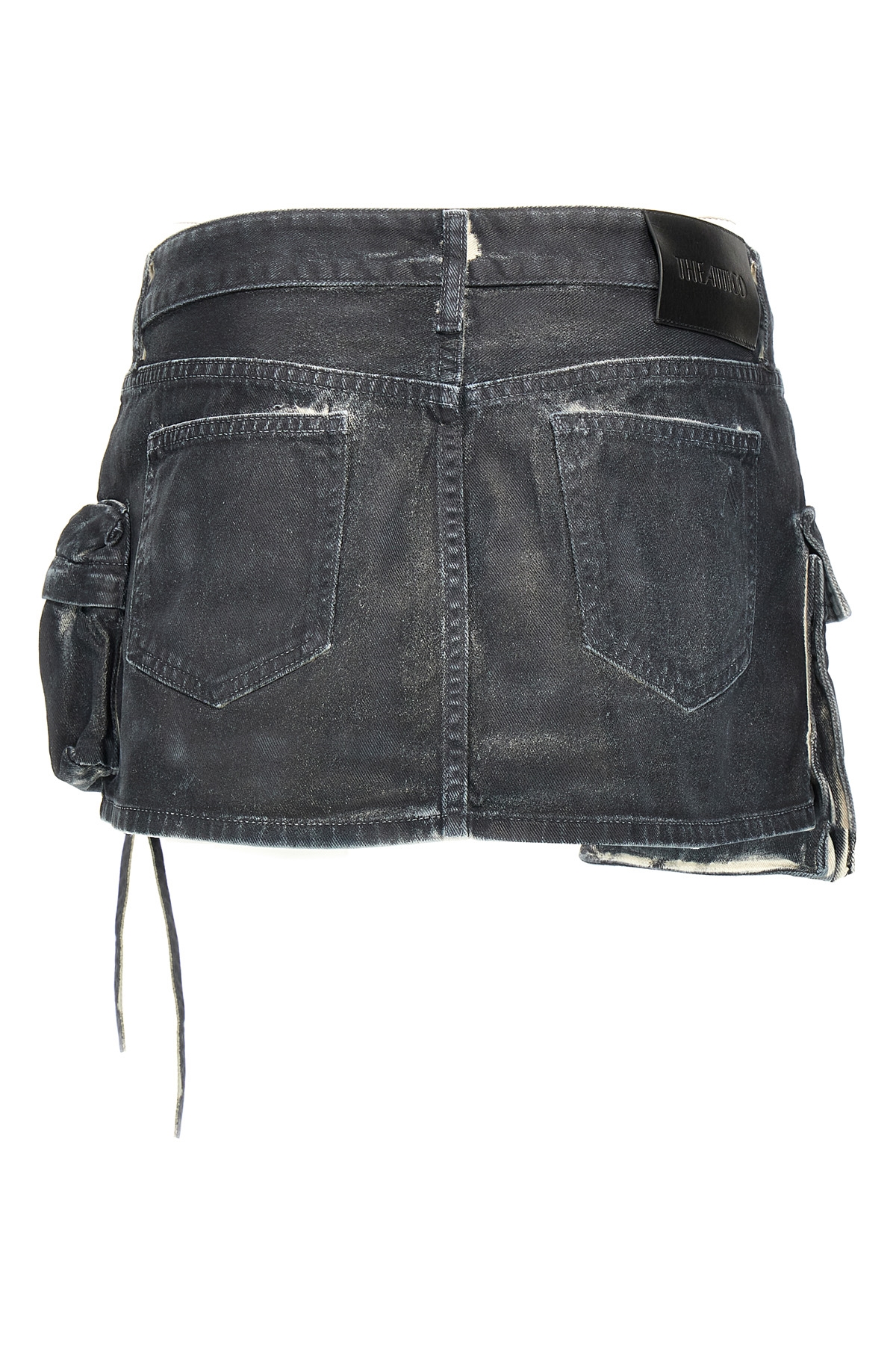 Cargo denim mini skirt with multipockets, low waist, zip and button closure, and leather logo label at the back.