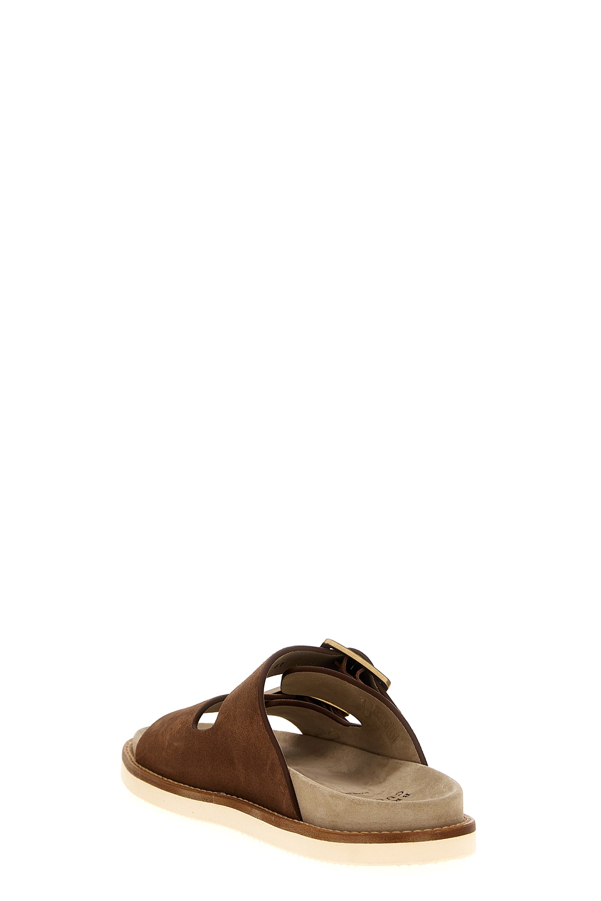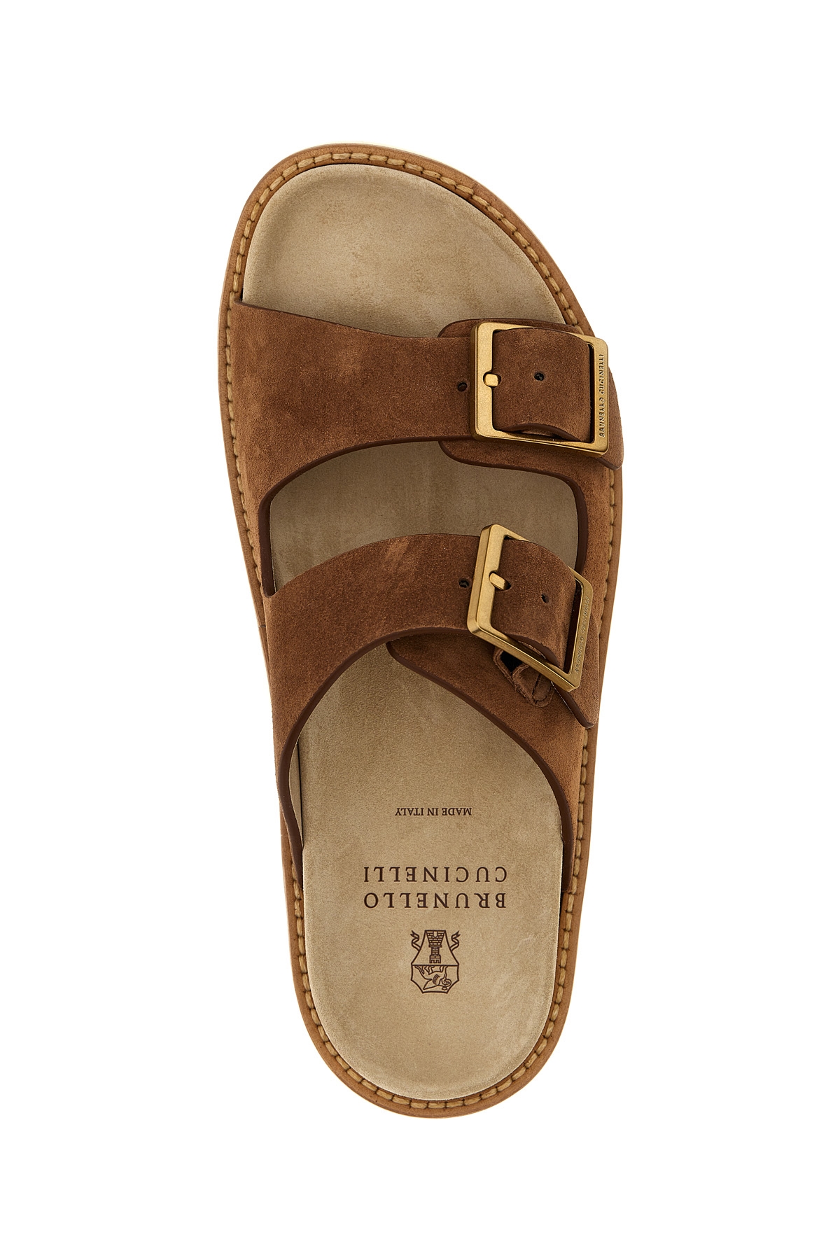 Suede sandals, adjustable bands with buckle, rubber sole.