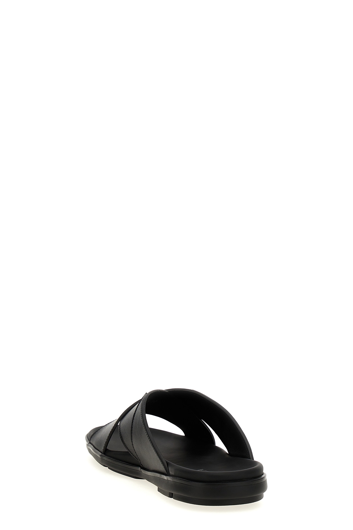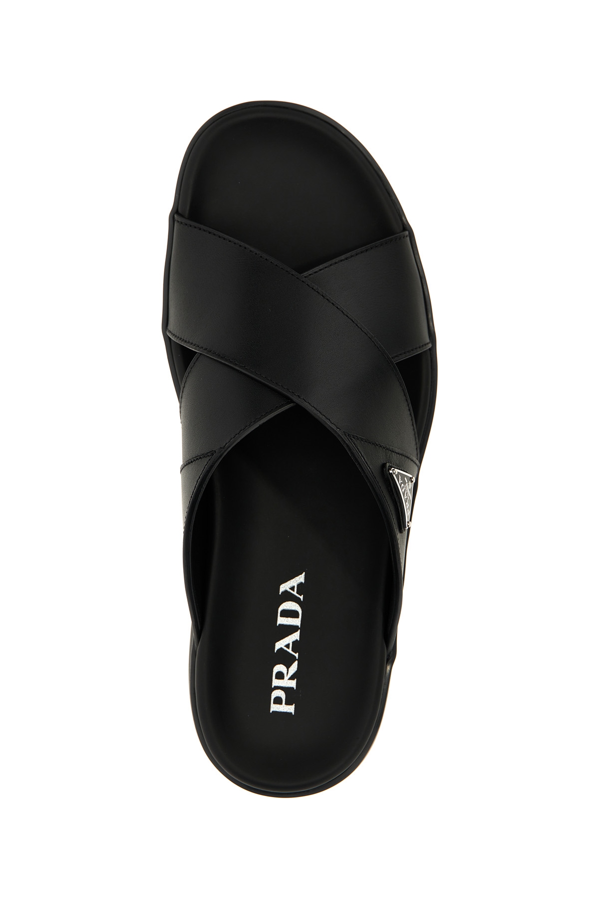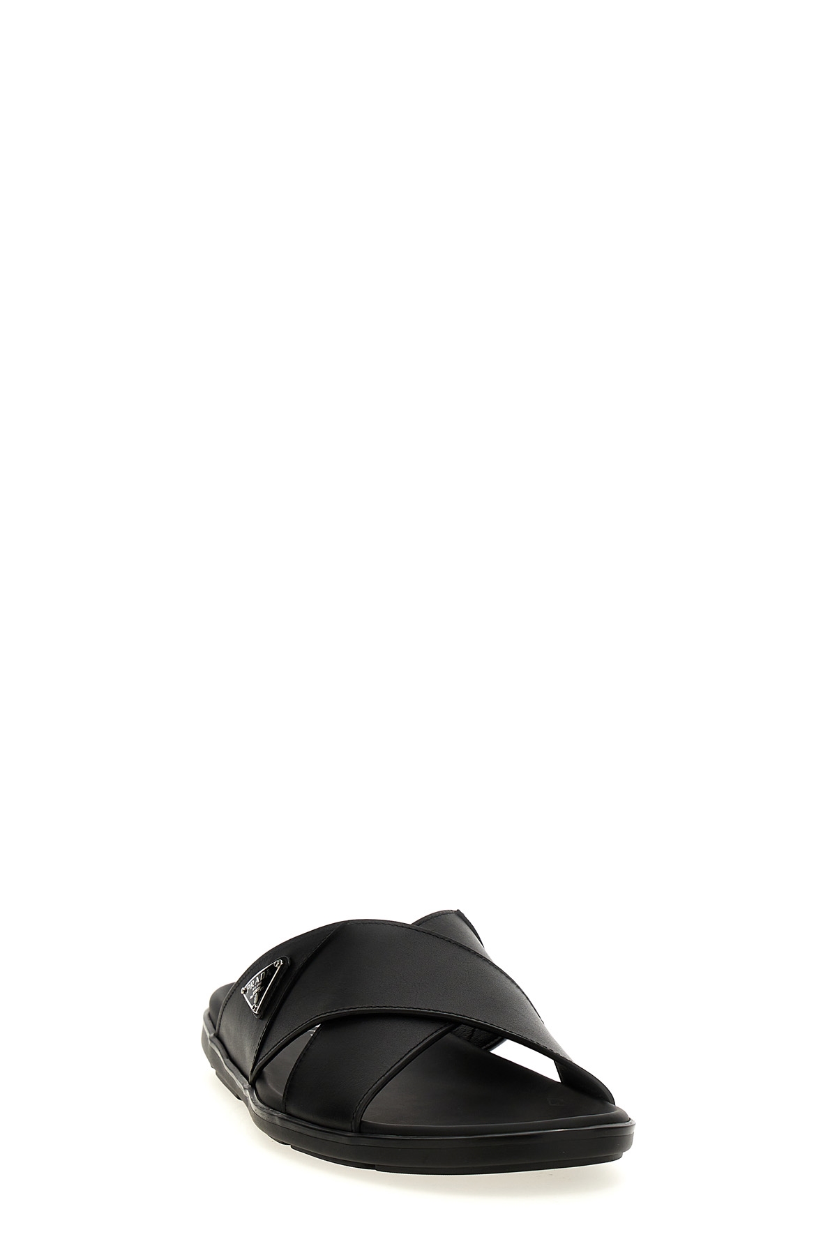 Leather sandal, triangle logo in enameled metal on the side, rubber sole.