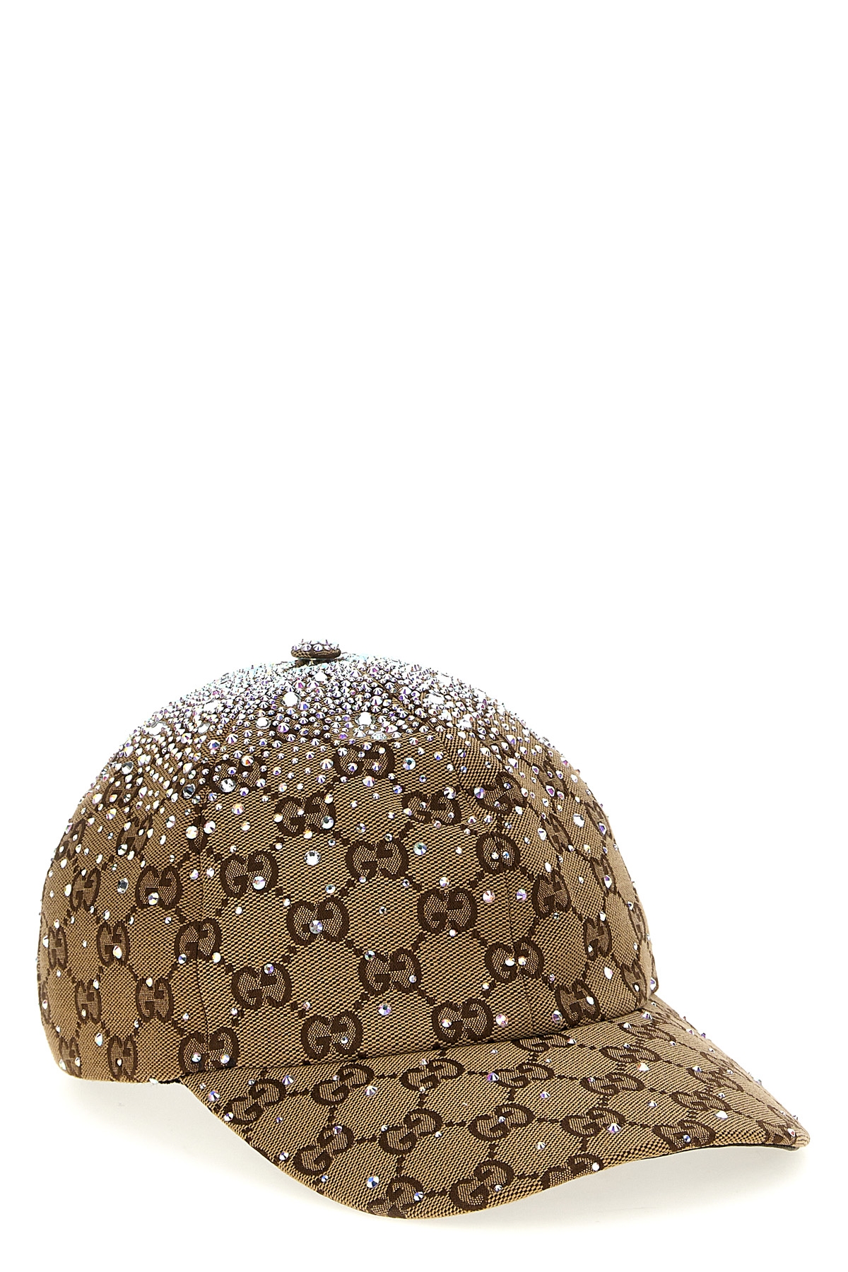 GG fabric cap with all-over rhinestone applique, leather details, adjustable strap.