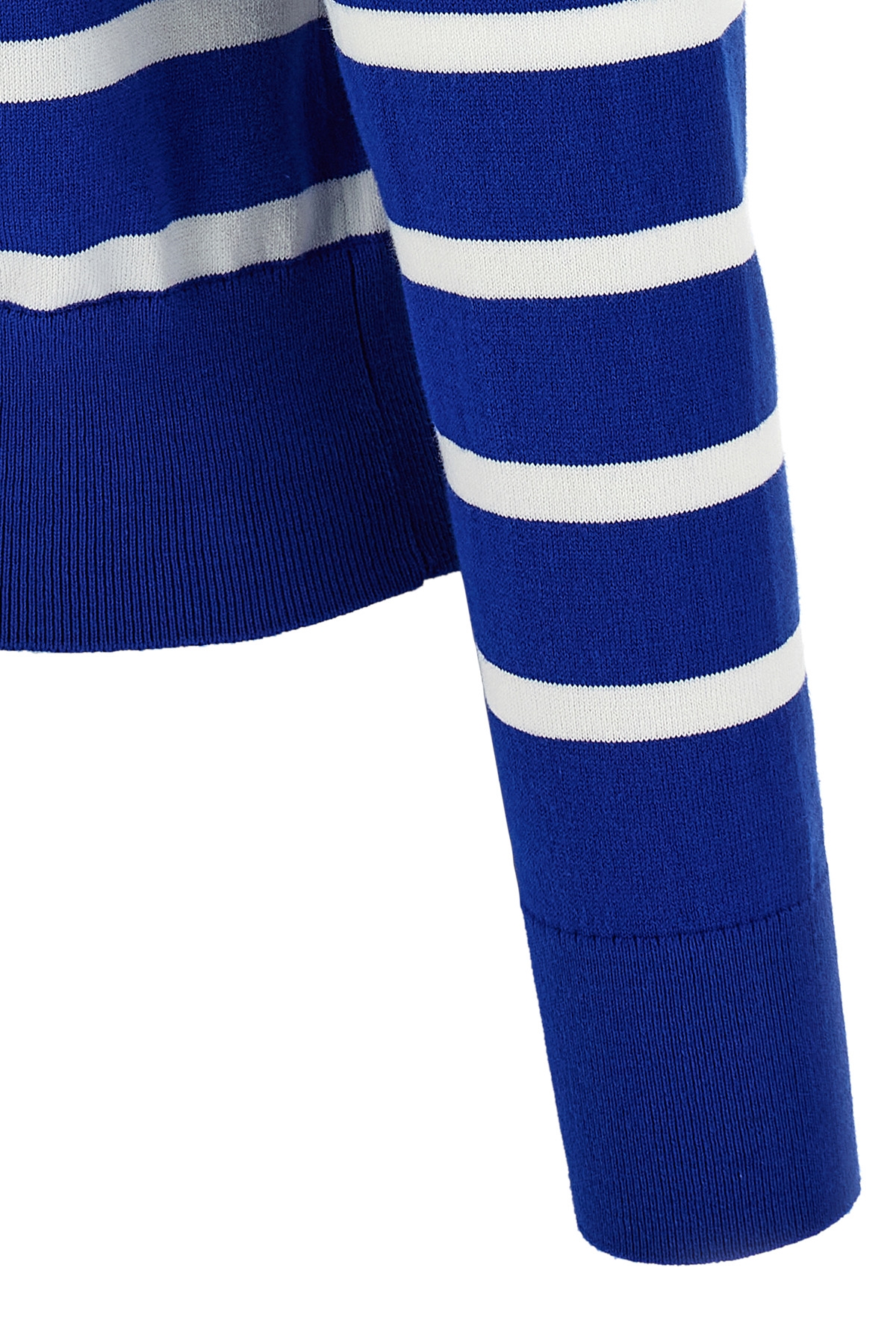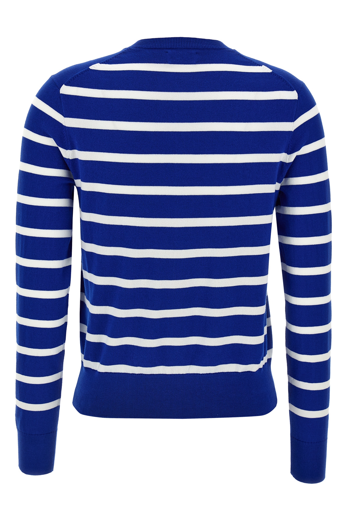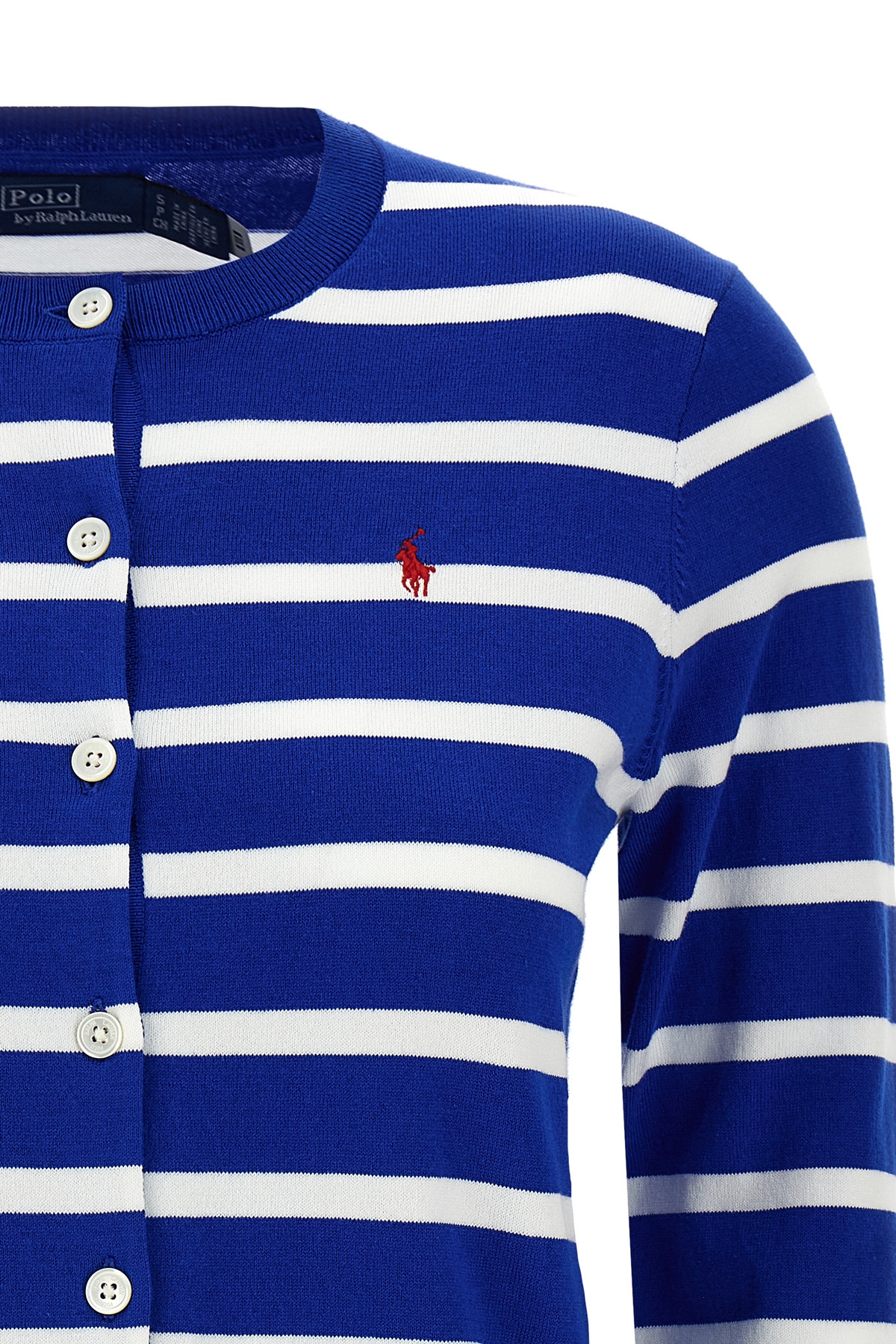 Striped stretch cotton blend cardigan with contrasting front logo embroidery, crew neck, button closure, long cuffed sleeves.