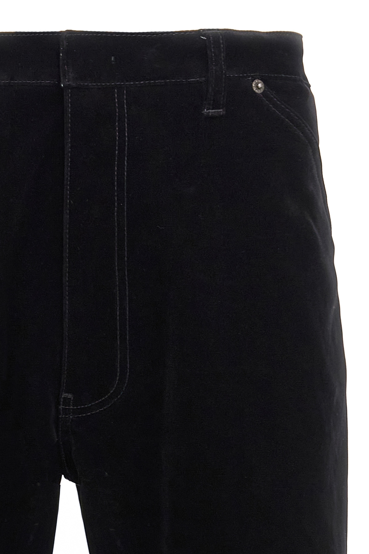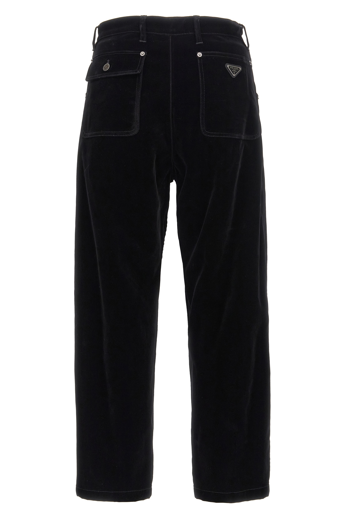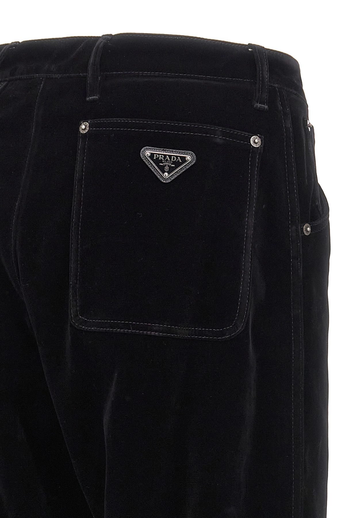 Plain velvet pants, zipper hook and button closure, five pockets, enameled metal triangle logo on back, straight leg.