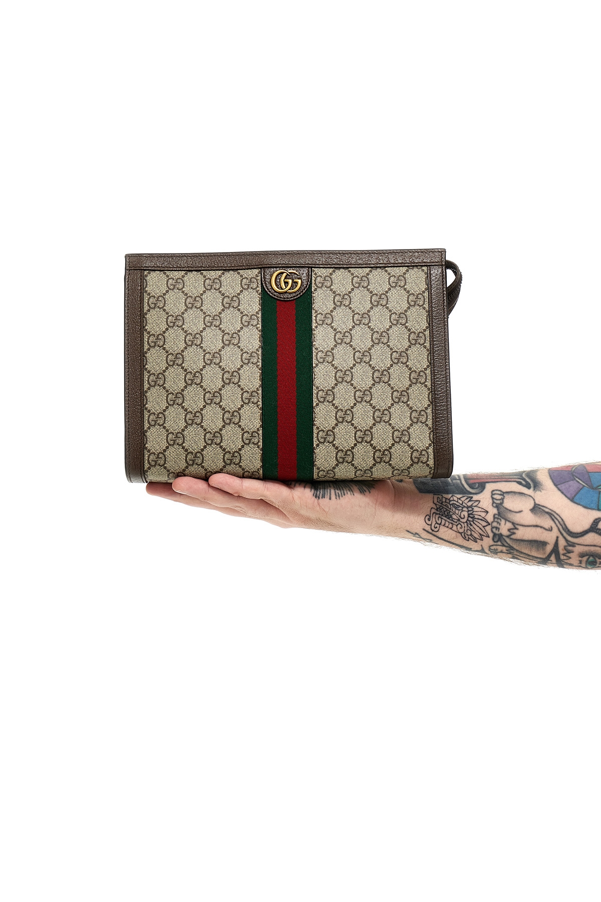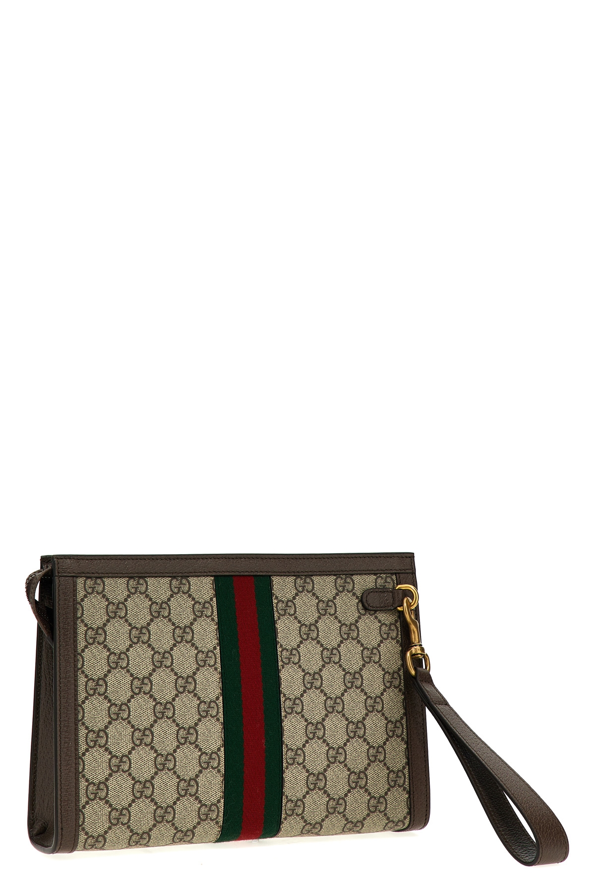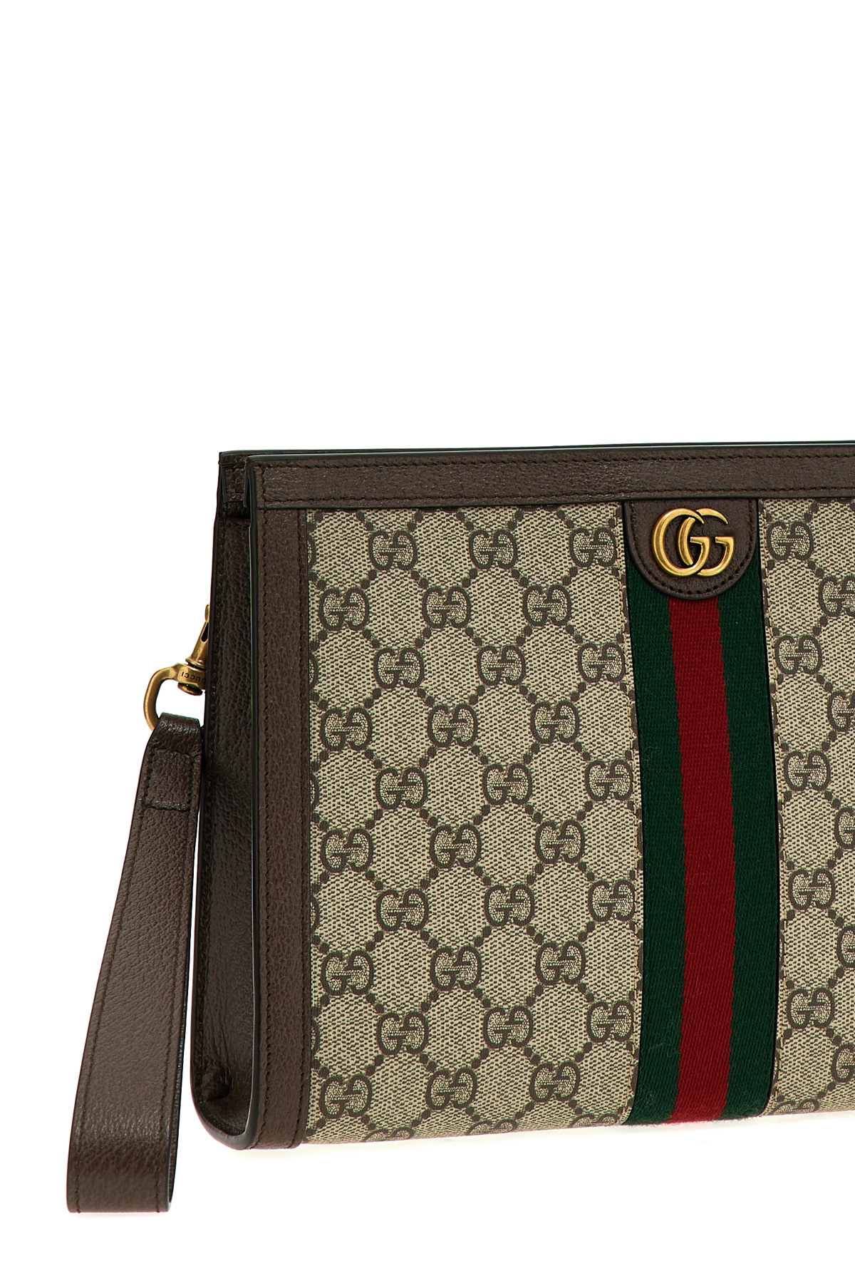 'Ophidia GG' clutch bag in GG Supreme fabric with leather details, zip closure, removable wrist handle.