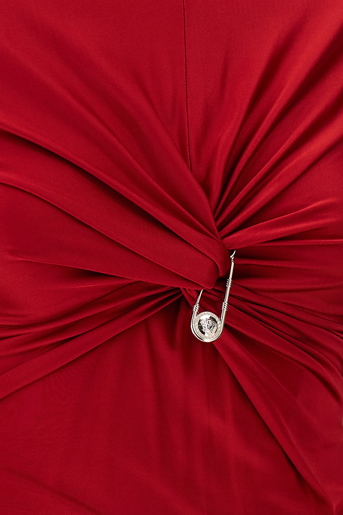 Stretch viscose jersey midi dress with front 'Safety Pin' metallic '', crew neck, back zip closure, long sleeves.