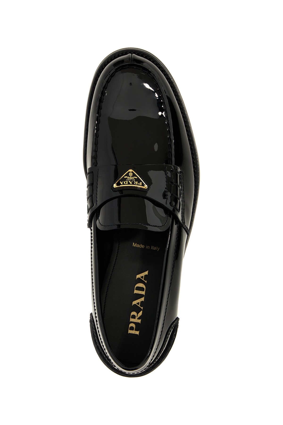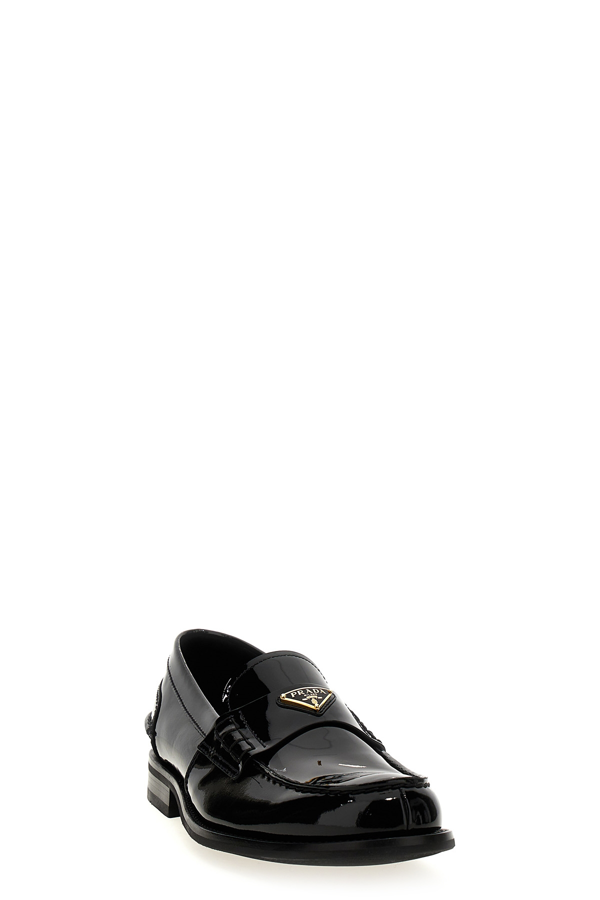 Patent leather loafers, triangle enameled metal logo applique on the front, rubber sole.