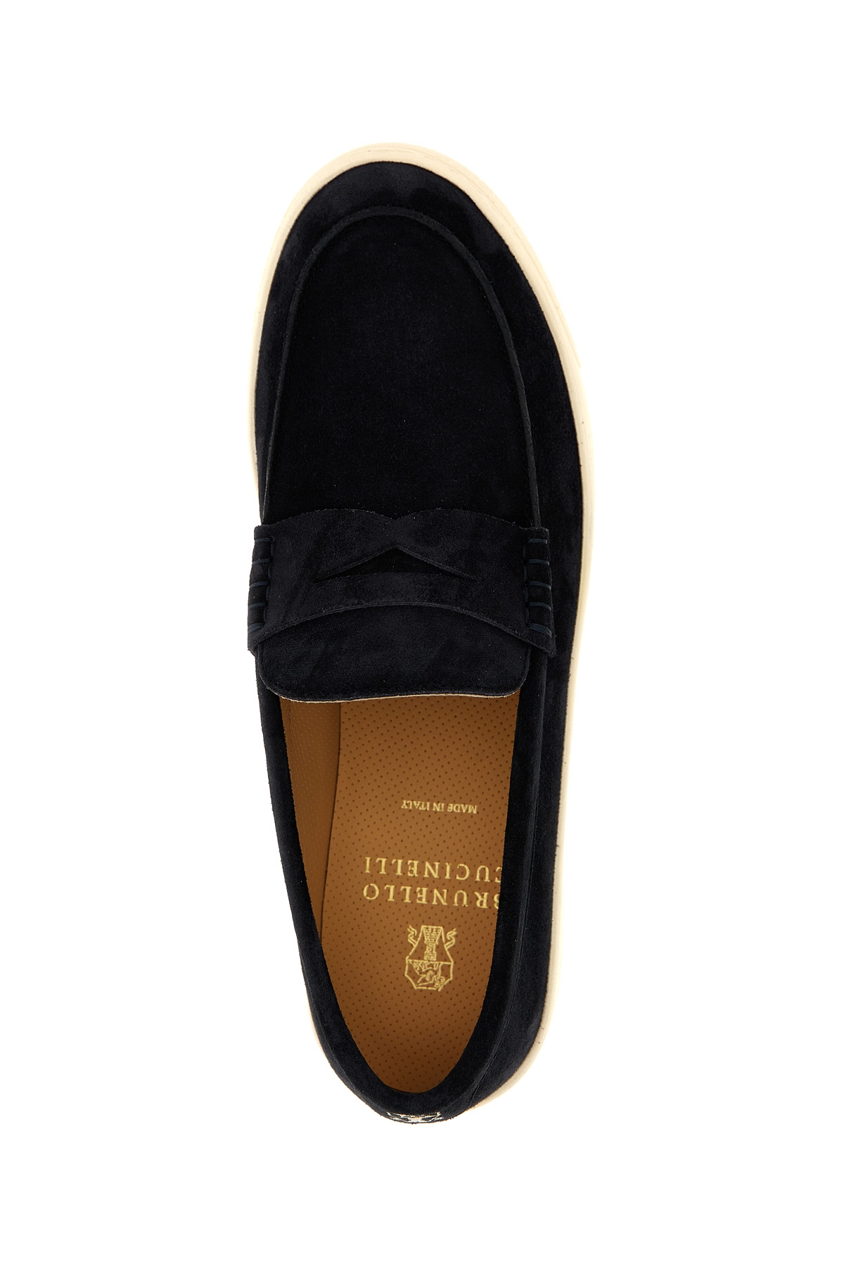 Suede sneaker loafers with leather-lined interior, ogo print on the heel, and rubber sole.