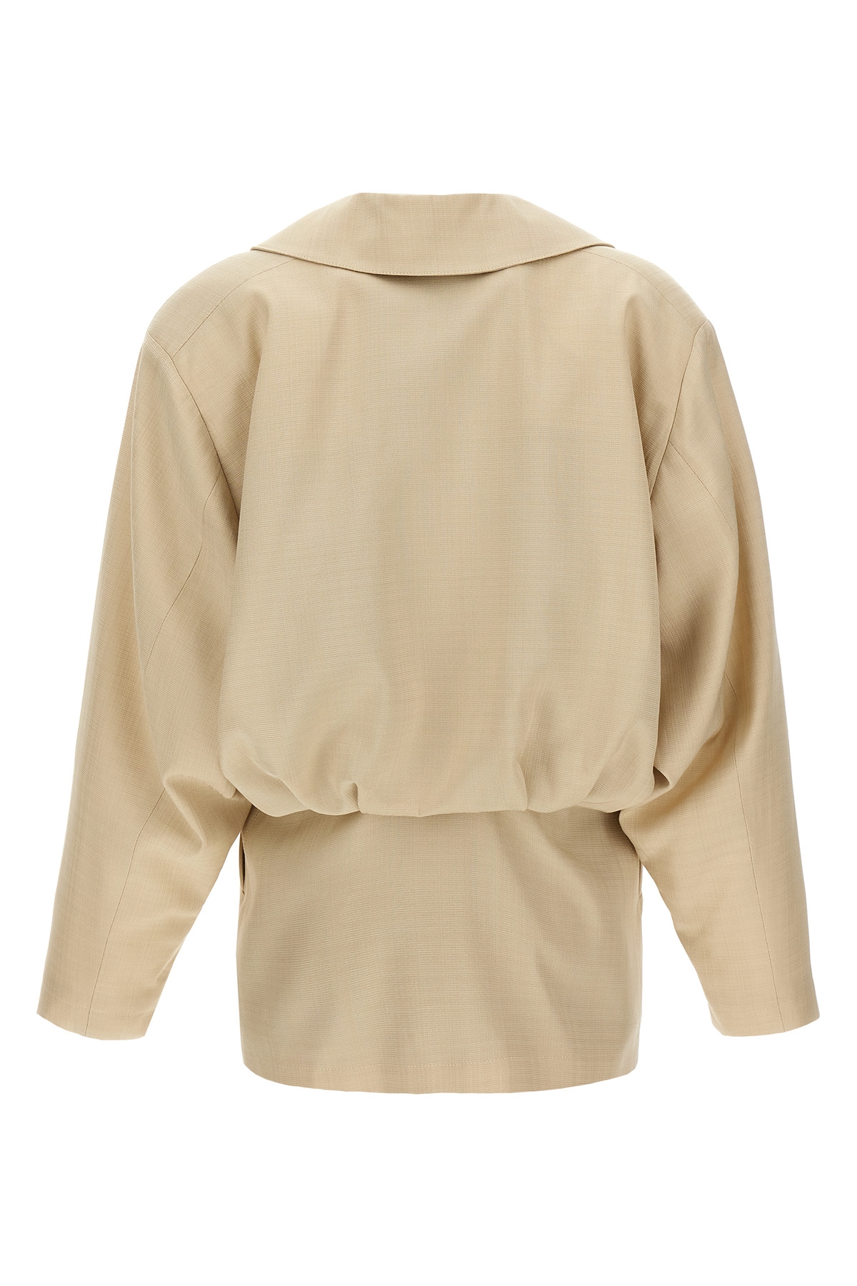 'Sheena Ares' double-breasted viscose blazer with button closure, waist marked with back ruffles, padded shoulders, wide long sleeves with slightly dropped shoulders, pockets and lining.