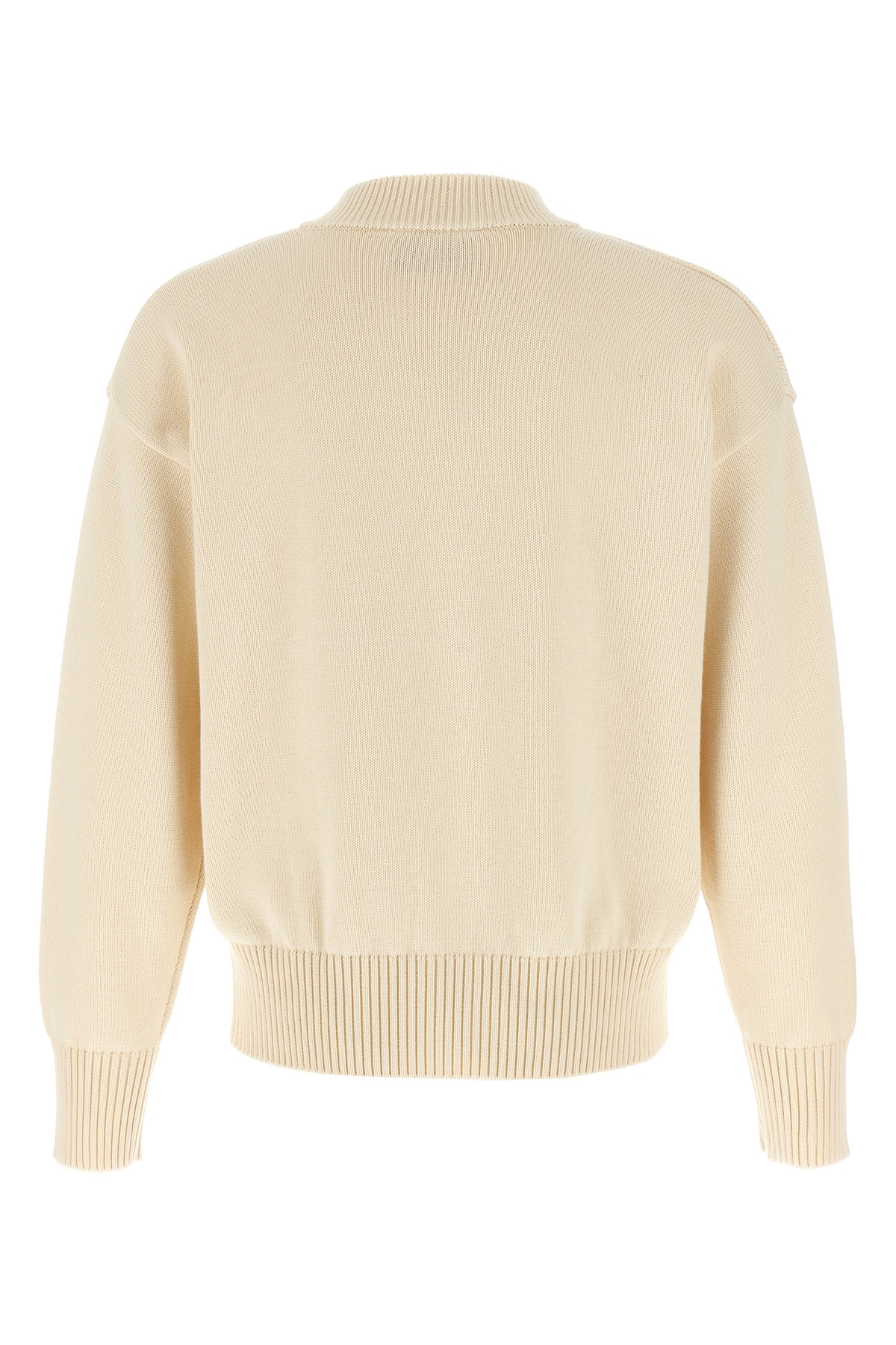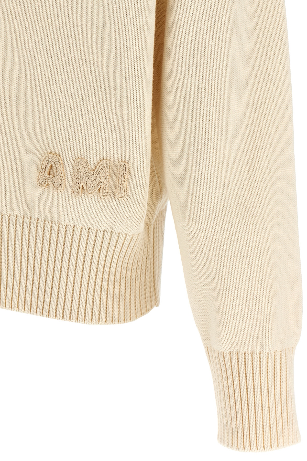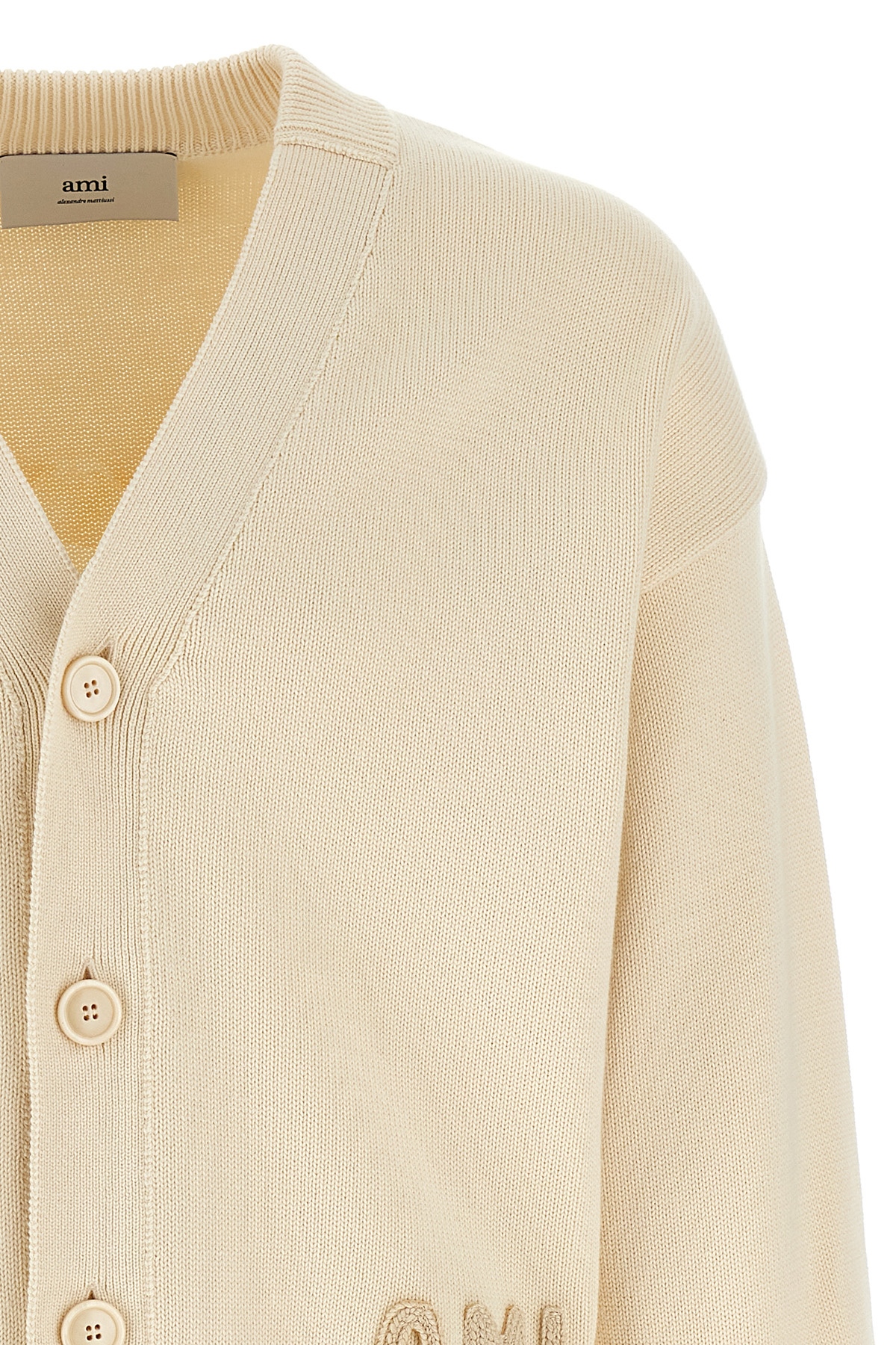 Cotton and wool blend cardigan with tone-on-tone AMI embroidery on the front, V-neck, button closure, long cuffed sleeves.