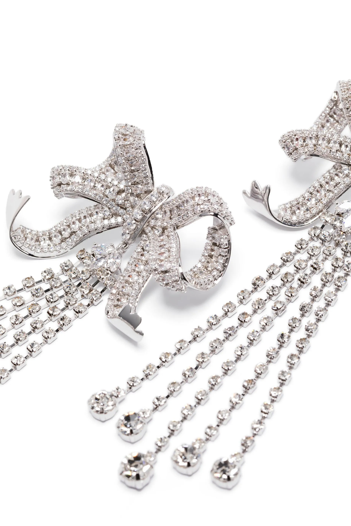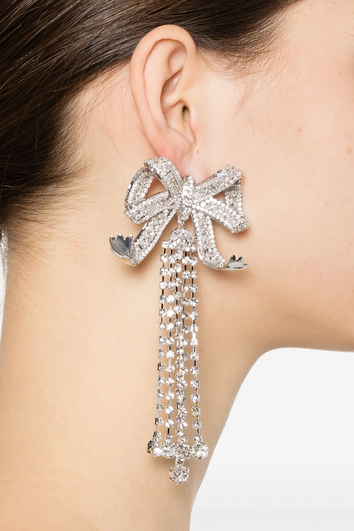 'Large Crystal Bow Droplet' earrings in silver brass with bow and rhinestone pendants, pin closure. ITEM CANNOT BE RETURNED