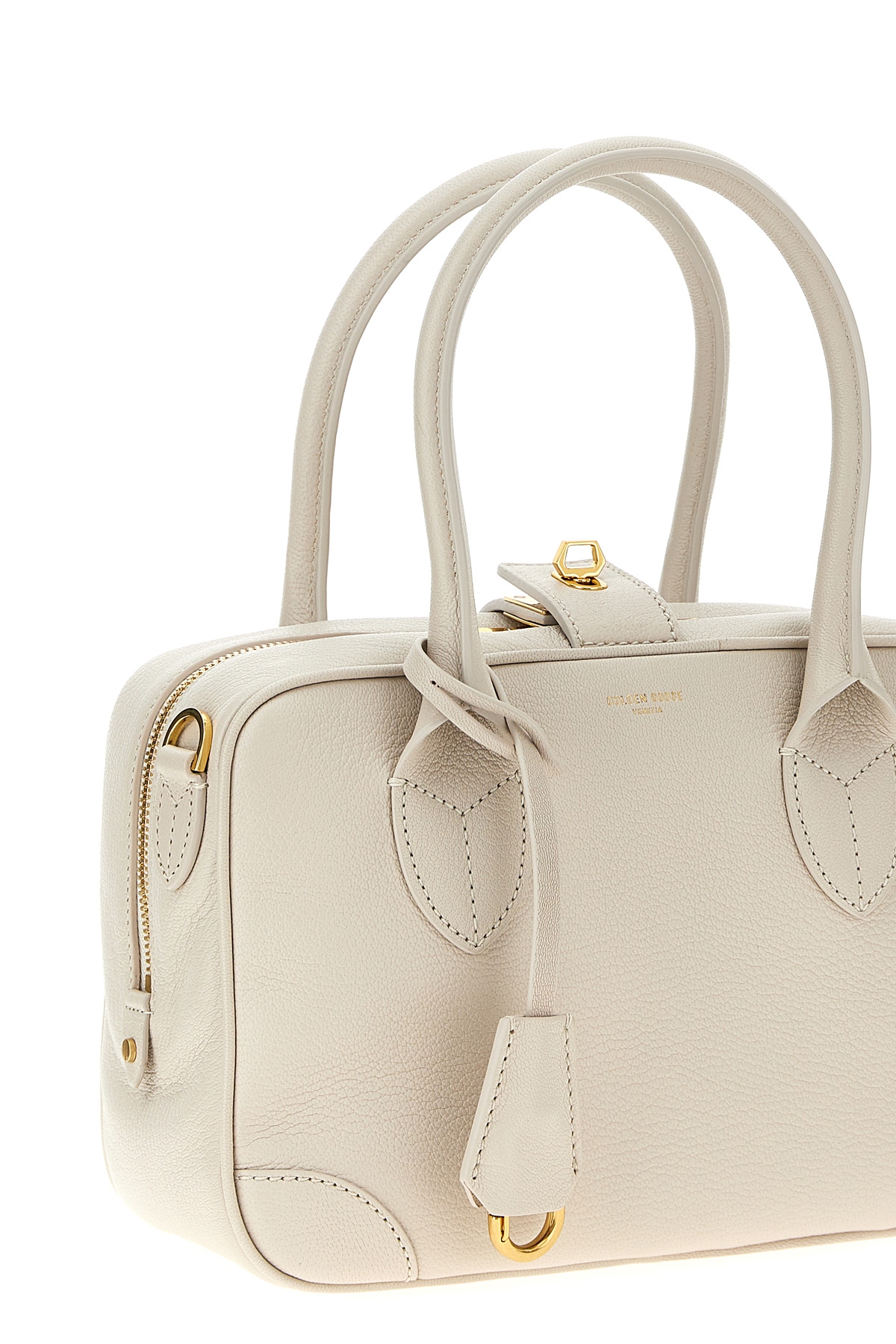 'Vita' leather handbag with zip and band closure with metal spin, double handle, removable keyring, adjustable and removable shoulder strap.