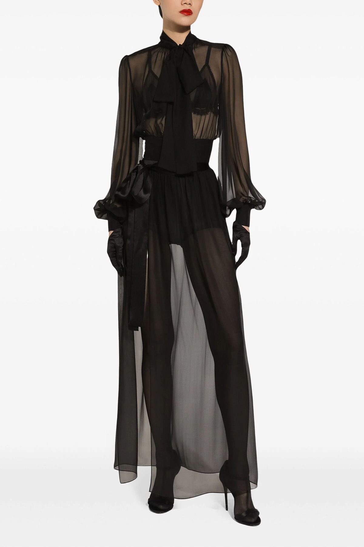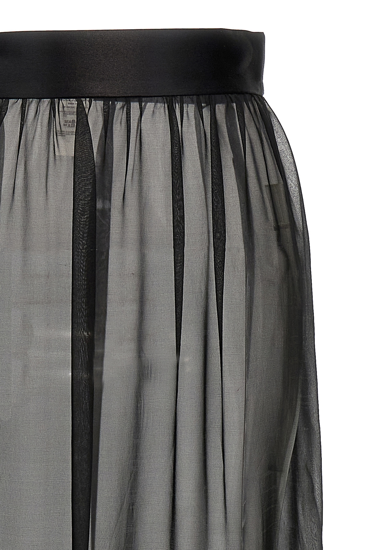 Long silk chiffon skirt with satin belt at the waist.