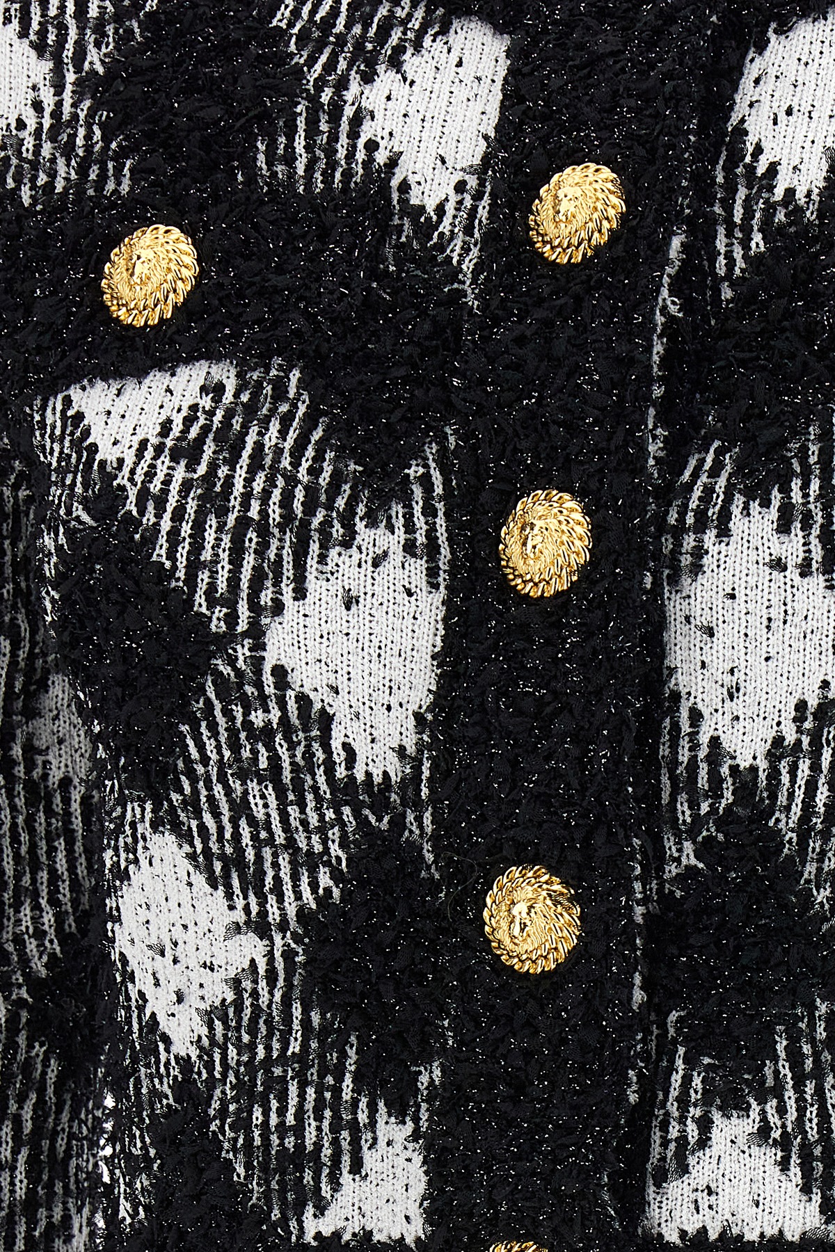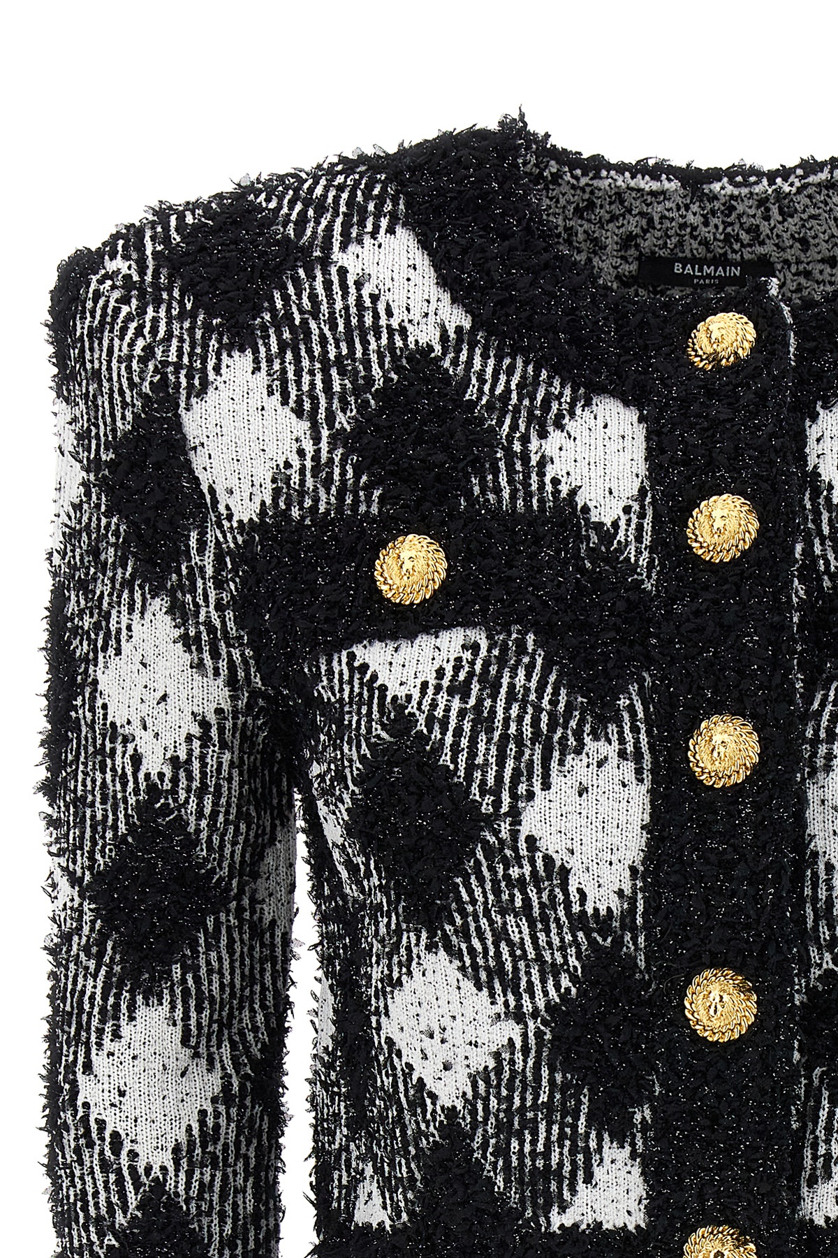 Short jacket in lurex tweed with macro vichy print, crew neck, padded shoulders, long sleeves, gold metal closure and button applique.