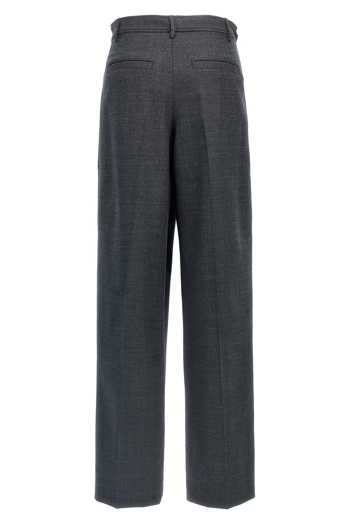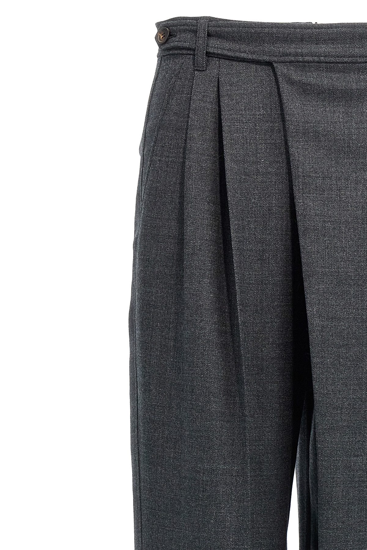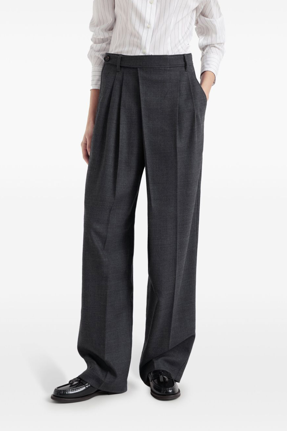 Virgin wool grisaille trousers, loose wrapped model, double pleats, back jewel detail, zip and button closure, straight leg with stretched pleat, pockets.