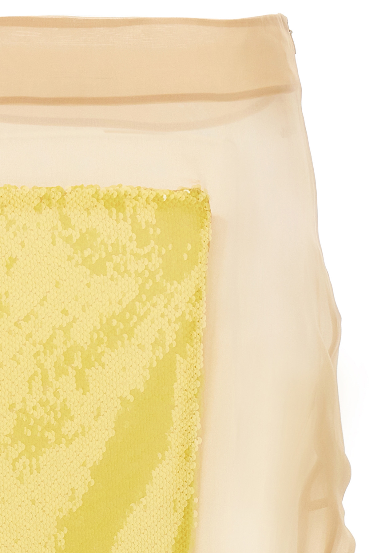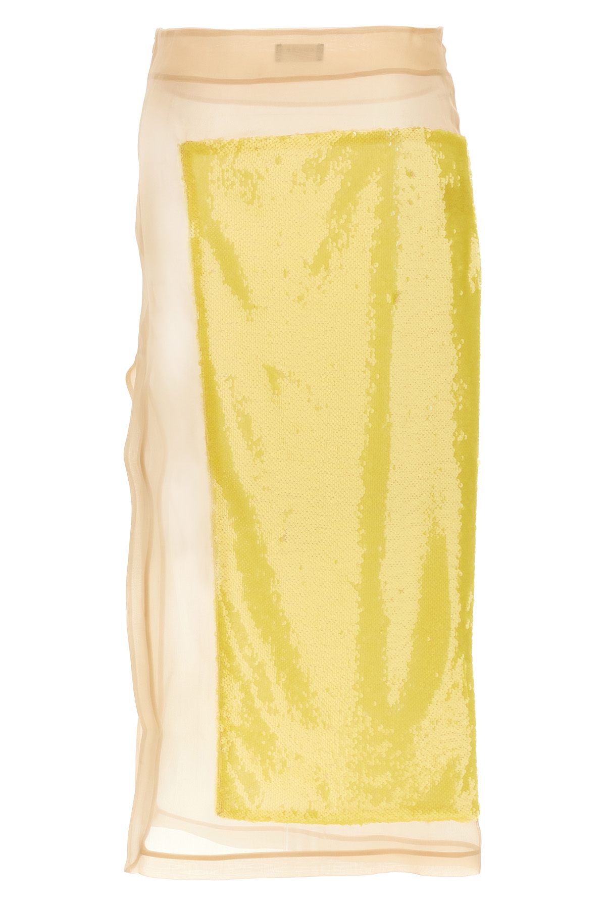 Long skirt in transparent silk with contrasting sequin insert, side zipper closure, and side split.
