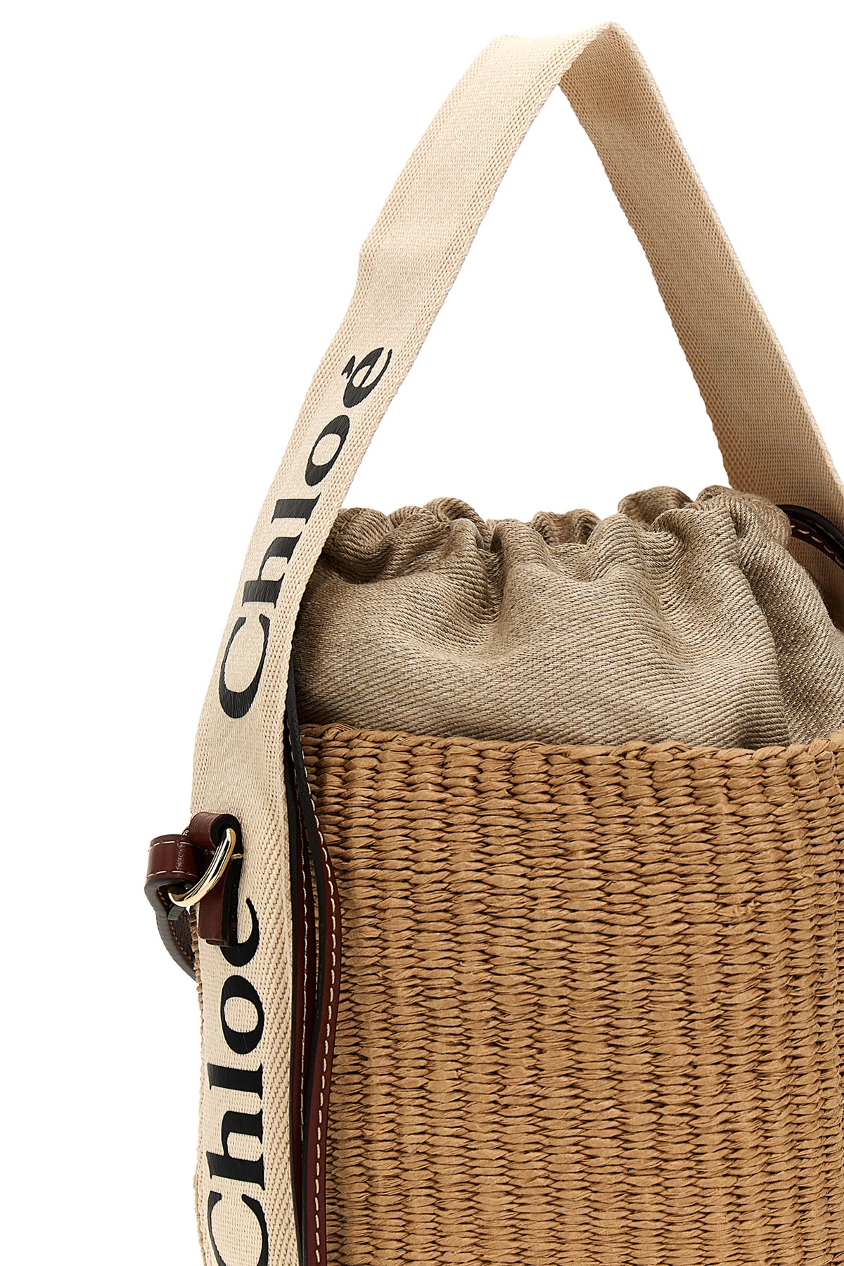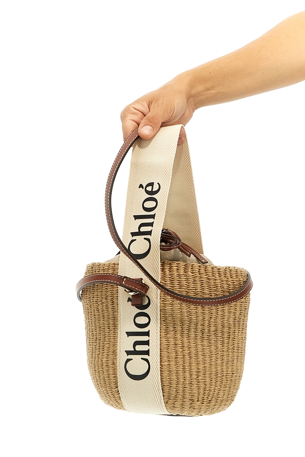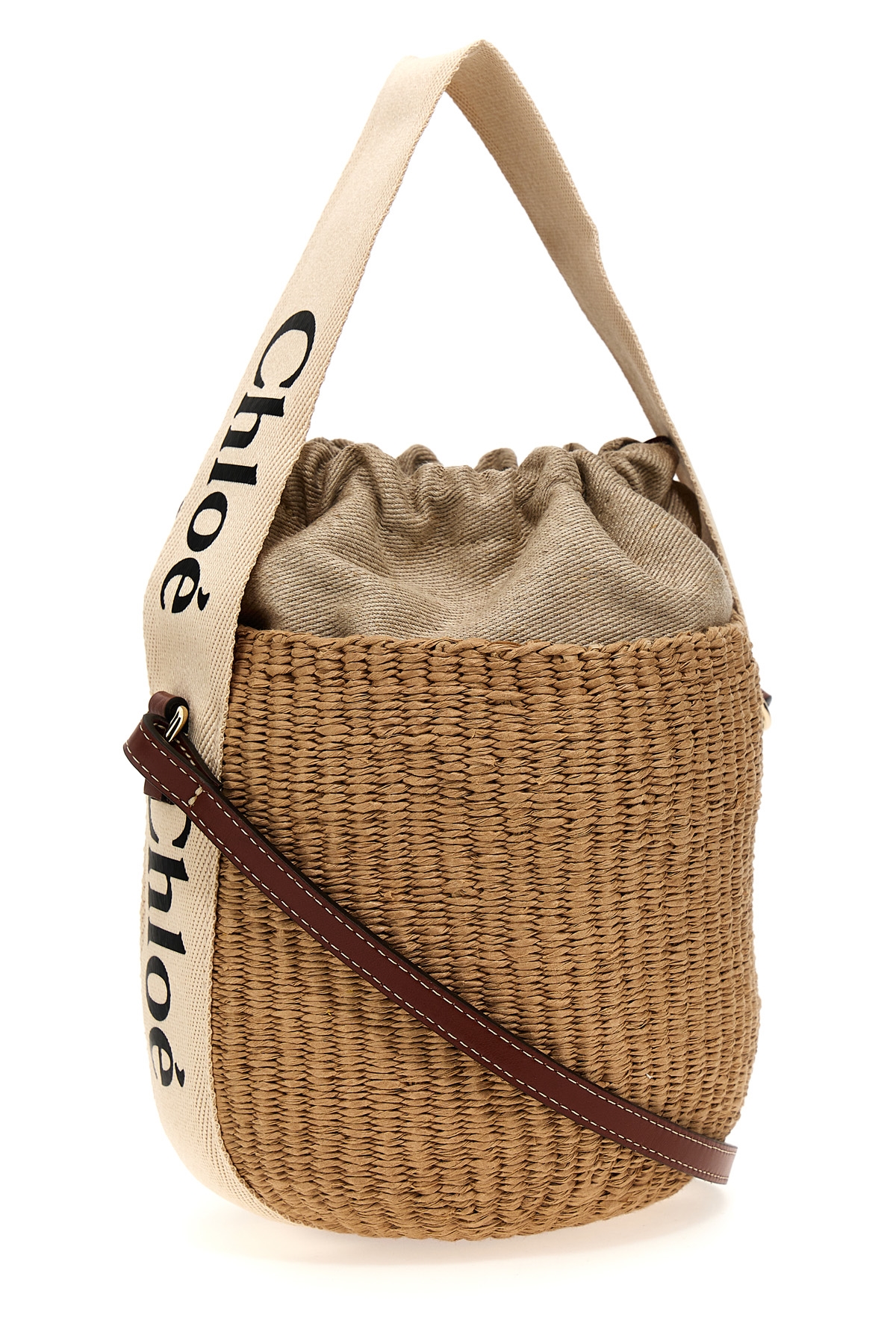 Small Woody straw bucket bag with leather drawstring closure, canvas inside and logo fabric shoulder strap, also equipped with a second leather shoulder strap.