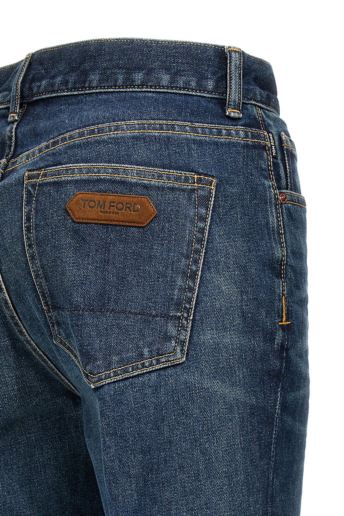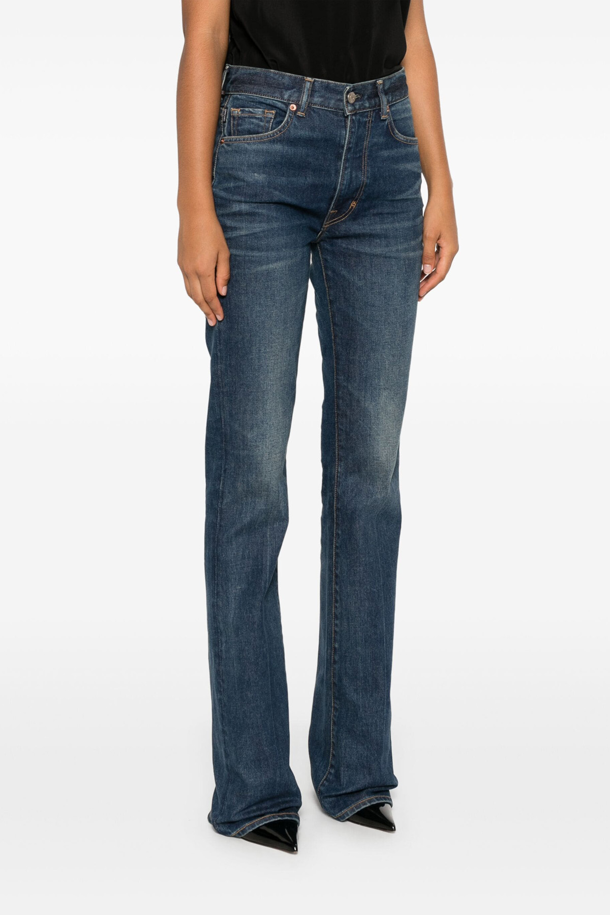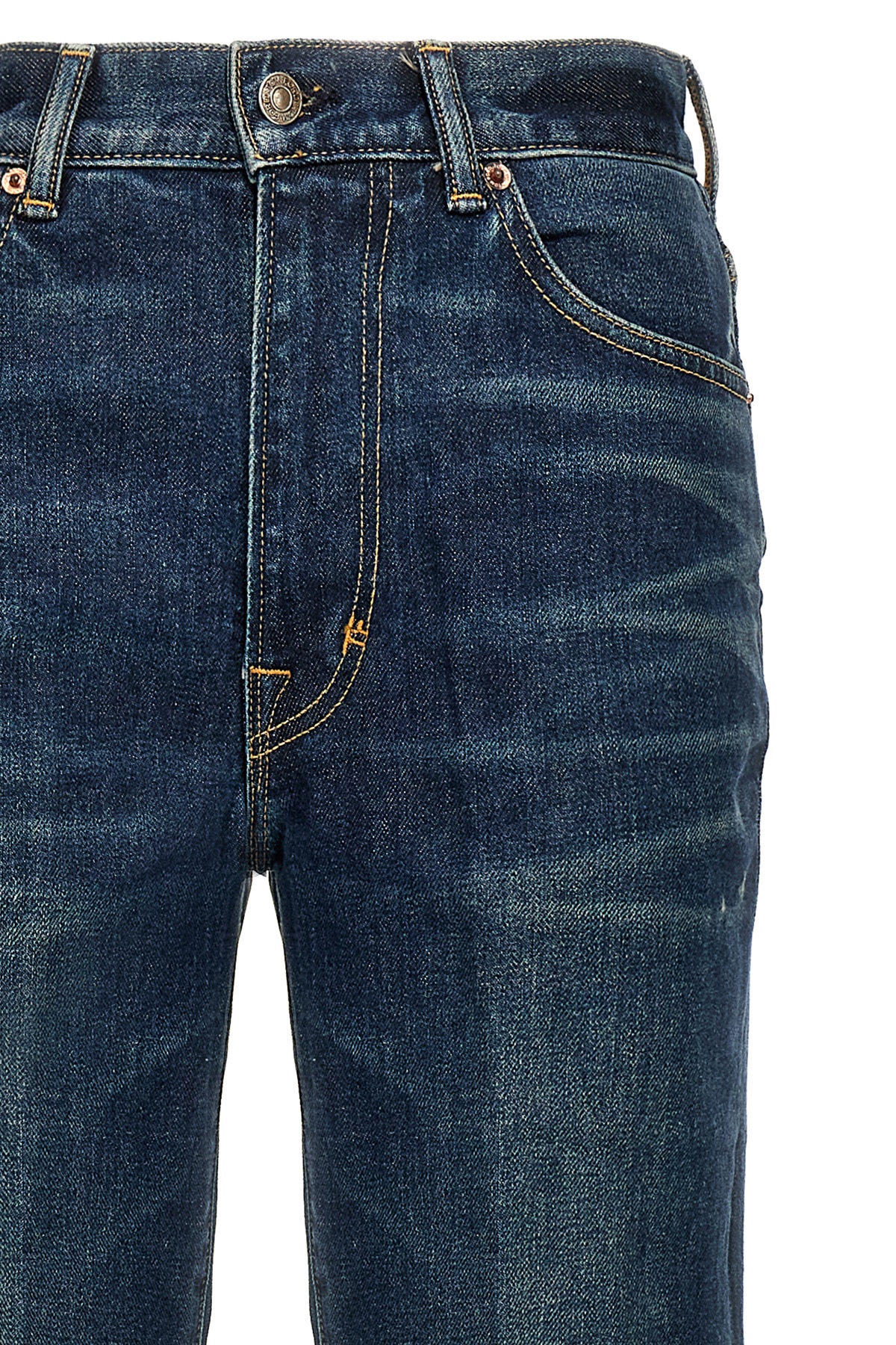 Cotton denim jeans with flared leg and stretched pleat, zip and button closure, five pockets, leather logo patch on the back.