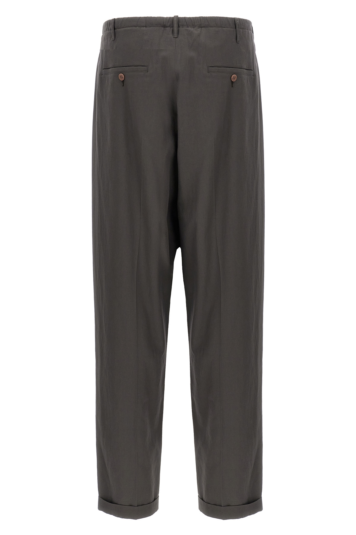 'People's' cotton pants, elastic and drawstring at the adjustable waist, zip flap, pockets, pleat and stretched pleat, turned-up hem.