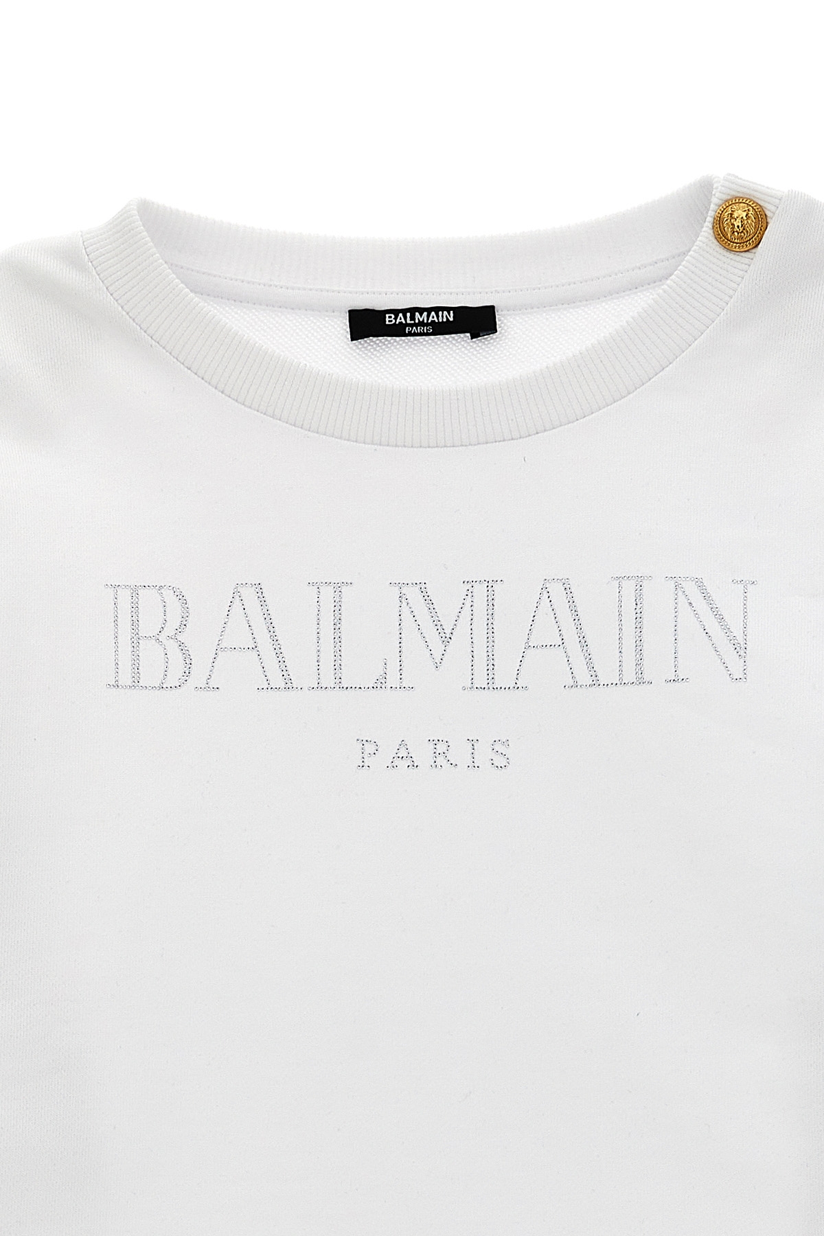 KIDS Brushed cotton sweatshirt with micro rhinestone 'Balmain Vintage' print, crewneck, long sleeves with 'Leone Catena' button detail on the shoulder.