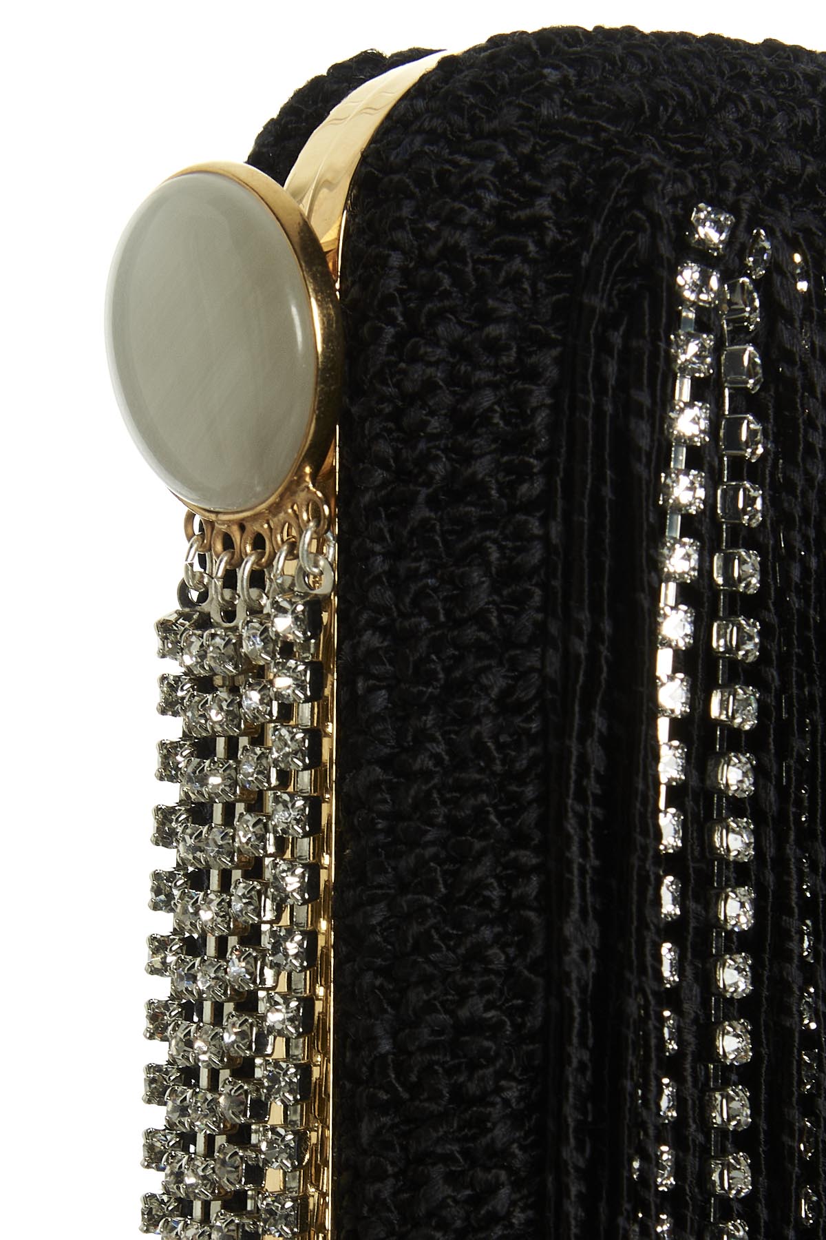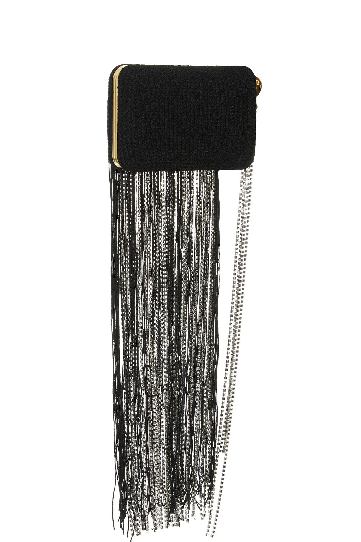 'Lelia' clutch bag with crystal details and crystal fringes.