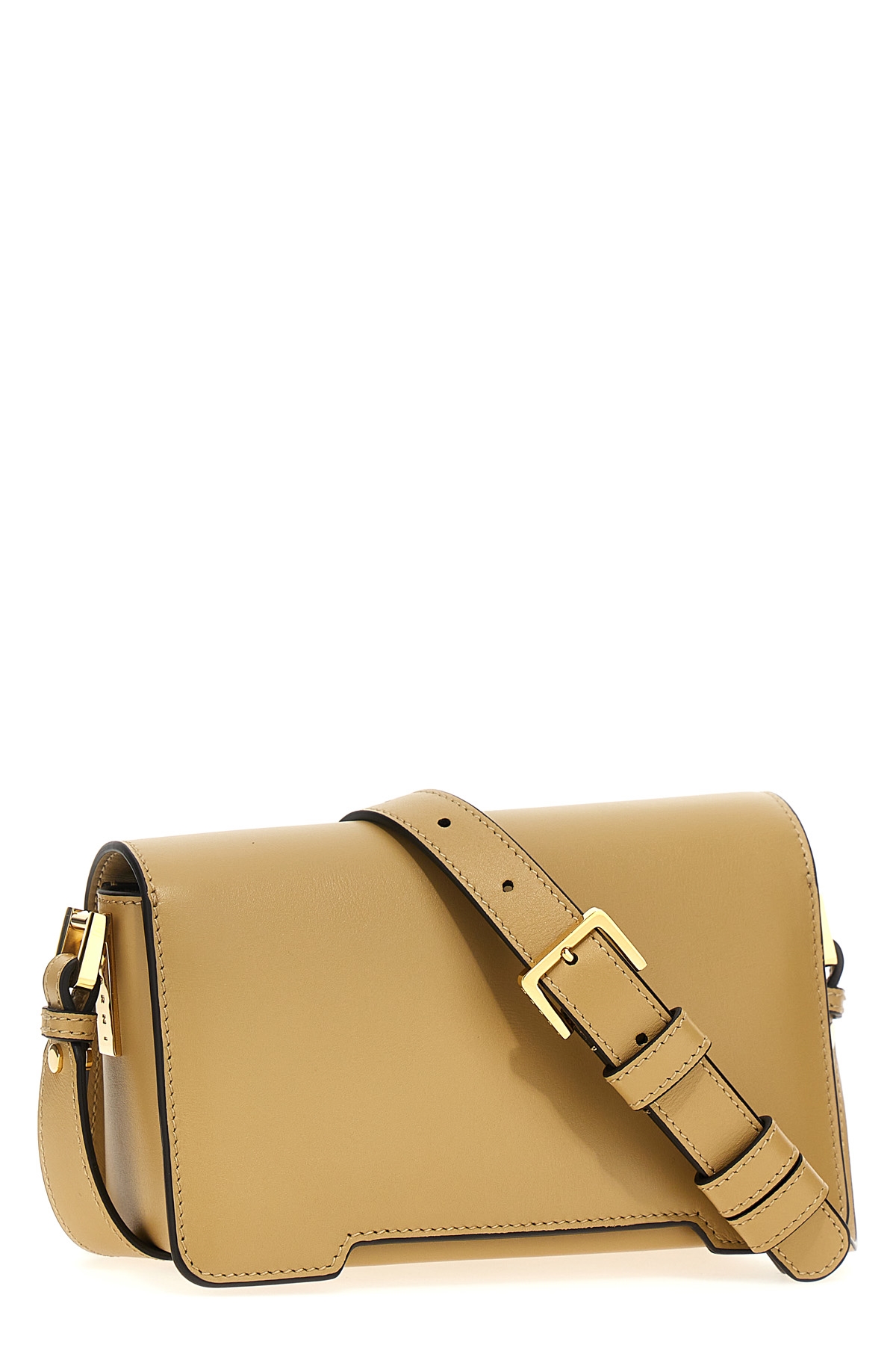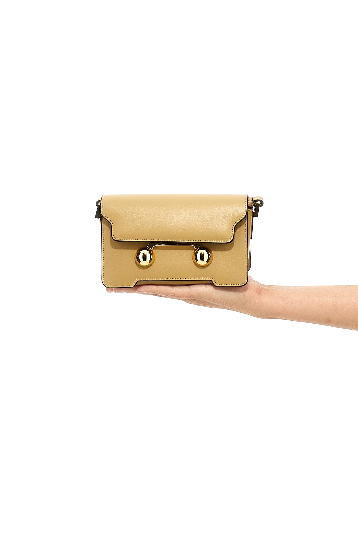 Trunkaroo mini leather shoulder bag with magnetic flap closure, front metal detail applique, and adjustable and removable shoulder strap.