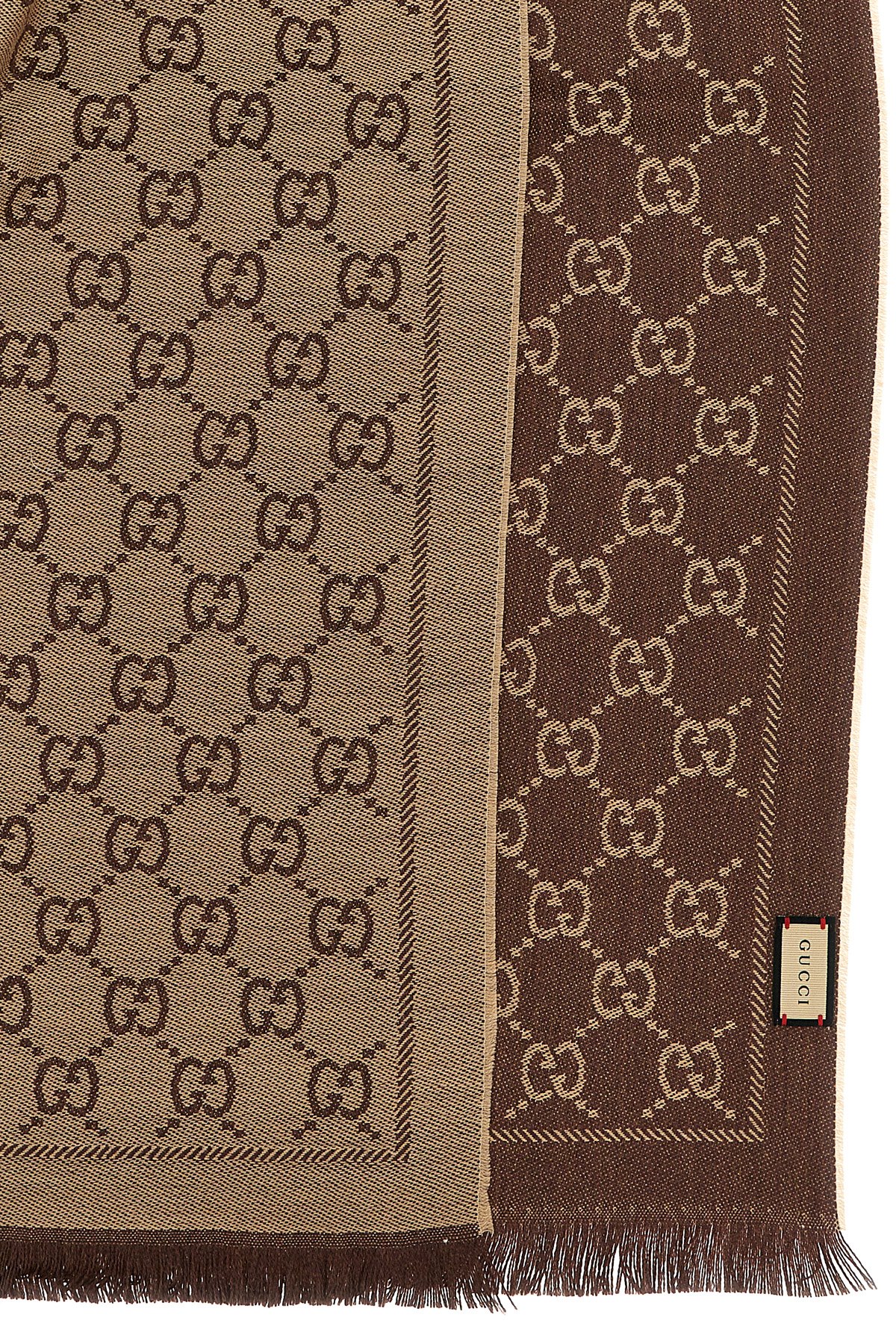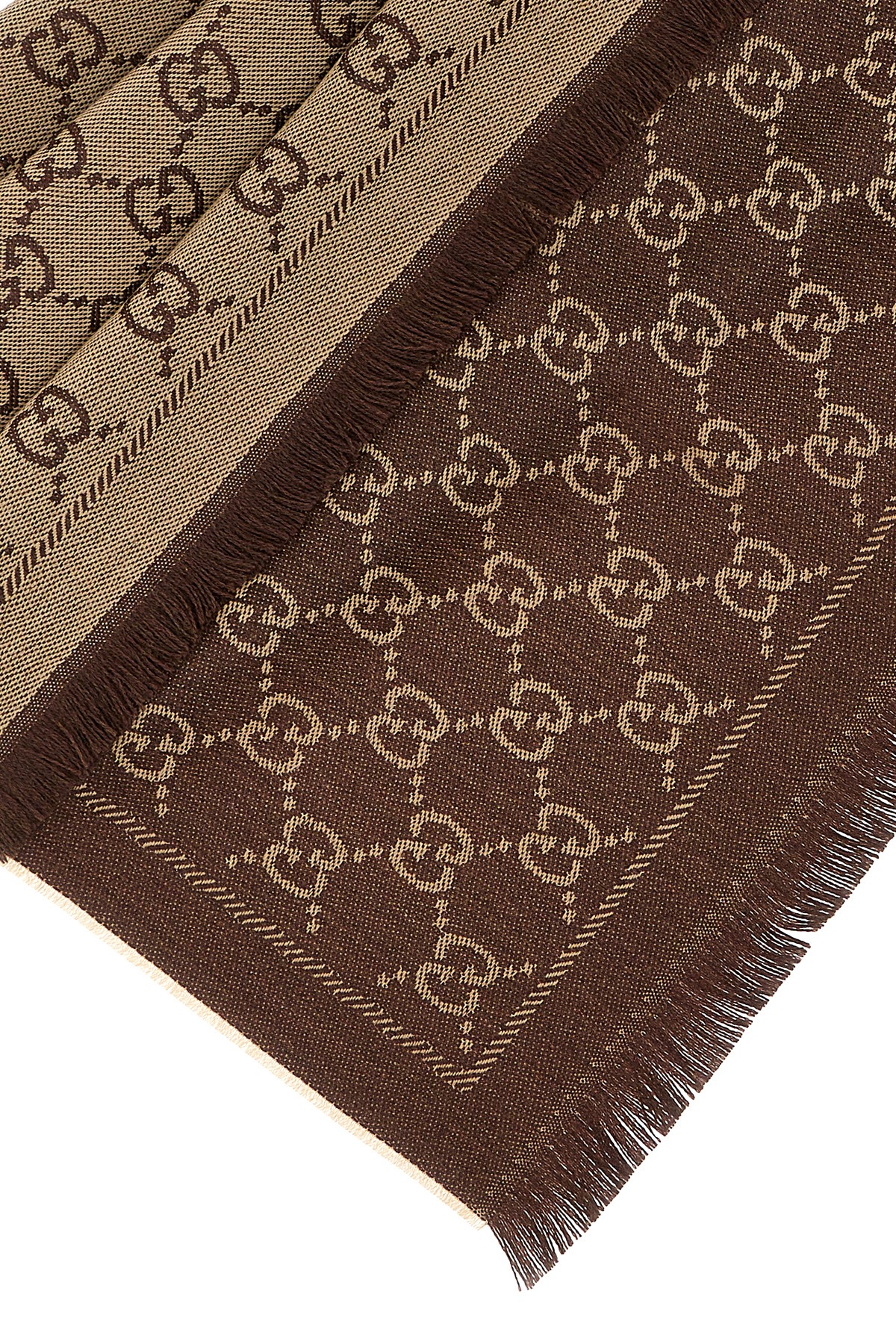 Wool scarf with all-over jacquard 'GG' logo pattern and fringed edges.