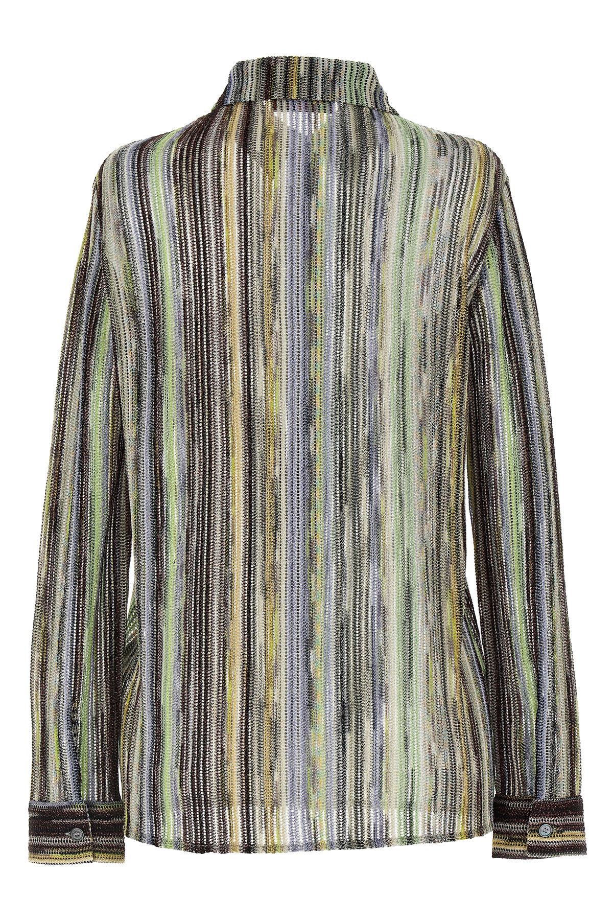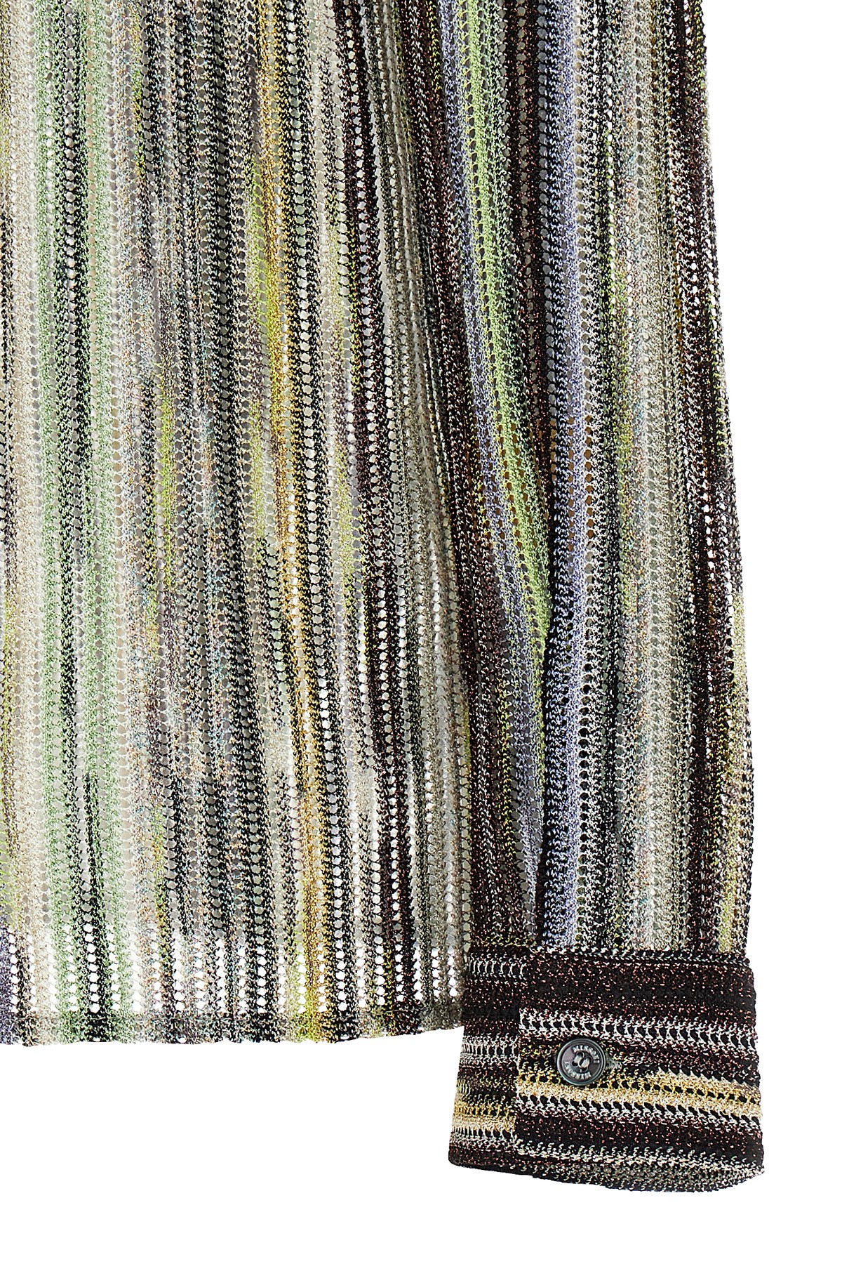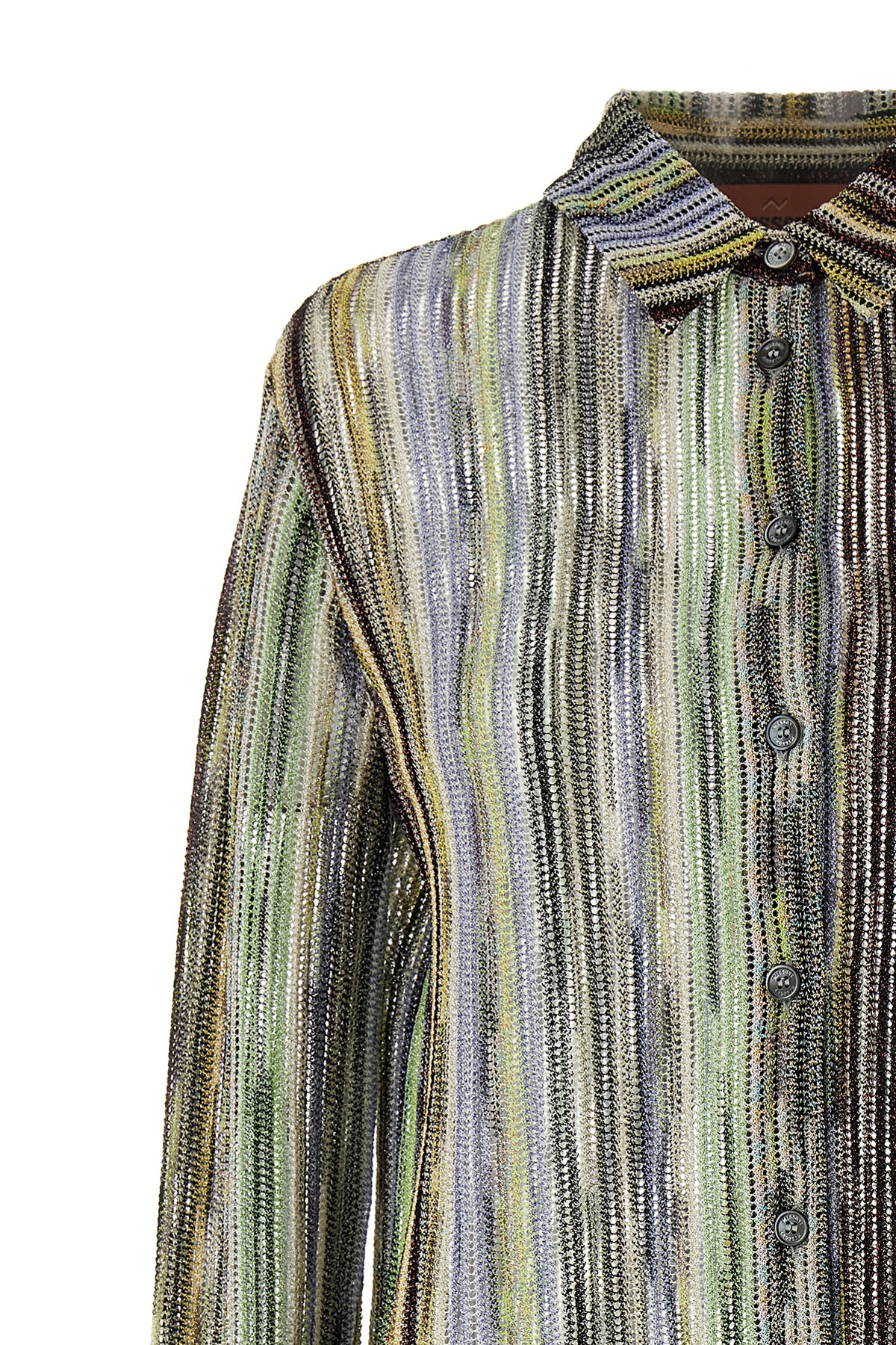 Lame flamed viscose shirt with striped raschel processing, button closure, long cuffed sleeves.