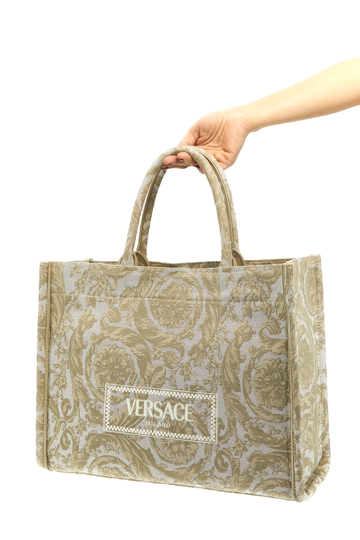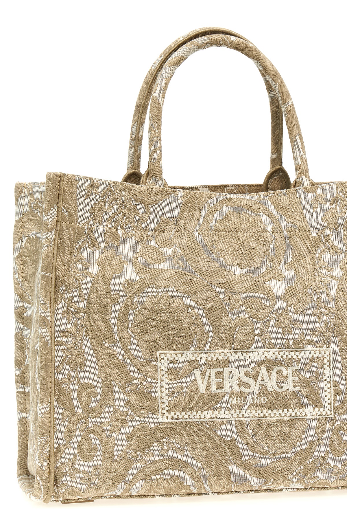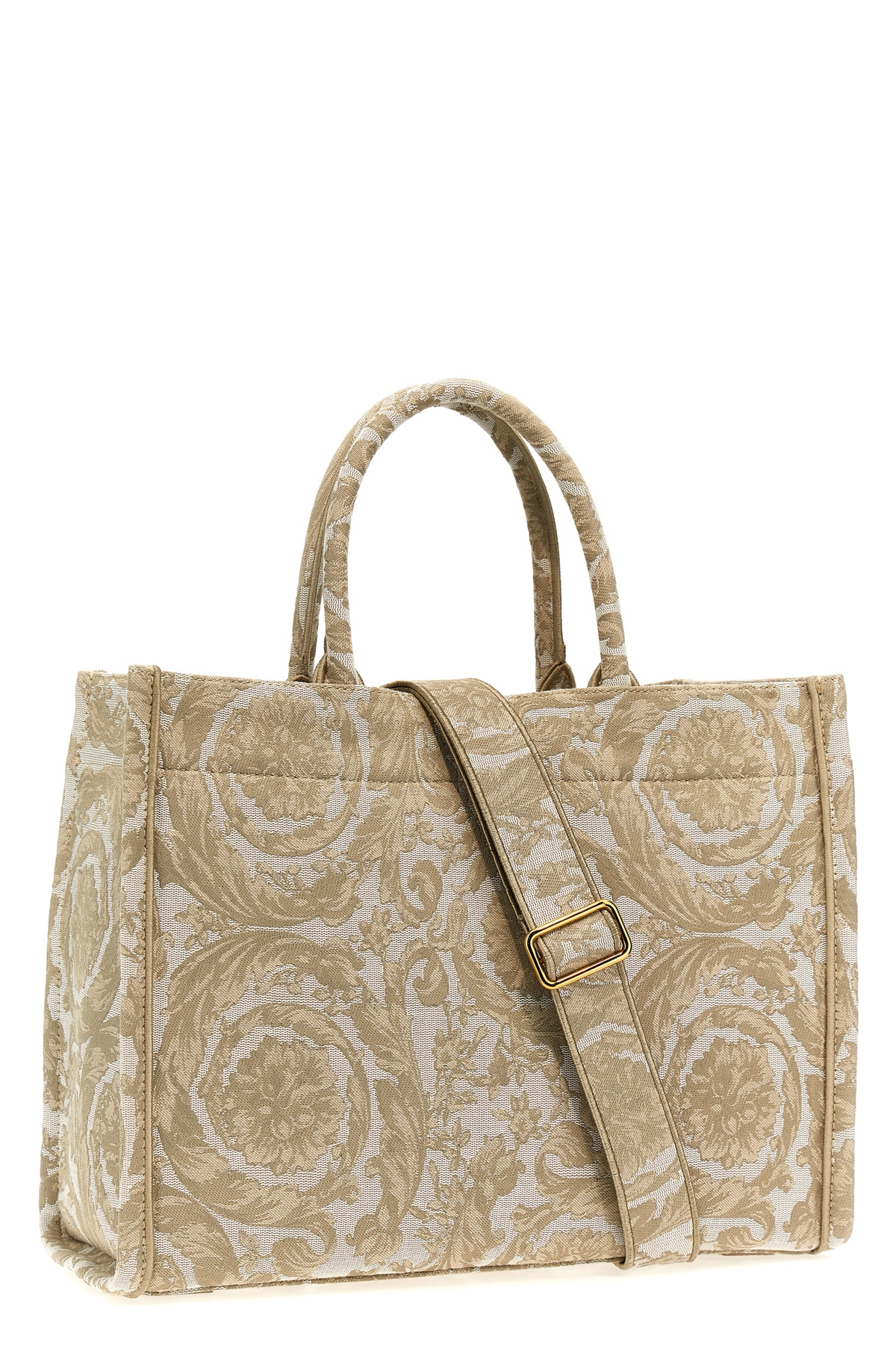'Athena Barocco' shopping bag in printed fabric, front logo, double handle, adjustable and removable shoulder strap.