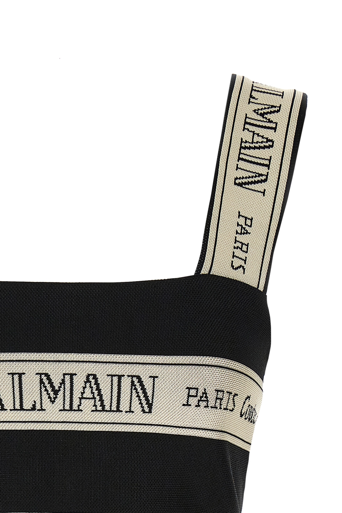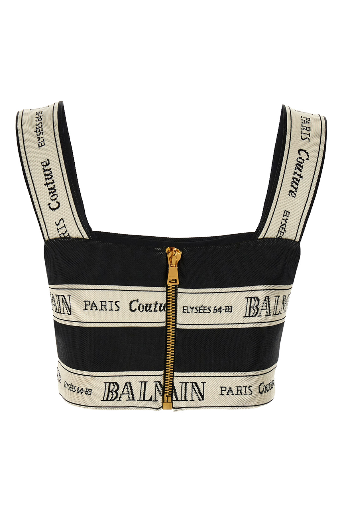Jacquard viscose blend top with 'Nastro Balmain' pattern, square neckline, wide shoulder straps, and back zip closure.