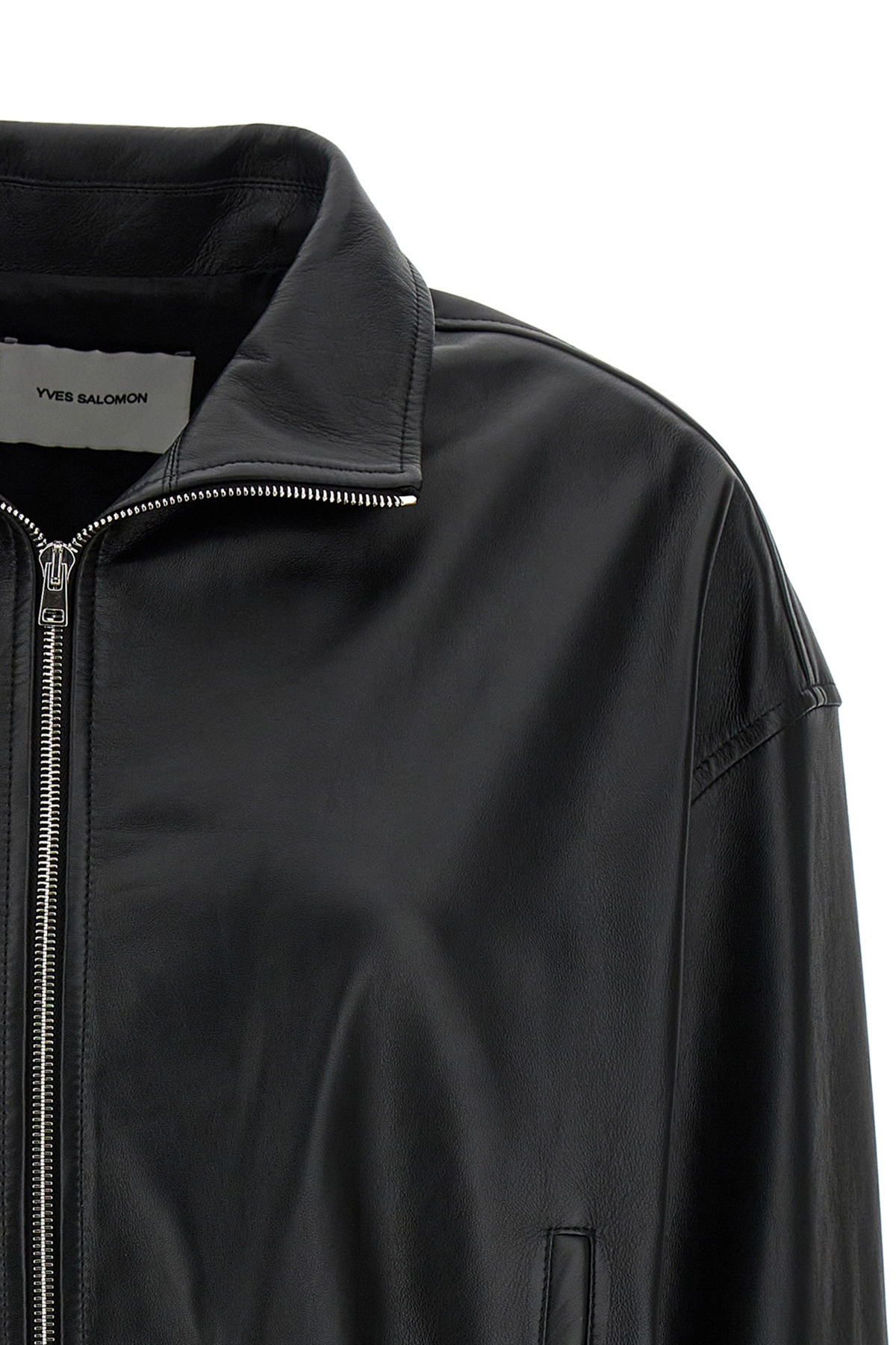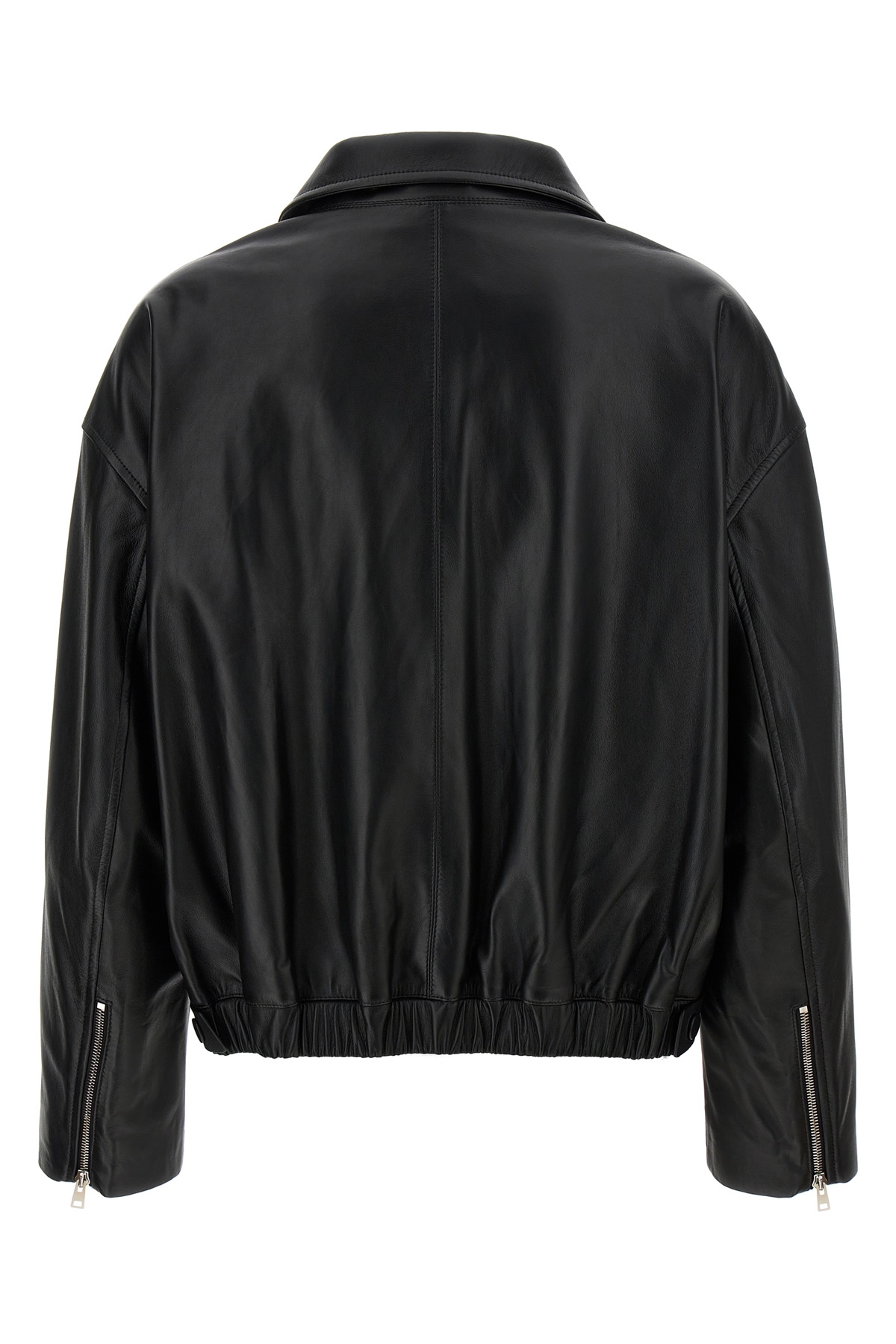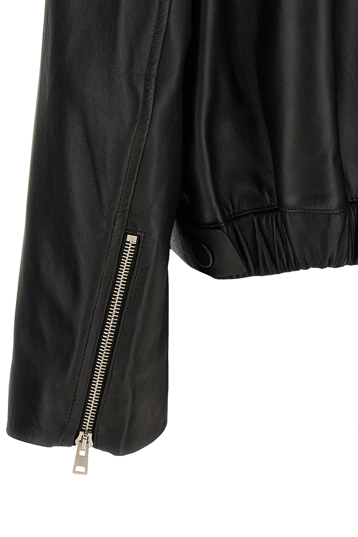 Leather bomber jacket, high neck, zip closure, pockets, long sleeves, elastic hem.