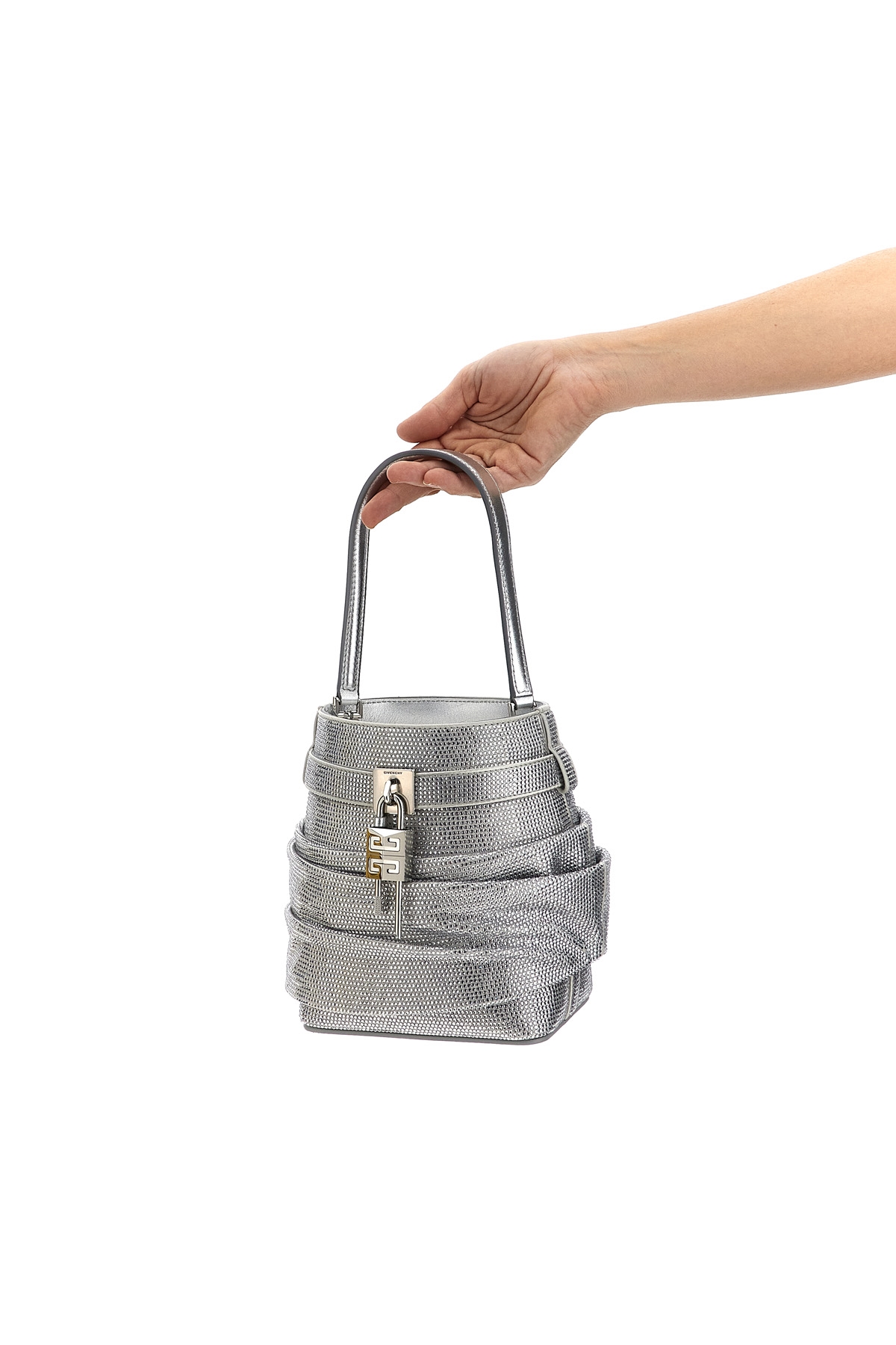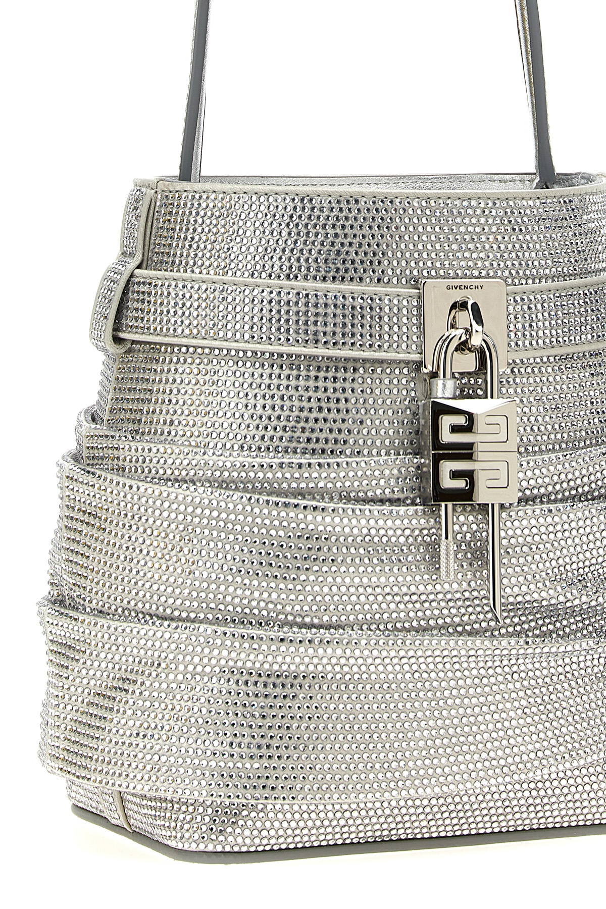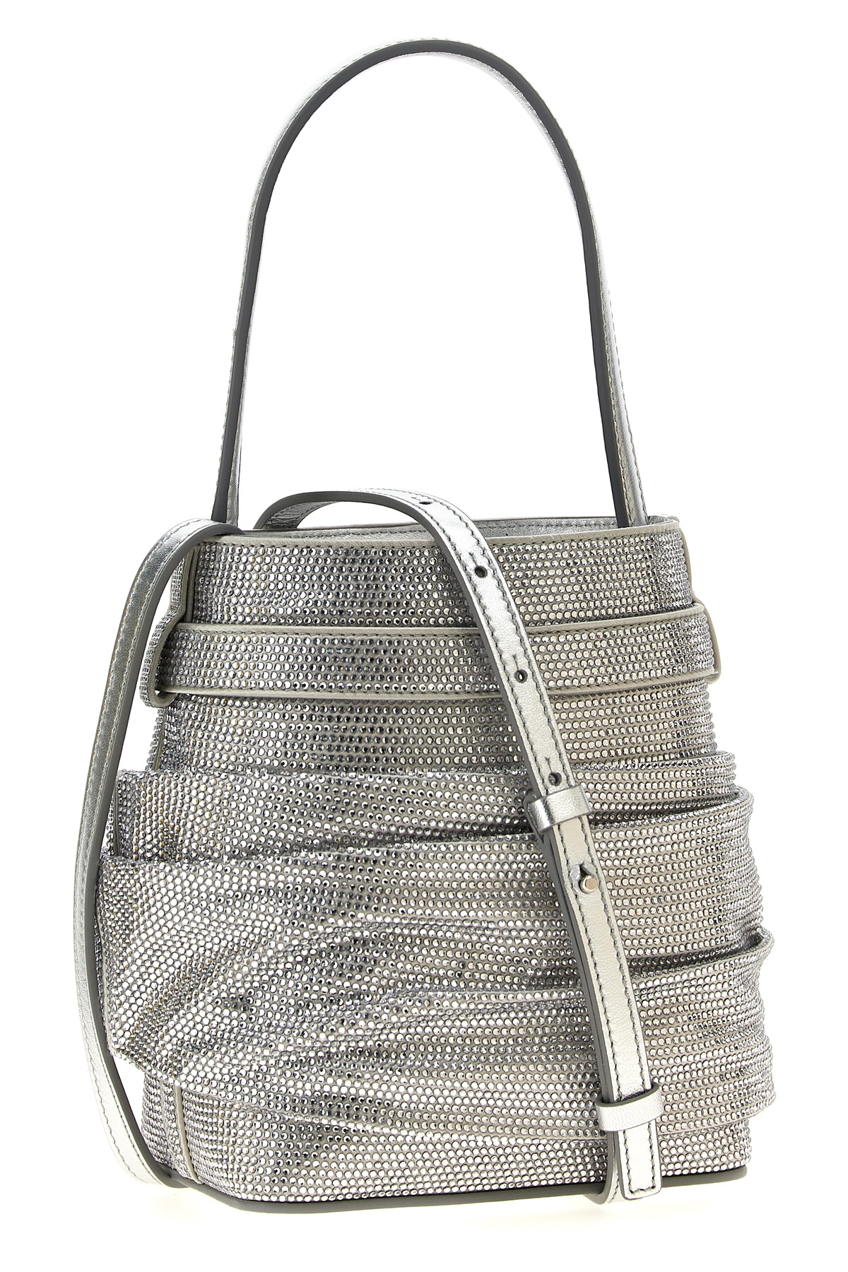 'Shark bucket Slouchy' all-over rhinestone bucket bag, front padlock with logo, removable handle and adjustable and removable leather shoulder strap.