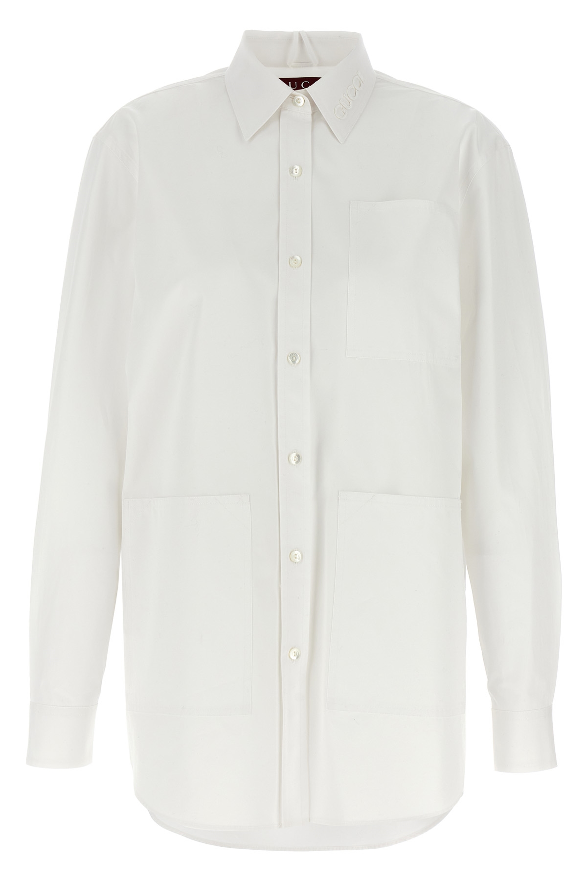 Cotton poplin shirt with tone-on-tone logo embroidery on the collar, button closure, pockets, long cuffed sleeves, and ribbon to tie at the neck.