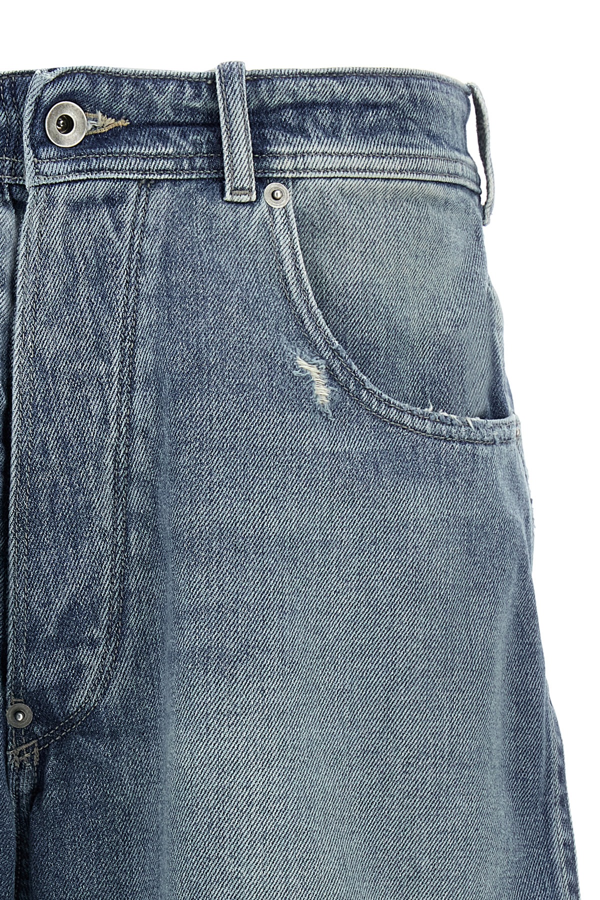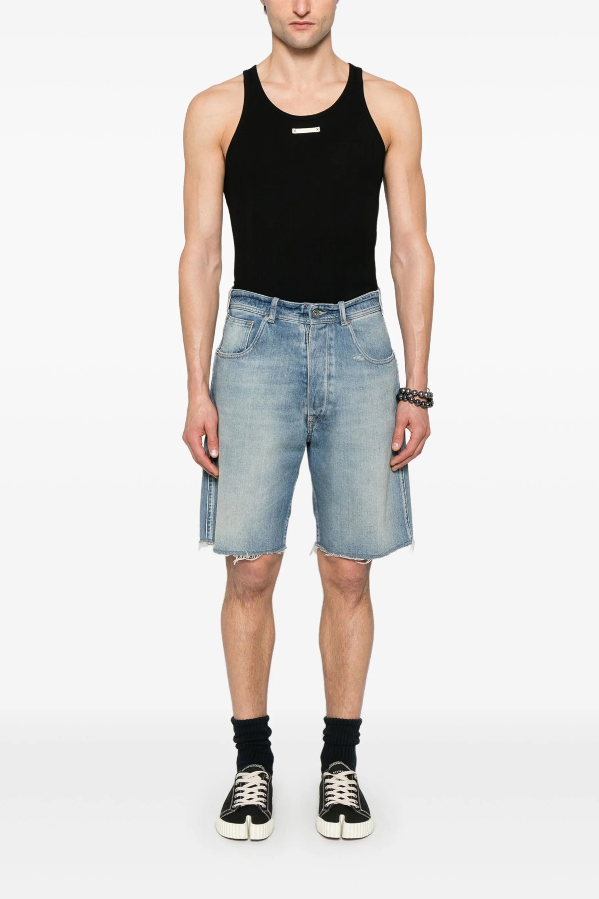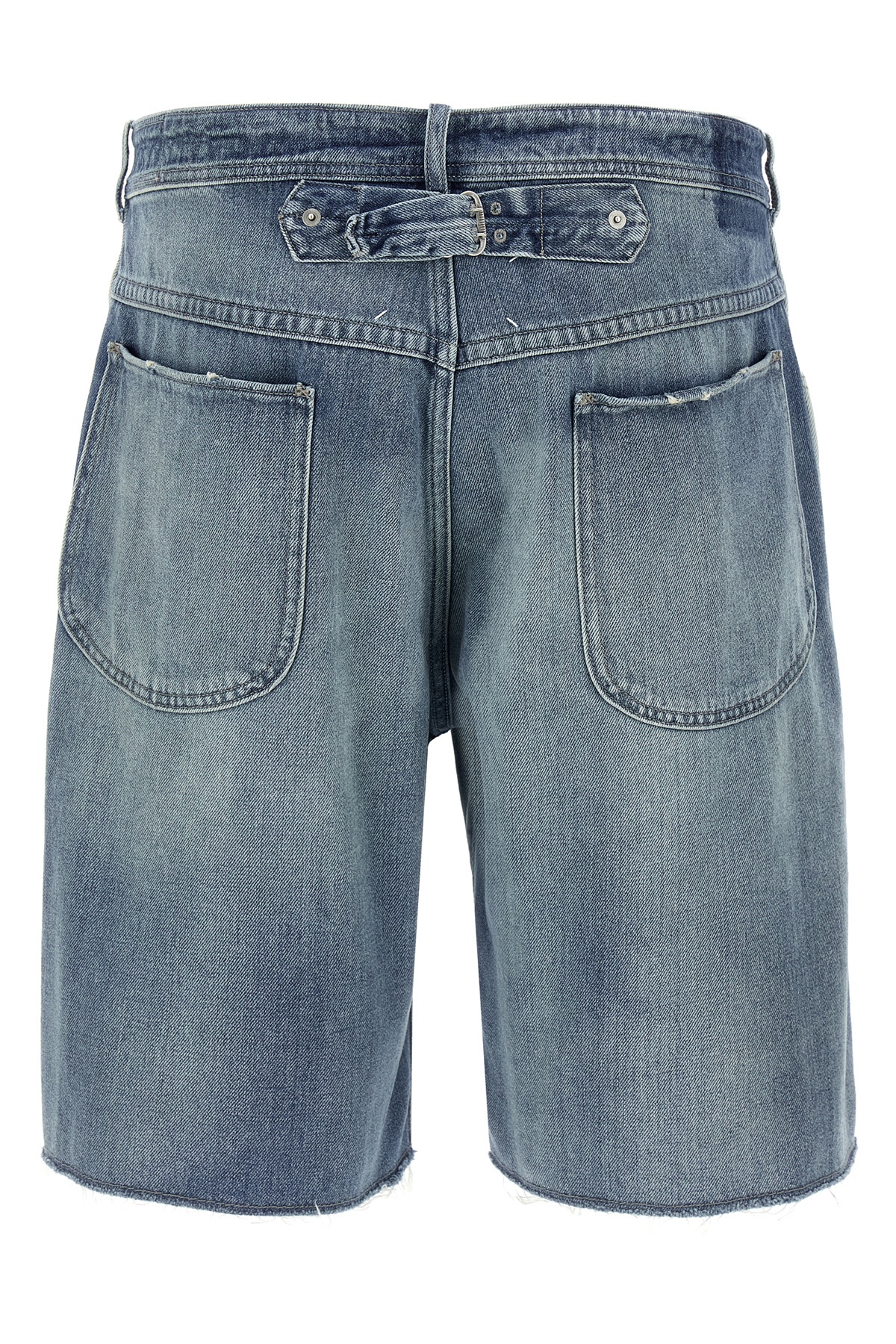 Stonewashed cotton denim bermuda shorts with five pockets, button closure, adjustable buckle strap at the back, raw cut hem.