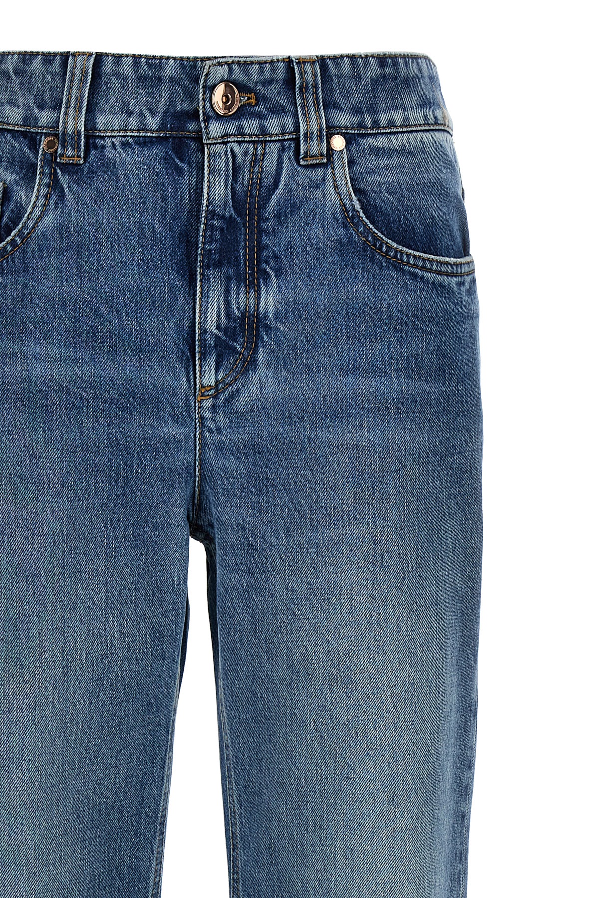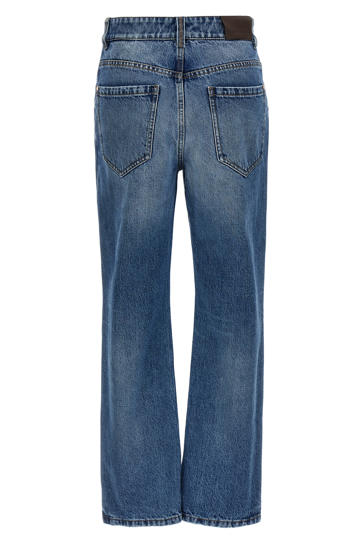 High-waisted cotton denim jeans with Monile detail at the back, straight leg, zip and button closure, five pockets, and leather logo tag.