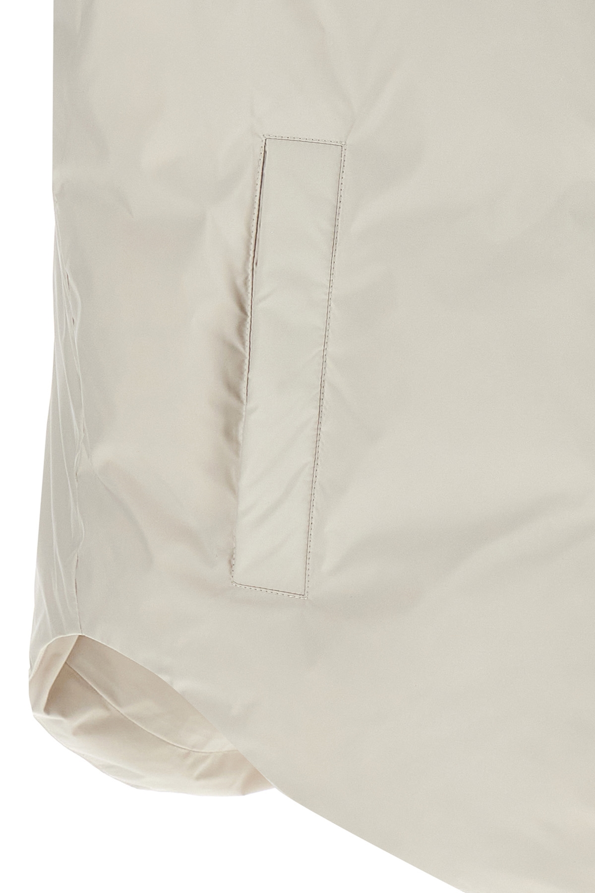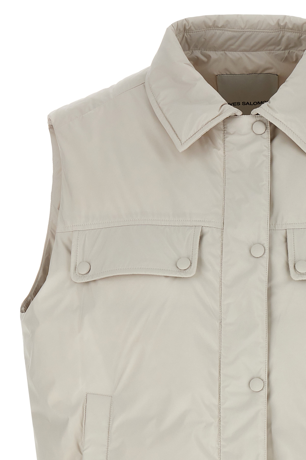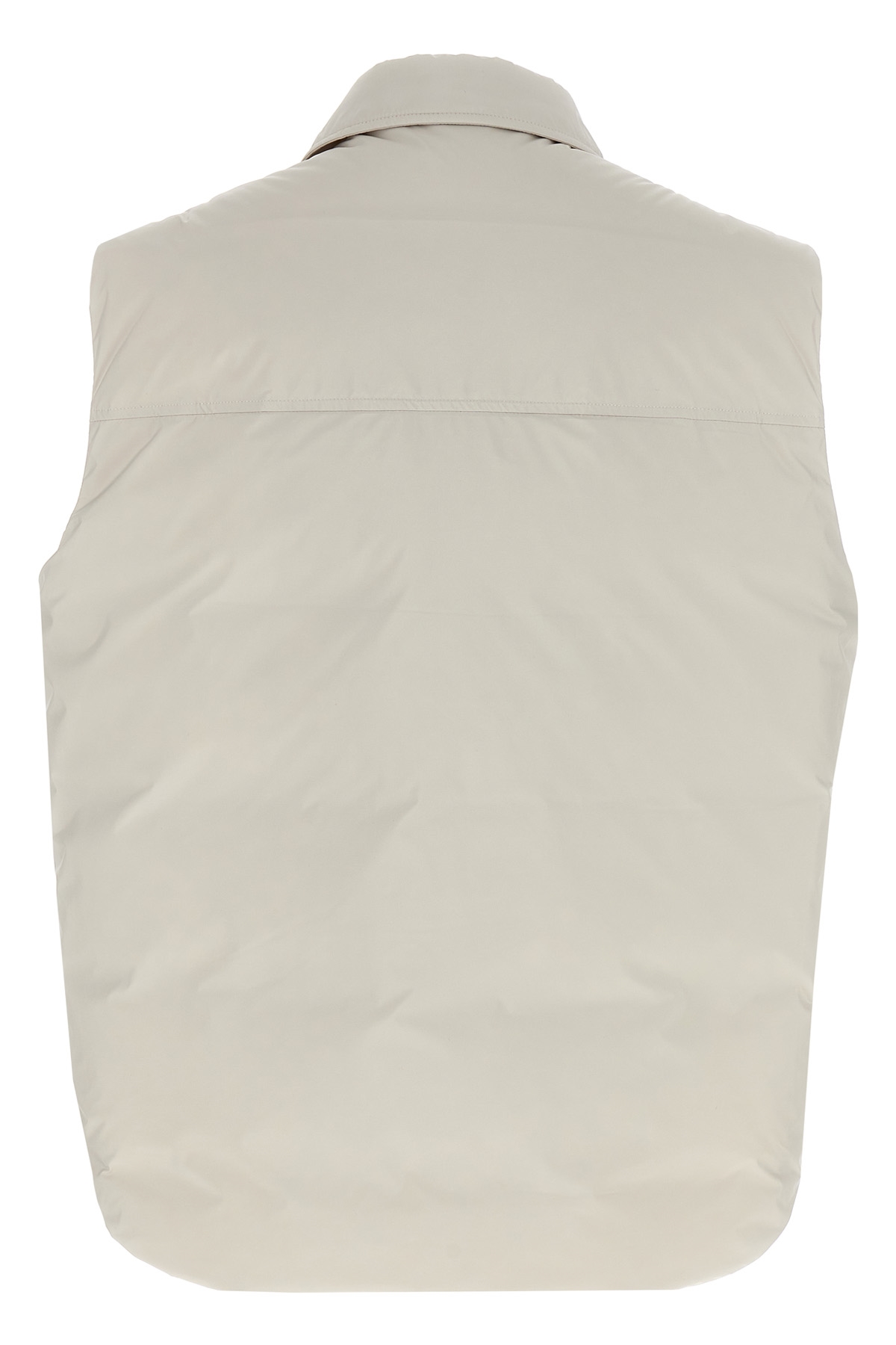 Vest in synthetic fabric with goose feather padding, collar, zip and snap button closure, pockets.