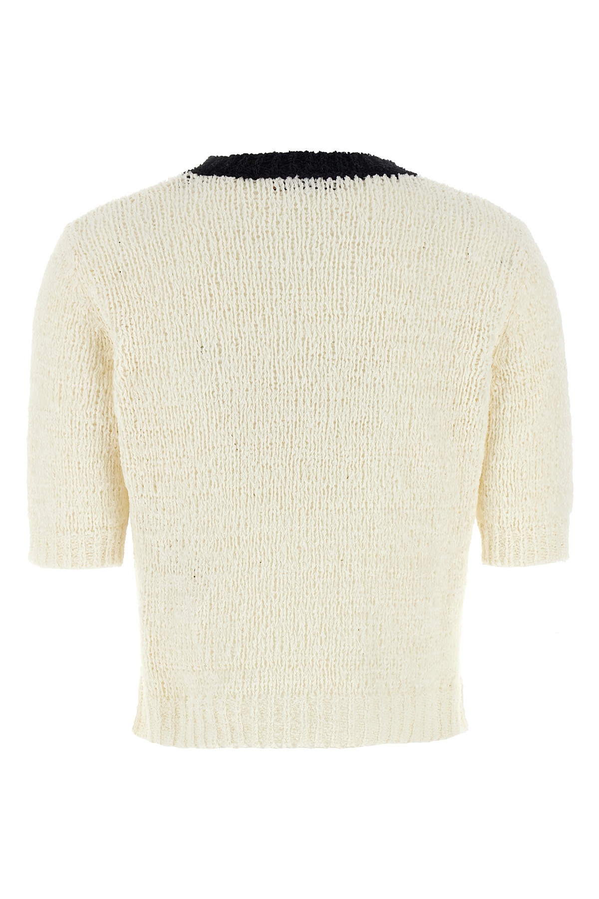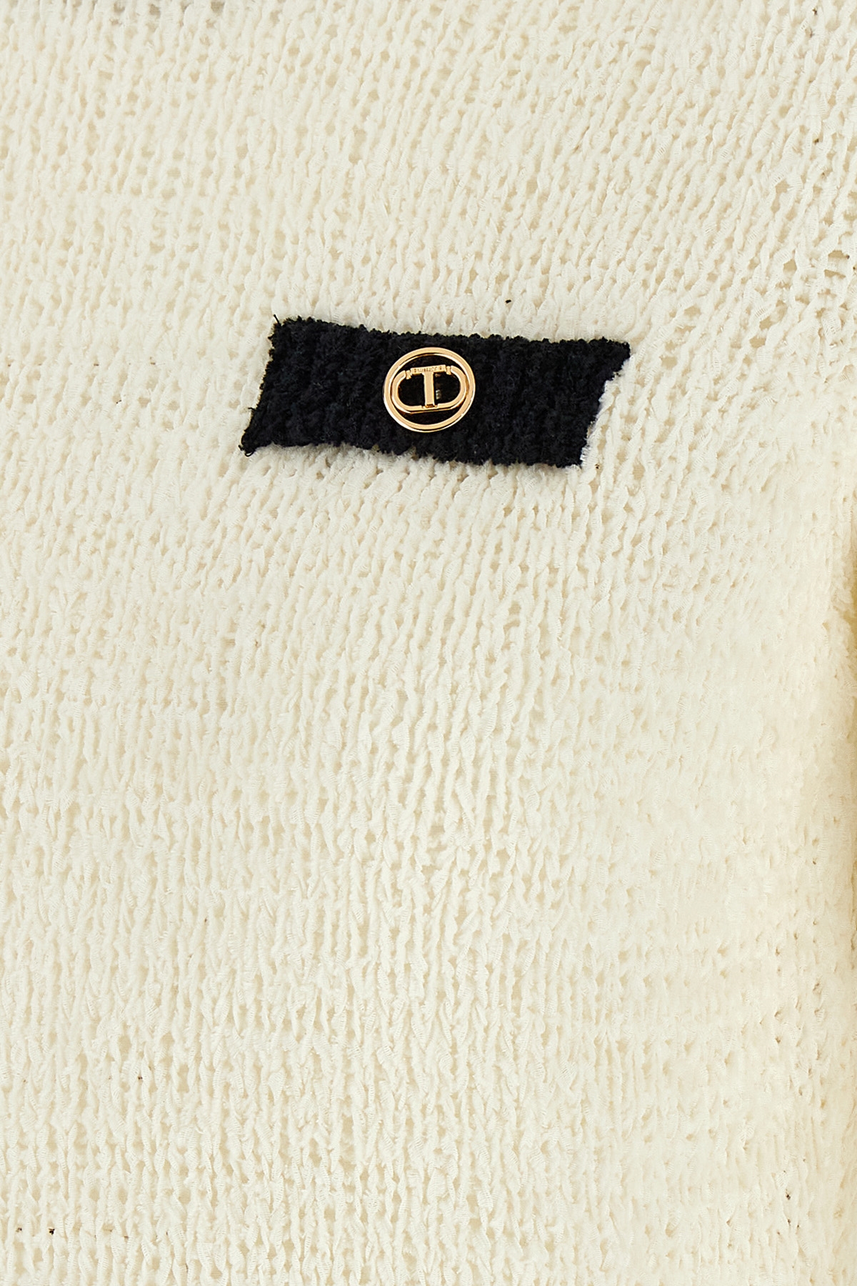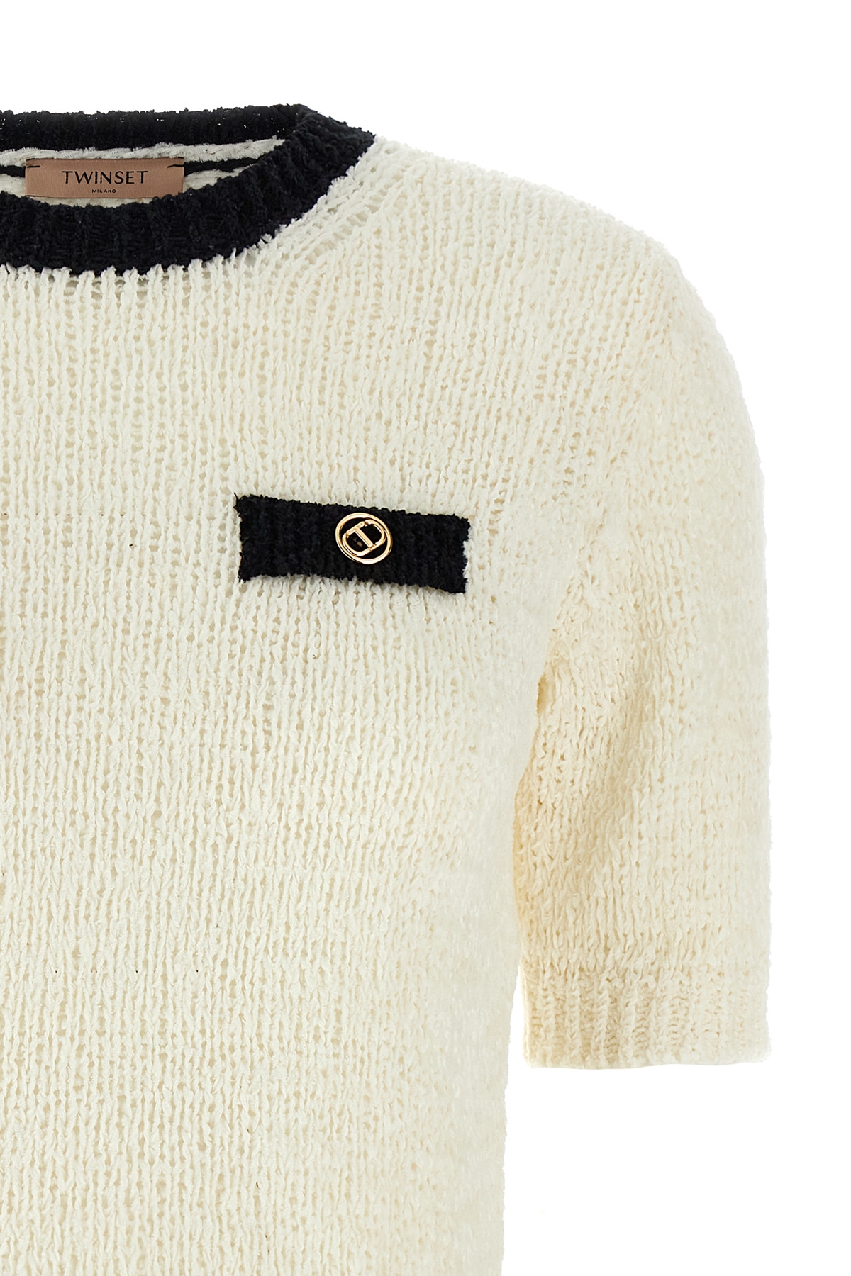 Cotton blend sweater with shaved pattern and contrasting details, trompe l'oeil pocket with 'Oval T' metal logo, crop model, crew neck, short sleeves.