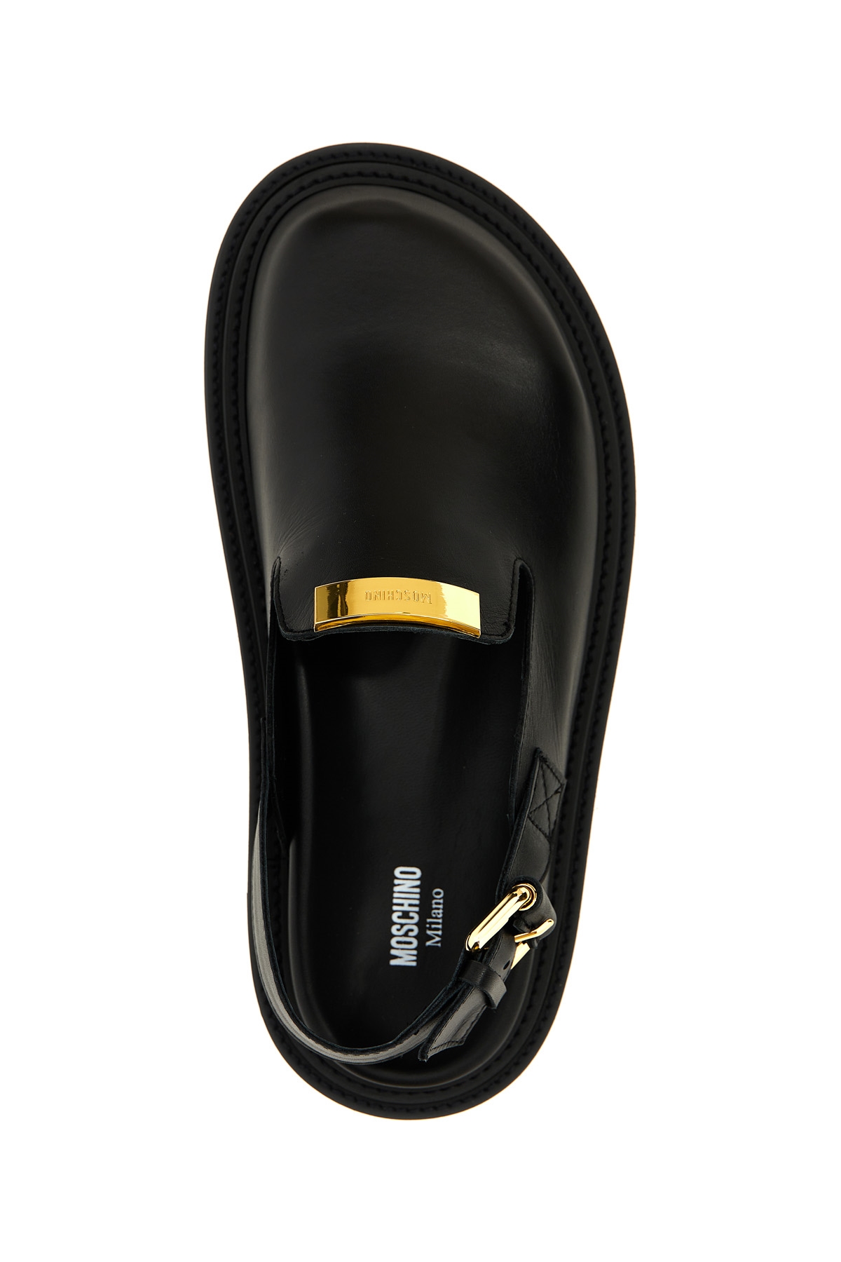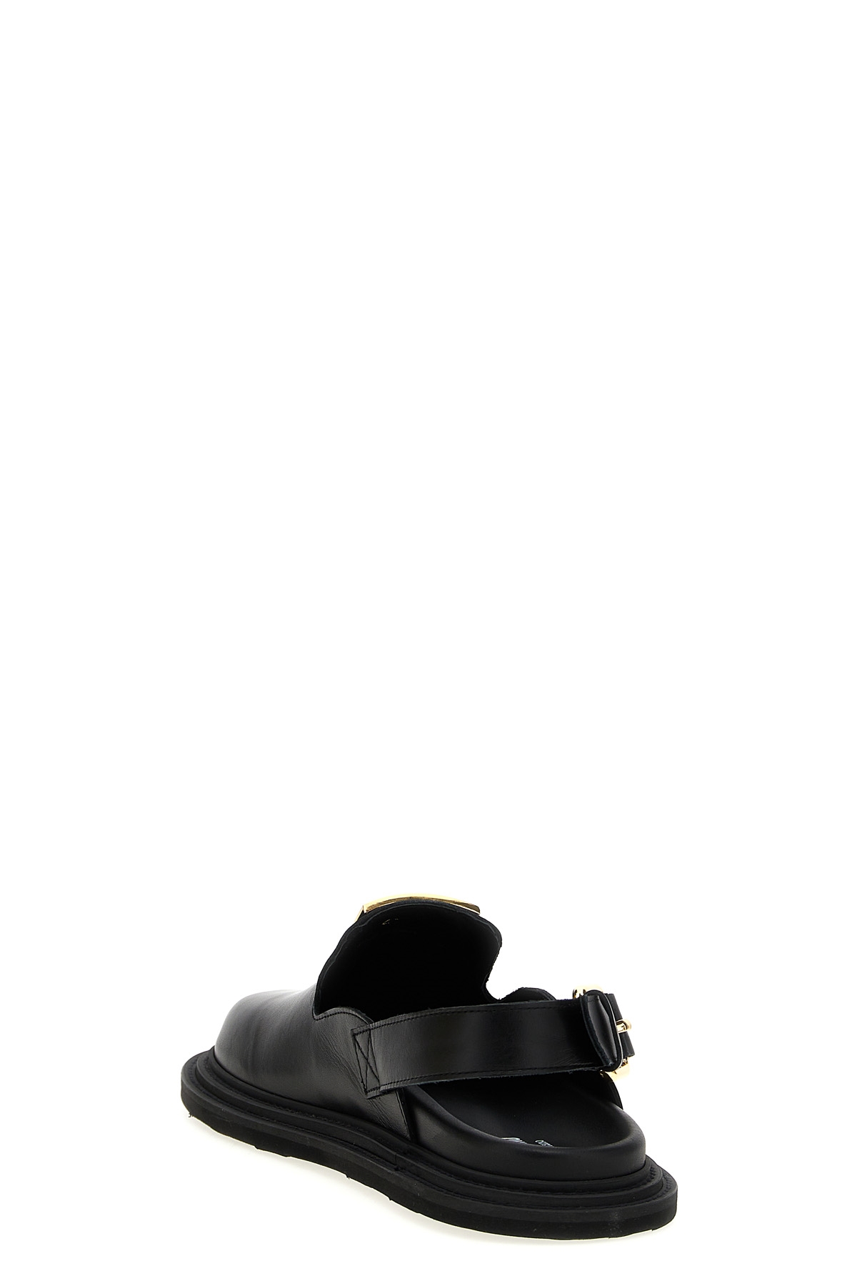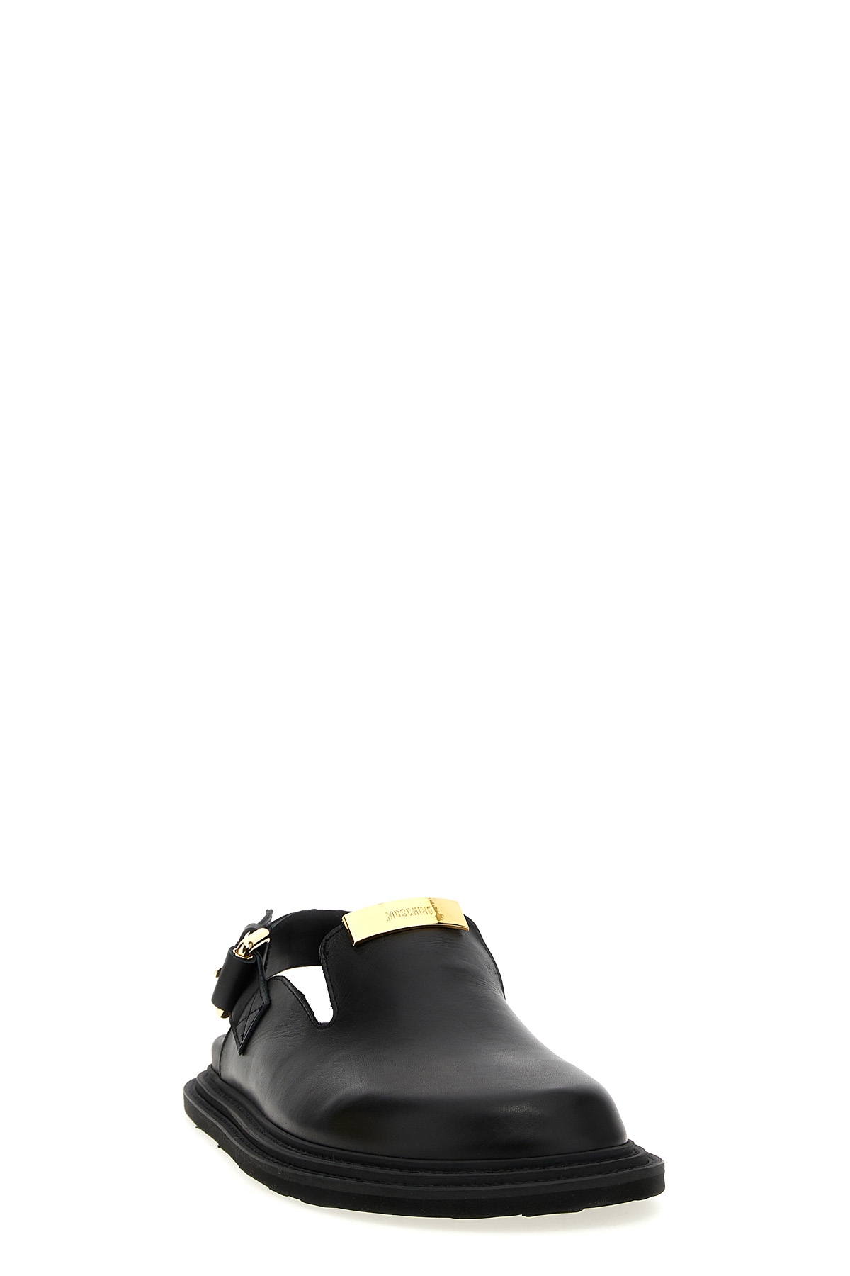 Leather sandals, front metal plate with logo, adjustable heel strap with buckle, leather insole, rubber sole with polka dot detail.