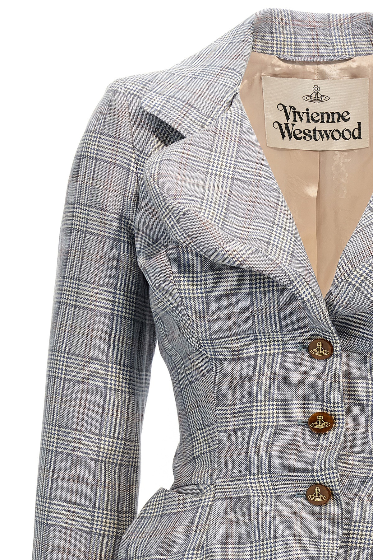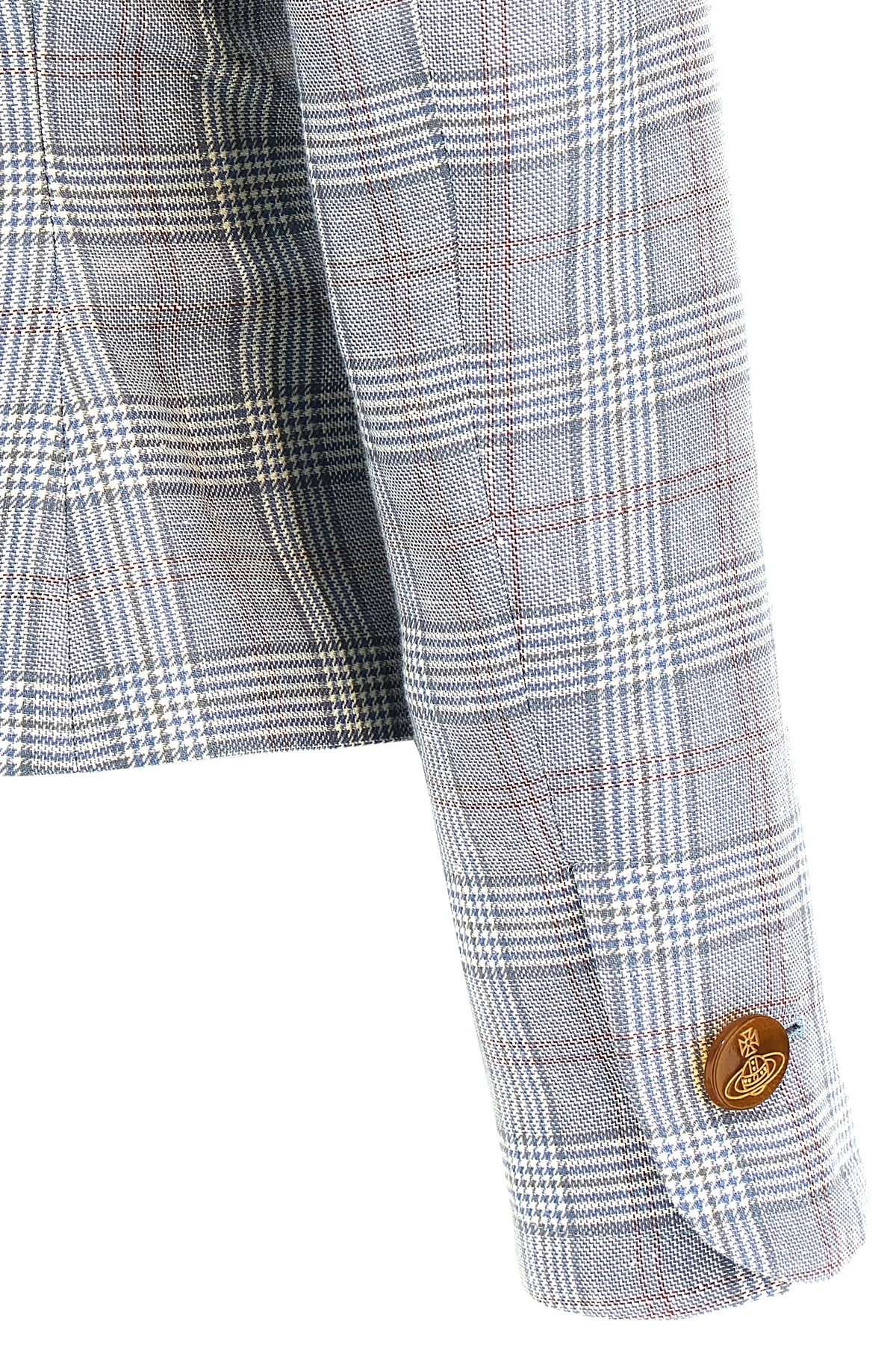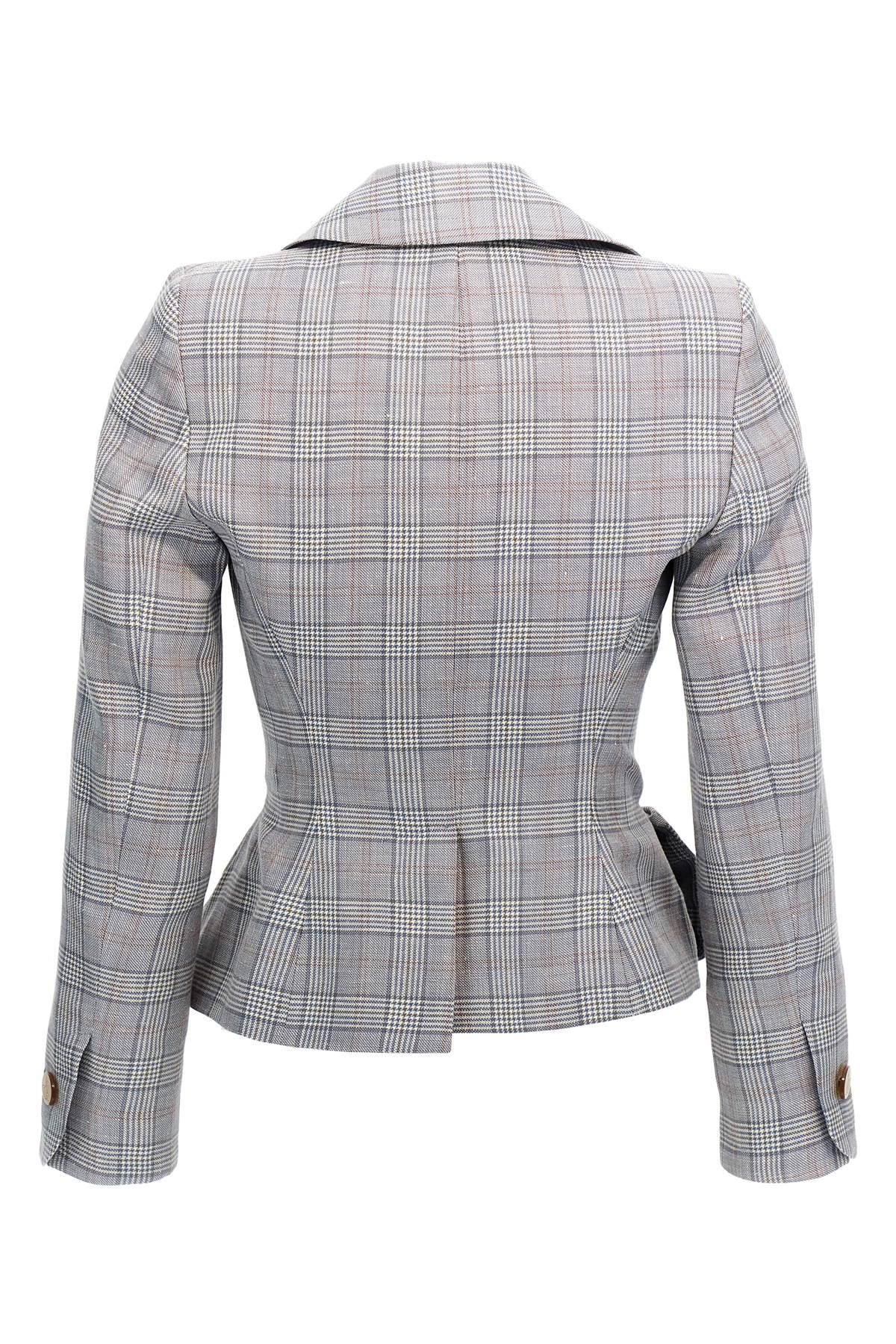 'Drunken' blazer in wool and linen blend with 'Principe di Galles' check print, slanted stitching and distorted silhouette, button closure, pockets, long sleeves, slightly padded shoulders.