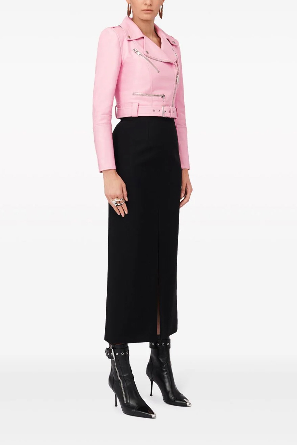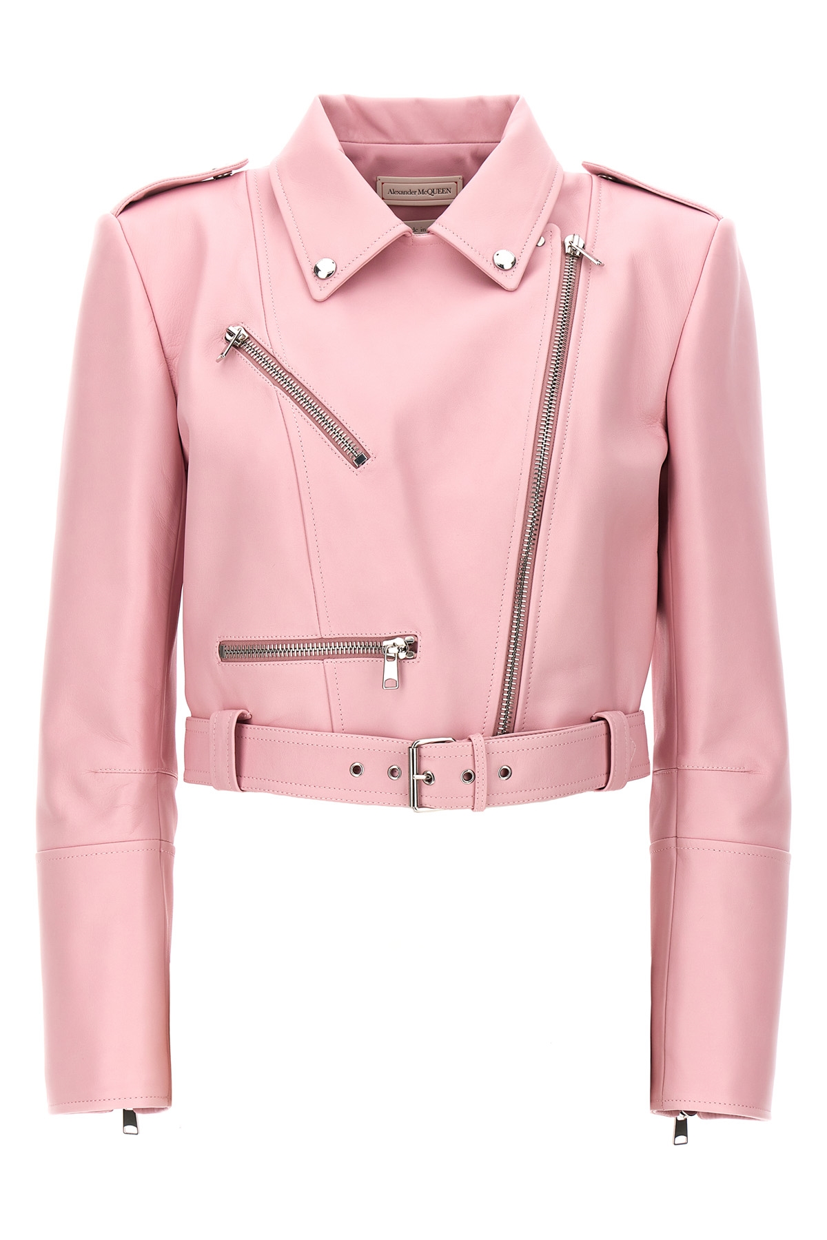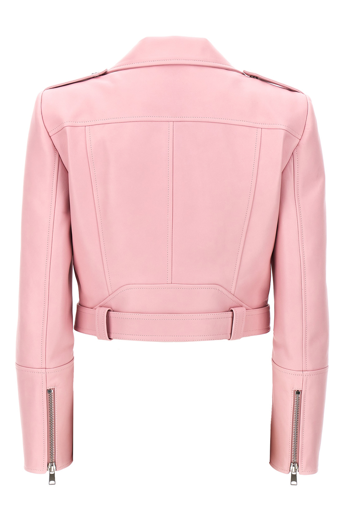 Crop leather biker jacket with peak lapels and off-center zip closure.