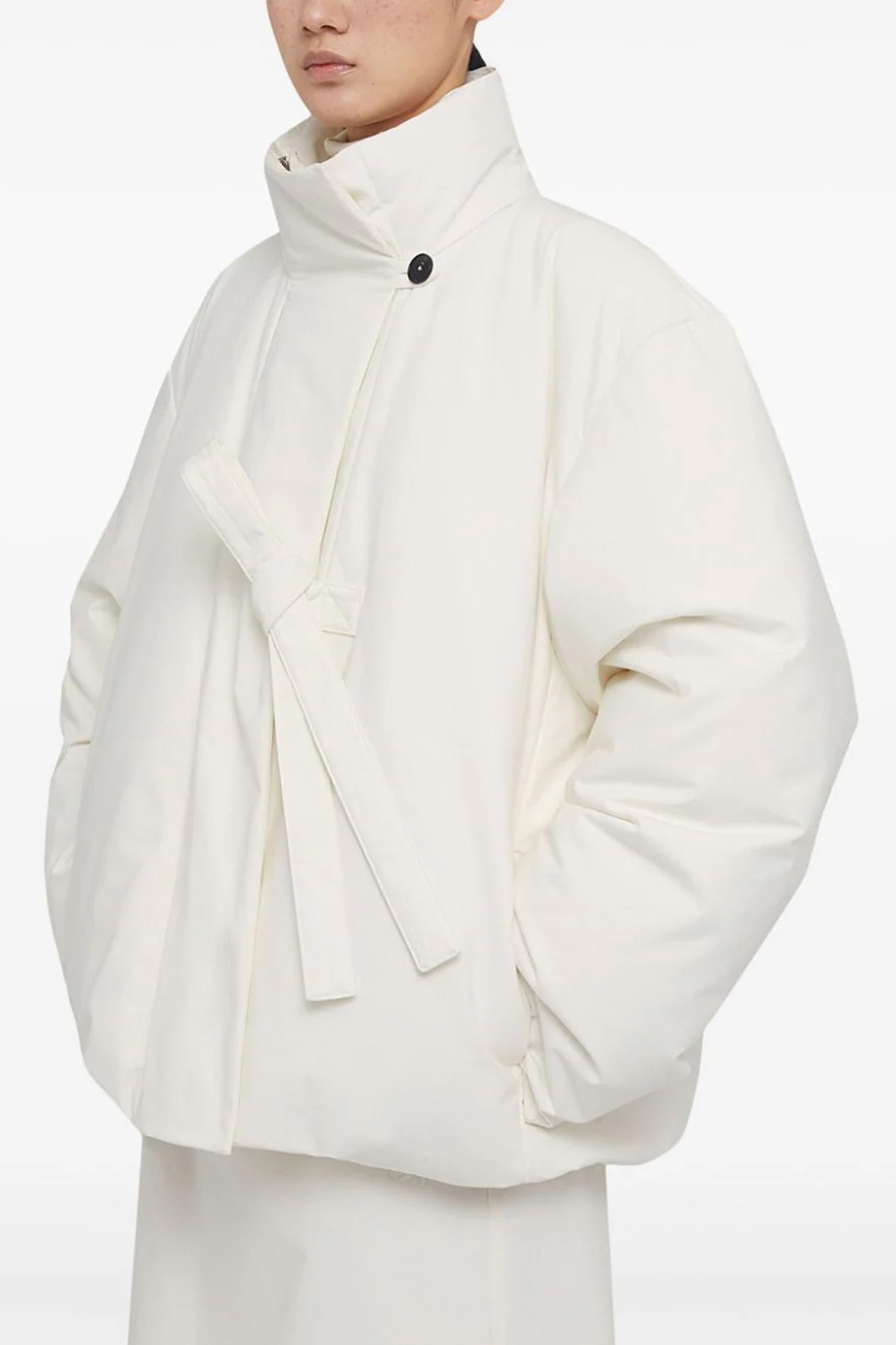 '155' cotton down jacket with zip and side ribbon closure, long sleeves, pockets, adjustable drawstring at the hem.