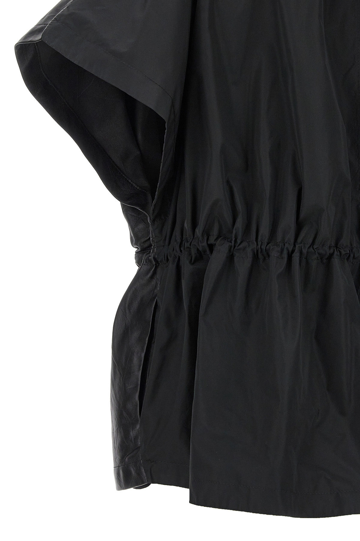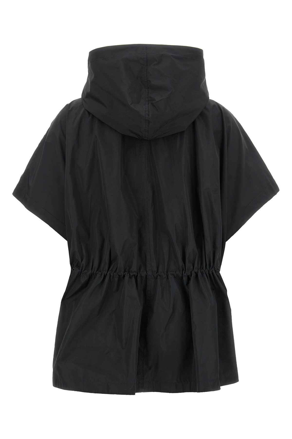 Leather hooded cape in cotton taffeta with adjustable drawstring at the waist, zip closure, and side pockets.