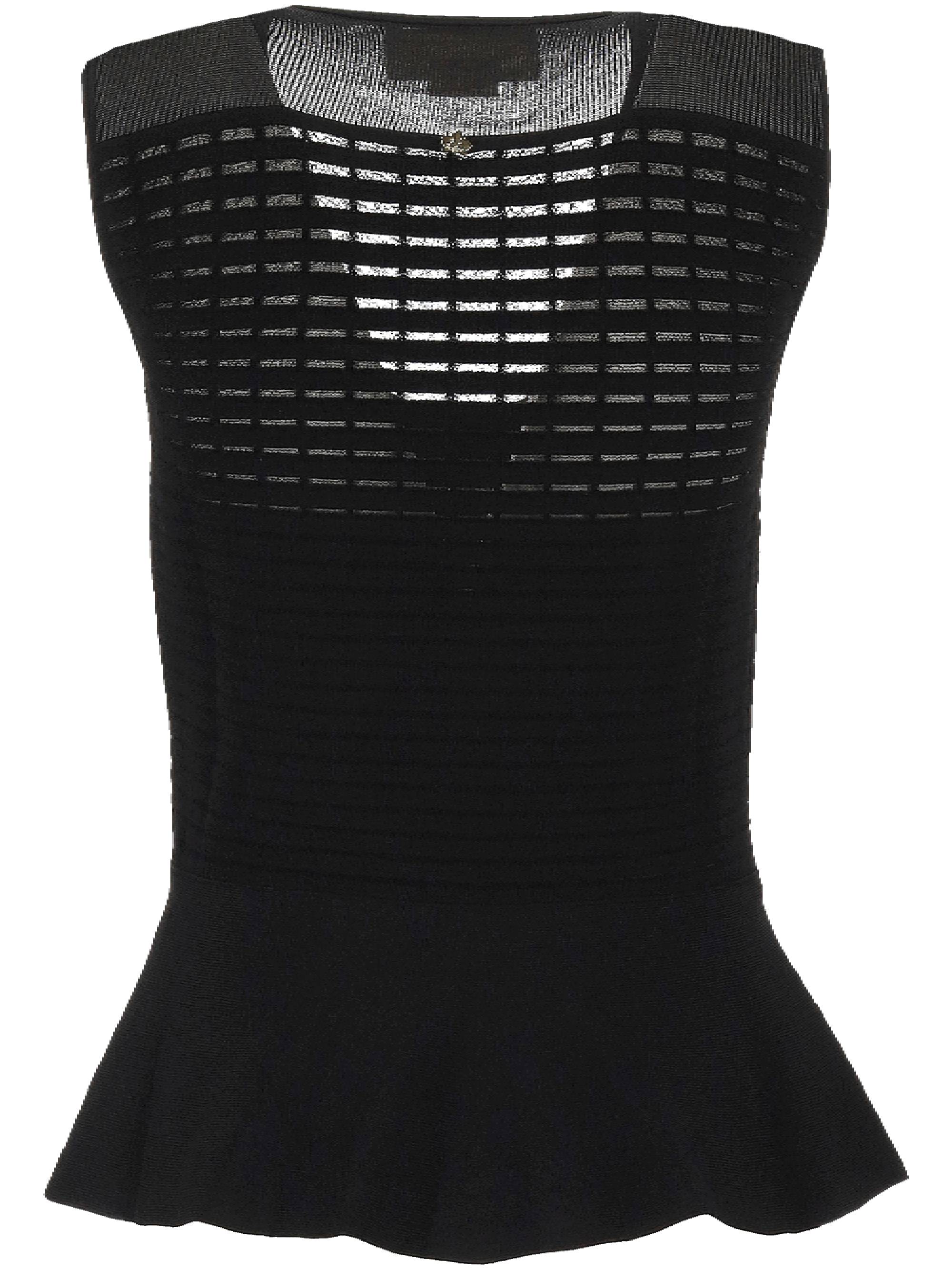 Sleeveless knit top embellished with the iconic Blockchain embroidery features a deep Uneckline and transparent details on the shoulders which give a touch of lightness to the design The tight fit follows the lines of the body up to the hips where it opens into a godet flounce that adds movement and femininity to the garment