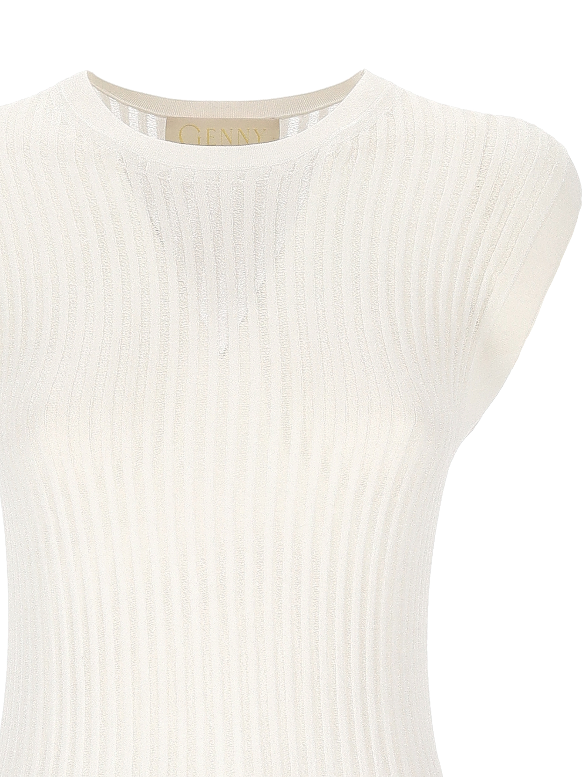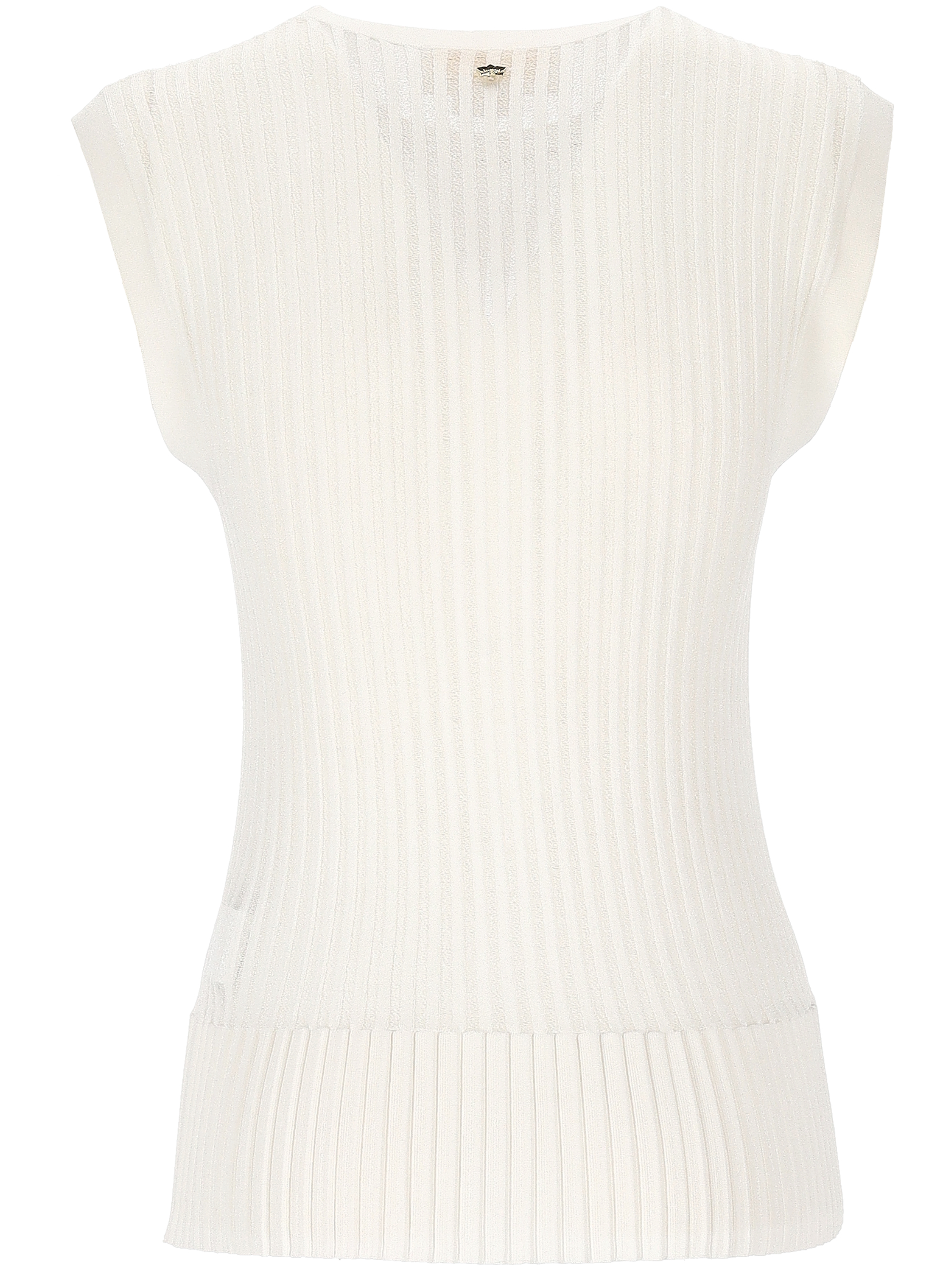 Sleeveless pleated knitted top elegant and refined design with round neckline and hip length The silhouette is shaped at the waist to flatter the figure while a flounce at the hem adds a sophisticated and modern touch Slim fit