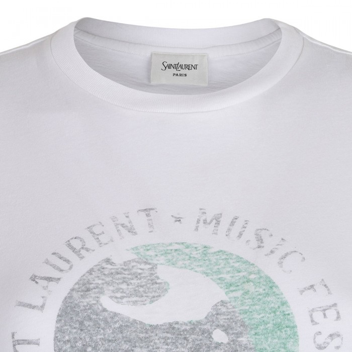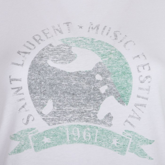 Off-white certified cotton T-shirt from Saint Laurent featuring 1961 Saint Laurent Music Festival print on chest, ribbed crew collar, short sleeves.
