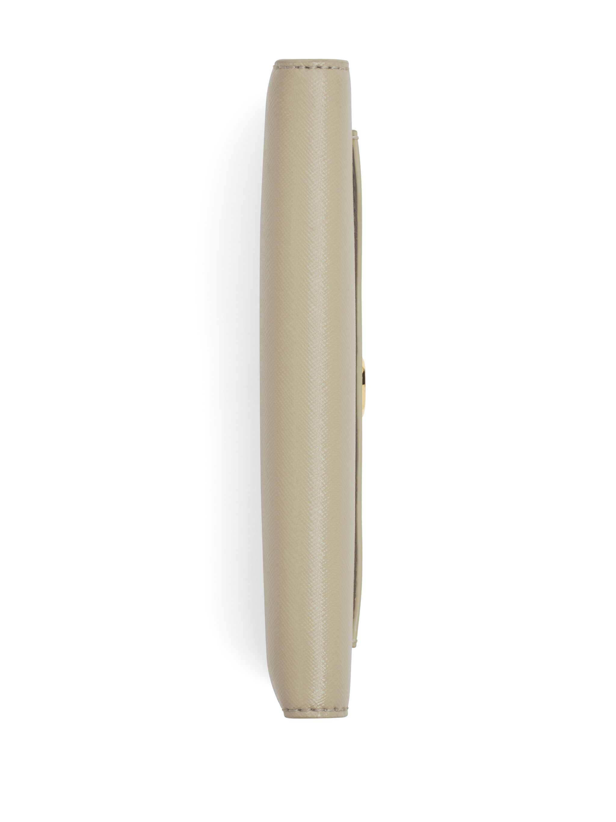 beige leather bifold design goldtone logo plaque single card slot internal zipfastening pocket internal note compartments internal card slots foldover top with pressstud fastening